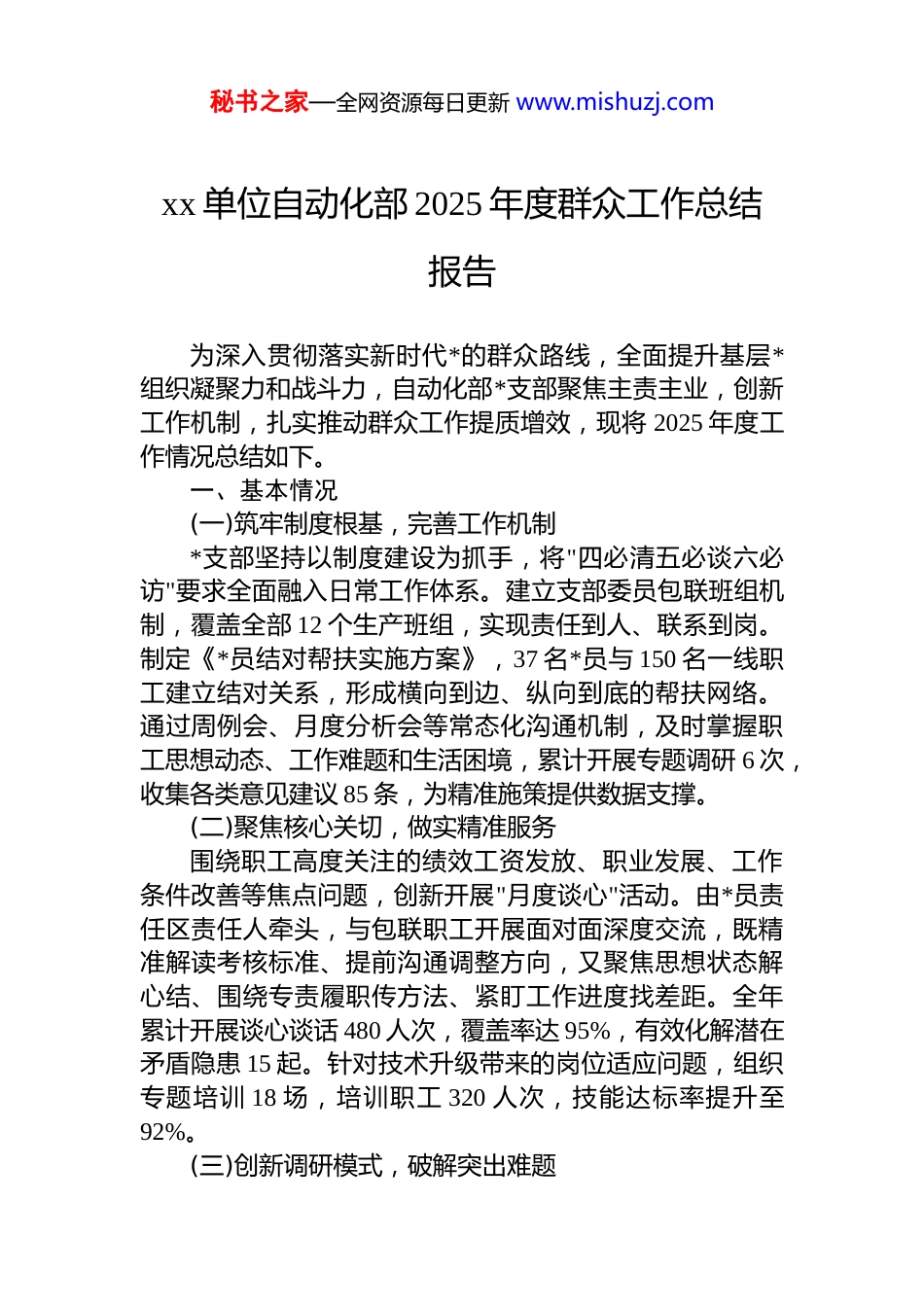 秘书之家—全网资源每日更新 www.mishuzj.comxx 单位自动化部 2025 年度群众工作总结报告为深入贯彻落实新时代*的群众路线,全面提升基层*组织凝聚力和战斗力,自动化部*支部聚焦主责主业,创新工作机制,扎实推动群众工作提质增效,现将 2025 年度工作情况总结如下。一、基本情况(一)筑牢制度根基,完善工作机制*支部坚持以制度建设为抓手,将"四必清五必谈六必访"要求全面融入日常工作体系。建立支部委员包联班组机制,覆盖全部 12 个生产班组,实现责任到人、联系到岗。制定《*员结对帮扶实施方案》,37 名*员与 150 名一线职工建立结对关系,形成横向到边、纵向到底的帮扶网络。通过周例会、月度分析会等常态化沟通机制,及时掌握职工思想动态、工作难题和生活困境,累计开展专题调研 6 次,收集各类意见建议 85 条,为精准施策提供数据支撑。(二)聚焦核心关切,做实精准服务围绕职工高度关注的绩效工资发放、职业发展、工作条件改善等焦点问题,创新开展"月度谈心"活动。由*员责任区责任人牵头,与包联职工开展面对面深度交流,既精准解读考核标准、提前沟通调整方向,又聚焦思想状态解心结、围绕专责履职传方法、紧盯工作进度找差距。全年累计开展谈心谈话 480 人次,覆盖率达 95%,有效化解潜在矛盾隐患 15 起。针对技术升级带来的岗位适应问题,组织专题培训 18 场,培训职工 320 人次,技能达标率提升至92%。(三)创新调研模式,破解突出难题秘书之家—全网资源每日更新 www.mishuzj.com构建"专项+周期"双轨调研机制。专项调研方面,针对职工反映集中的设备老化、作业环境改善等问题,组建 3 支*员攻坚小组,牵头完成自动化控制系统升级、作业现场照明改造等重点项目 6 项,累计投入改造资金 280 万元。周期调研方面,每季度组织*员对结对帮扶群众开展走访调研,建立诉求台账,实行销号管理。调研结果在*员大会集中汇报、逐条议定解决方案,形成"收集-分析-解决-反馈"的闭环管理机制,确保职工诉求件件有回应、事事有着落。(四)工作成效显著,群众满意度提升通过一系列务实举措,*支部群众工作质效实现全面提升。数据显示,月度谈心推行后,绩效相关咨询量下降50%,职工思想波动率控制在 1%以内,部门工作协同效率提升 30%。截至目前,已收集并解决职工诉求 19 件,涵盖技术培训、工作条件改善、生活困难帮扶等多个方面,解决率 100%,群众满意度达 96%。*员责任区作用充分发挥,受助职工主动担当作为,牵头完成技术优化项目 8 项,攻克作业效率瓶颈 3 个,为自动化攻关项目高效推进提供了坚实保障。二、存在问题(一)制度建设仍需完善虽然建立了较为完善的工作机制,但在执行过程中仍存在短板。部分制度条款针对性不够强,与实际工作结合不够紧密,存在制度与执行"两张皮"现象。例如,"四必清五必访"要求在部分班组落实不到位,存在形式化倾向,实际效果未达到预期。考核评价体系不够科学,对群众工作成效的量化评估指标设置不够合理,难以真实反映工作质量。(二)服务精准度有待提升现有服务模式仍以普惠性为主,针对不同群体、不同需求的个性化服务供给不足。年轻职工关注职业发展、技能提升,而老职工更关心医疗保障、退休待遇,差异化服秘书之家—全网资源每日更新 www.mishuzj.com务策略不够明确。部分帮扶措施存在"一刀切"现象,如技能培训内容与岗位实际需求匹配度不高,培训转化率仅为65%,资源利用效率有待提高。(三)沟通渠道不够畅通虽然建立了多种沟通渠道,但信息传递的及时性和有效性仍需加强。部分职工反映诉求反馈周期较长,平均处理时间为 7 天,超出预期。线上沟通平台使用率不高,35岁以下职工线上参与率仅为 45%,未能充分发挥新媒体优势。跨部门协调机制不完善,涉及多部门协作的复杂问题解决效率偏低,占比达 30%的复合型诉求解决周期超过 15天。(四)先锋作用发挥不充分*员先锋模范作用在不同岗位、不同群体中发挥不均衡。技术岗位*员作用发挥明显,而管理、后勤岗位*员作用相对较弱。*员责任区建设存在不平衡现象,5 个责任区成效显著,4 个责任区成效一般,3 个责任区需重点提升。部分*员存在重...