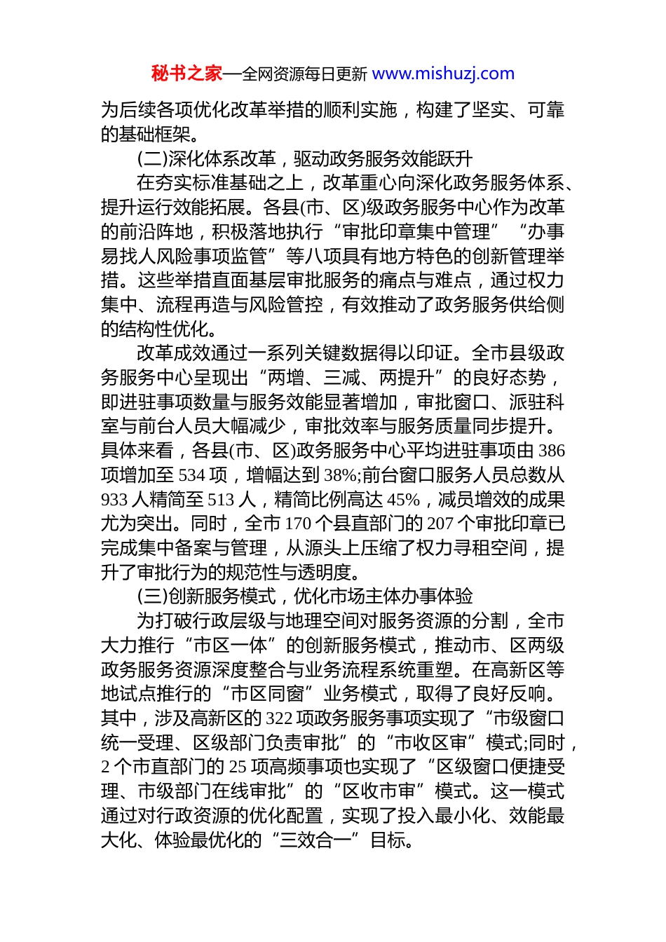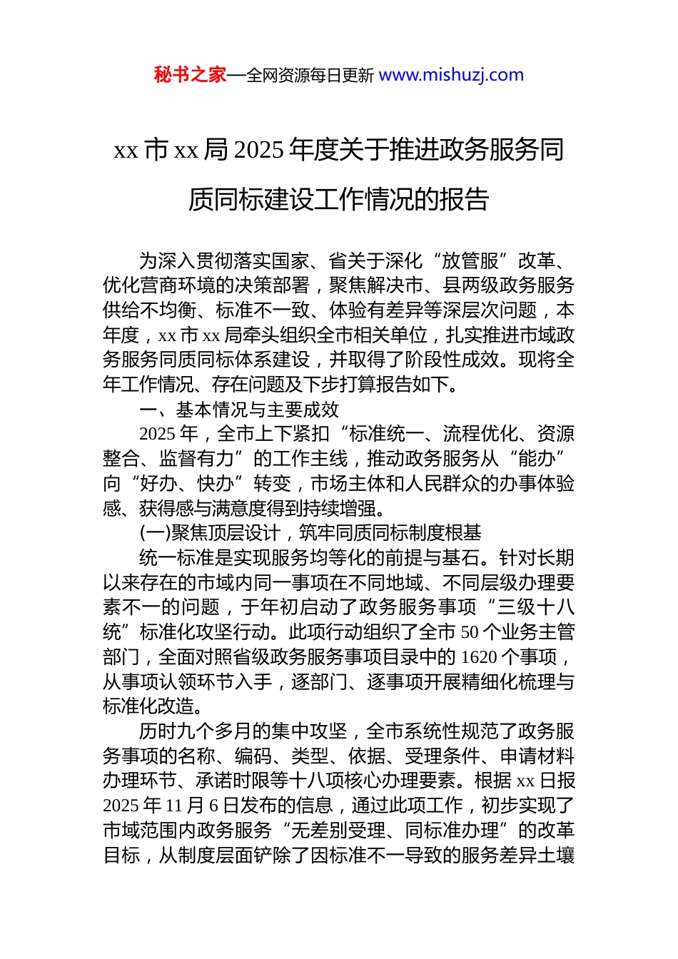 秘书之家—全网资源每日更新 www.mishuzj.comxx 市 xx 局 2025 年度关于推进政务服务同质同标建设工作情况的报告为深入贯彻落实国家、省关于深化“放管服”改革、优化营商环境的决策部署,聚焦解决市、县两级政务服务供给不均衡、标准不一致、体验有差异等深层次问题,本年度,xx 市 xx 局牵头组织全市相关单位,扎实推进市域政务服务同质同标体系建设,并取得了阶段性成效。现将全年工作情况、存在问题及下步打算报告如下。一、基本情况与主要成效2025 年,全市上下紧扣“标准统一、流程优化、资源整合、监督有力”的工作主线,推动政务服务从“能办”向“好办、快办”转变,市场主体和人民群众的办事体验感、获得感与满意度得到持续增强。(一)聚焦顶层设计,筑牢同质同标制度根基统一标准是实现服务均等化的前提与基石。针对长期以来存在的市域内同一事项在不同地域、不同层级办理要素不一的问题,于年初启动了政务服务事项“三级十八统”标准化攻坚行动。此项行动组织了全市 50 个业务主管部门,全面对照省级政务服务事项目录中的 1620 个事项,从事项认领环节入手,逐部门、逐事项开展精细化梳理与标准化改造。历时九个多月的集中攻坚,全市系统性规范了政务服务事项的名称、编码、类型、依据、受理条件、申请材料办理环节、承诺时限等十八项核心办理要素。根据 xx 日报2025 年 11 月 6 日发布的信息,通过此项工作,初步实现了市域范围内政务服务“无差别受理、同标准办理”的改革目标,从制度层面铲除了因标准不一导致的服务差异土壤秘书之家—全网资源每日更新 www.mishuzj.com为后续各项优化改革举措的顺利实施,构建了坚实、可靠的基础框架。(二)深化体系改革,驱动政务服务效能跃升在夯实标准基础之上,改革重心向深化政务服务体系、提升运行效能拓展。各县(市、区)级政务服务中心作为改革的前沿阵地,积极落地执行“审批印章集中管理”“办事易找人风险事项监管”等八项具有地方特色的创新管理举措。这些举措直面基层审批服务的痛点与难点,通过权力集中、流程再造与风险管控,有效推动了政务服务供给侧的结构性优化。改革成效通过一系列关键数据得以印证。全市县级政务服务中心呈现出“两增、三减、两提升”的良好态势,即进驻事项数量与服务效能显著增加,审批窗口、派驻科室与前台人员大幅减少,审批效率与服务质量同步提升。具体来看,各县(市、区)政务服务中心平均进驻事项由 386项增加至 534 项,增幅达到 38%;前台窗口服务人员总数从933 人精简至 513 人,精简比例高达 45%,减员增效的成果尤为突出。同时,全市 170 个县直部门的 207 个审批印章已完成集中备案与管理,从源头上压缩了权力寻租空间,提升了审批行为的规范性与透明度。(三)创新服务模式,优化市场主体办事体验为打破行政层级与地理空间对服务资源的分割,全市大力推行“市区一体”的创新服务模式,推动市、区两级政务服务资源深度整合与业务流程系统重塑。在高新区等地试点推行的“市区同窗”业务模式,取得了良好反响。其中,涉及高新区的 322 项政务服务事项实现了“市级窗口统一受理、区级部门负责审批”的“市收区审”模式;同时,2 个市直部门的 25 项高频事项也实现了“区级窗口便捷受理、市级部门在线审批”的“区收市审”模式。这一模式通过对行政资源的优化配置,实现了投入最小化、效能最大化、体验最优化的“三效合一”目标。秘书之家—全网资源每日更新 www.mishuzj.com与此同时,各级政务服务中心对窗口设置进行了科学化、集约化改造。特别是针对企业开办、工程建设项目审批、交通运输等市场主体关注度最高、业务关联性最强的重点领域,果断将原有的“分领域专窗”整合升级为“一窗式”综合受理窗口。此举有效减少了企业在不同窗口间“来回跑”的现象,提升了办事集成度。得益于此,目前市政务服务中心的无差别综合受理率已达到 94%,各县(市、区)中心平均达到 90%,这两项指标均处于全省领先水平,标志着全市政务服务便捷度迈上了一个新台阶。二、存在问题与深层分析在肯定成绩的同时,也必须清醒地认识到,对标国内一流标准和市场主体日...