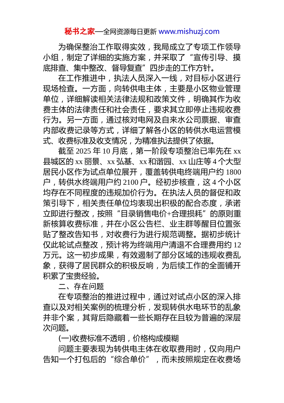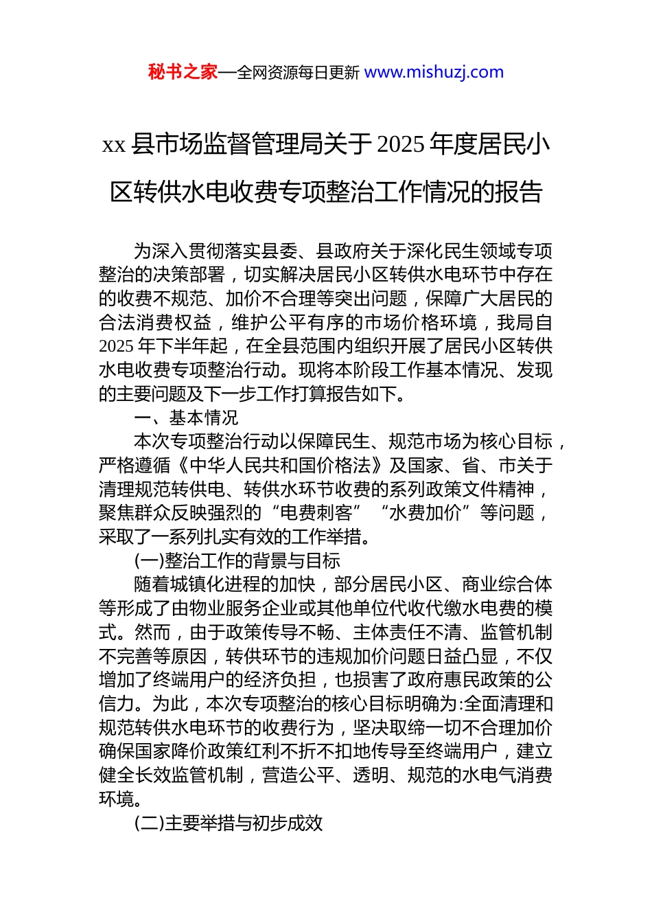 秘书之家—全网资源每日更新 www.mishuzj.comxx 县市场监督管理局关于 2025 年度居民小区转供水电收费专项整治工作情况的报告为深入贯彻落实县委、县政府关于深化民生领域专项整治的决策部署,切实解决居民小区转供水电环节中存在的收费不规范、加价不合理等突出问题,保障广大居民的合法消费权益,维护公平有序的市场价格环境,我局自2025 年下半年起,在全县范围内组织开展了居民小区转供水电收费专项整治行动。现将本阶段工作基本情况、发现的主要问题及下一步工作打算报告如下。一、基本情况本次专项整治行动以保障民生、规范市场为核心目标,严格遵循《中华人民共和国价格法》及国家、省、市关于清理规范转供电、转供水环节收费的系列政策文件精神,聚焦群众反映强烈的“电费刺客”“水费加价”等问题,采取了一系列扎实有效的工作举措。(一)整治工作的背景与目标随着城镇化进程的加快,部分居民小区、商业综合体等形成了由物业服务企业或其他单位代收代缴水电费的模式。然而,由于政策传导不畅、主体责任不清、监管机制不完善等原因,转供环节的违规加价问题日益凸显,不仅增加了终端用户的经济负担,也损害了政府惠民政策的公信力。为此,本次专项整治的核心目标明确为:全面清理和规范转供水电环节的收费行为,坚决取缔一切不合理加价确保国家降价政策红利不折不扣地传导至终端用户,建立健全长效监管机制,营造公平、透明、规范的水电气消费环境。(二)主要举措与初步成效秘书之家—全网资源每日更新 www.mishuzj.com为确保整治工作取得实效,我局成立了专项工作领导小组,制定了详细的实施方案,并采取了“宣传引导、摸底排查、集中整改、督导复查”四步走的工作方针。在工作推进中,执法人员深入一线,对目标小区进行现场检查。一方面,向转供电主体,主要是小区物业管理单位,详细解读相关法律法规和政策文件,明确其作为收费主体的法律责任和社会责任,要求其立即停止违规收费行为。另一方面,通过核对电网及自来水公司票据、审查内部收费记录等方式,详细了解各小区的转供水电运营模式、收费标准及收支情况,为精准执法提供了依据。截至 2025 年 10 月底,第一阶段专项整治已率先在 xx县城区的 xx 丽景、xx 弘基、xx 和谐园、xx 山庄等 4 个大型居民小区作为试点单位展开,覆盖转供电终端用户约 1800户,转供水终端用户约 2100 户。经初步核查,这 4 个小区均存在不同程度的违规加价行为。在执法人员的督促和政策引导下,相关责任单位均表现出积极的配合态度,承诺立即进行整改,按照“目录销售电价+合理损耗”的原则重新核算收费标准,并在小区公告栏、业主群等醒目位置张贴了整改告知书,对收费行为进行规范调整。据初步统计仅此轮试点整改,预计将为终端用户清退不合理费用约 12万元。这一初步成果,有效遏制了部分区域的违规收费乱象,获得了居民群众的积极反响,为后续工作的全面铺开积累了宝贵经验。二、存在问题在专项整治的推进过程中,通过对试点小区的深入排查以及对相关案例的梳理分析,发现转供水电环节的乱象并非个案,其背后隐藏着一些长期存在且较为普遍的深层次问题。(一)收费标准不透明,价格构成模糊问题主要表现为转供电主体在收取费用时,仅向用户告知一个打包后的“综合单价”,而未按照规定在收费场秘书之家—全网资源每日更新 www.mishuzj.com所显著位置公示目录销售电价、分摊的共用设施损耗及具体计算方式。终端用户无法清晰了解自己消费的每一度电每一吨水的价格构成,知情权和选择权受到严重侵害。调查显示,超过七成的居民表示对转供水电的具体加价方式和计算依据不甚了解许多收费公示流于形式或根本不存在导致用户面对高额账单时“一头雾水”,维权无门。这种价格不透明的操作模式,为各类违规加价行为提供了滋生的温床。(二)违规加价行为普遍,损害群众利益这是本次整治中发现的核心问题。违规加价的方式多种多样,极具隐蔽性。一是直接提高单价,即在政府规定的目录电价基础上直接加上一个固定数值。二是以“服务费”“管理费”“线路维护费”等名目变相加价,将本应计入物业管理成本的费用转嫁至水电费中,...