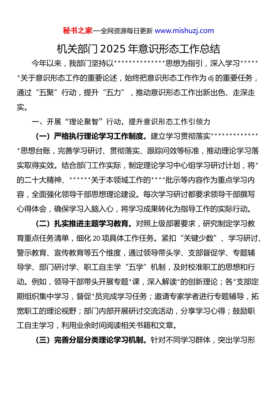 秘书之家—全网资源每日更新 www.mishuzj.com机关部门 2025 年意识形态工作总结今年以来,我部门坚持以**************思想为指引,深入学习******关于意识形态工作的重要论述,始终把意识形态工作作为 dj 的重要任务,通过“五聚”行动,提升“五力”,推动意识形态工作出新出色、走深走实。一、开展“理论聚智”行动,提升意识形态工作引领力(一)严格执行理论学习工作制度。建立学习贯彻落实**************思想台账,完善学习研讨、贯彻落实、跟踪问效等标准,推动理论学习落实取得实效。结合部门工作实际,制定理论学习中心组学习研讨计划,将*的二十大精神、******关于本领域工作的****批示等内容作为重点学习内容,全面强化领导干部思想理论建设。每次学习研讨都要求领导干部撰写心得体会,确保学习入脑入心,将学习成果转化为指导工作的实际行动。(二)扎实推进主题学习教育。对照上级部署要求,研究制定学习教育重点任务清单,细化 20 项具体工作任务。紧扣“关键少数”、学习研讨、警示教育、宣传教育等五个维度,通过领导带头学、支部督促学、专题辅导学、部门研讨学、职工自主学“五学”机制,及时校准职工的思想和行动。例如,领导干部带头开展专题*课,深入解读*的创新理论;各*支部定期组织集中学习,督促*员完成学习任务;邀请专家学者进行专题辅导,拓宽职工的理论视野;部门内部开展研讨交流活动,分享学习心得;鼓励职工自主学习,利用业余时间阅读相关书籍和文章。(三)完善分层分类理论学习机制。针对不同学习群体,突出学习形秘书之家—全网资源每日更新 www.mishuzj.com式多样化、学习内容差异化、学习要求精准化,有针对性开展思想教育。对于领导干部,重点开展专题研讨和高端讲座,提升其政治判断力、政治领悟力和政治执行力;对于普通职工,通过线上学习平台、主题演讲比赛等形式,普及*的理论知识。推动理论武装从机关向基层一线延伸,从“关键少数”向广大职工拓展,确保全体职工都能受到良好的思想教育。二、开展“夯基聚力”行动,提升意识形态工作持久力(一)压实主体责任。健全完善意识形态工作责任体系,精心制定思想教育实践活动任务清单,将意识形态工作和 dj 品牌创建、*风廉政建设工作责任制考核、示范标兵评选等相结合,切实以硬性约束推动责任落实。明确各级领导干部在意识形态工作中的职责,签订责任书,将意识形态工作纳入年度考核重要内容,对责任落实不到位的进行严肃问责。(二)加强队伍建设。选优配齐意识形态工作工作人员,建立完善工作评价办法,借助意识形态工作操作实务,创新开展“典型经验”分享活动。每月组织一次经验交流会议,让表现优秀的工作人员分享工作心得和方法,不断强化意识形态工作人员的综合素质。同时,定期组织业务培训,邀请专家授课,提升工作人员的专业能力。(三)统筹载体建设。汇聚部门内外力量,通过业务大比拼、建言献策等活动载体,凝聚职工的思想共识。开展业务技能竞赛,激发职工的工作热情和创新精神;组织建言献策活动,鼓励职工为部门发展提出合理化建议,增强职工的参与感和归属感。通过这些活动,营造积极向上的工作氛围,促进意识形态工作与业务工作深度融合。秘书之家—全网资源每日更新 www.mishuzj.com三、开展“融合聚能”行动,提升意识形态工作推动力(一)将意识形态工作植入业务工作全领域。始终坚持“问题导向、目标导向、结果导向”,围绕业务工作关键点,设置意识形态工作“路线图”。通过“dj 赋能促发展”主题实践活动,精准设立示范岗、突击队。聚焦重大项目,选派能力强、素质高、作风硬的职工担任组长,引导广大职工在项目推进中打头阵、挑重担、当先锋。例如,在重点业务项目中,成立*员突击队,充分发挥*员的先锋模范作用,带动全体职工攻坚克难,形成了意识形态工作和业务工作齐头并进的良好局面。(二)将意识形态工作贯穿职工成长全过程。坚持以“理论+业务”的方式,举办各类培训班,先后开展业务技能、公文写作、沟通技巧等技能竞赛,对成绩优秀者破格提拔,充分激发职工深入钻研业务的积极性,拓宽职工的晋升渠道。通过这些活动,让职工在提升业务能...