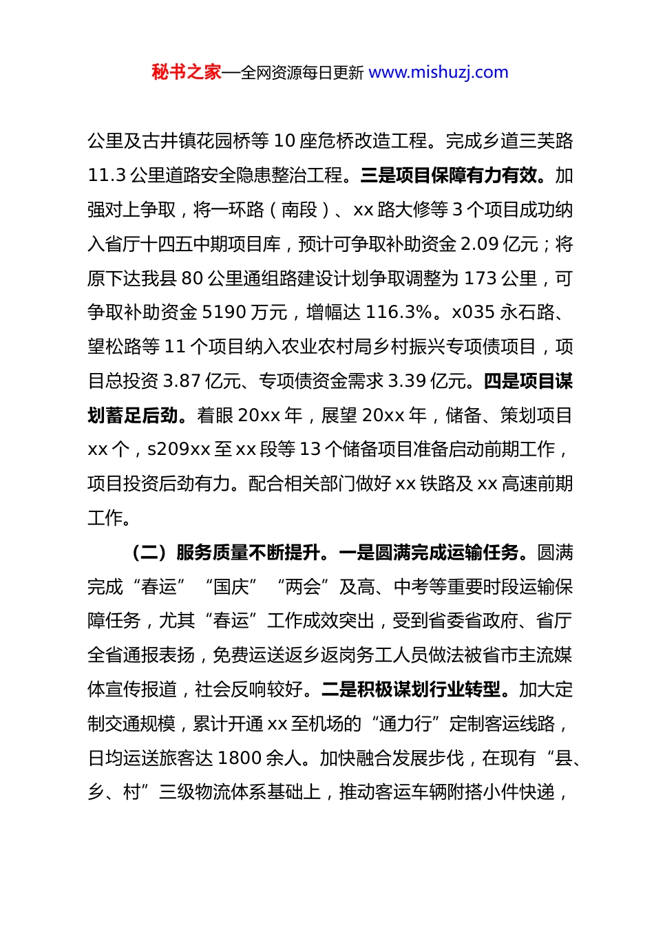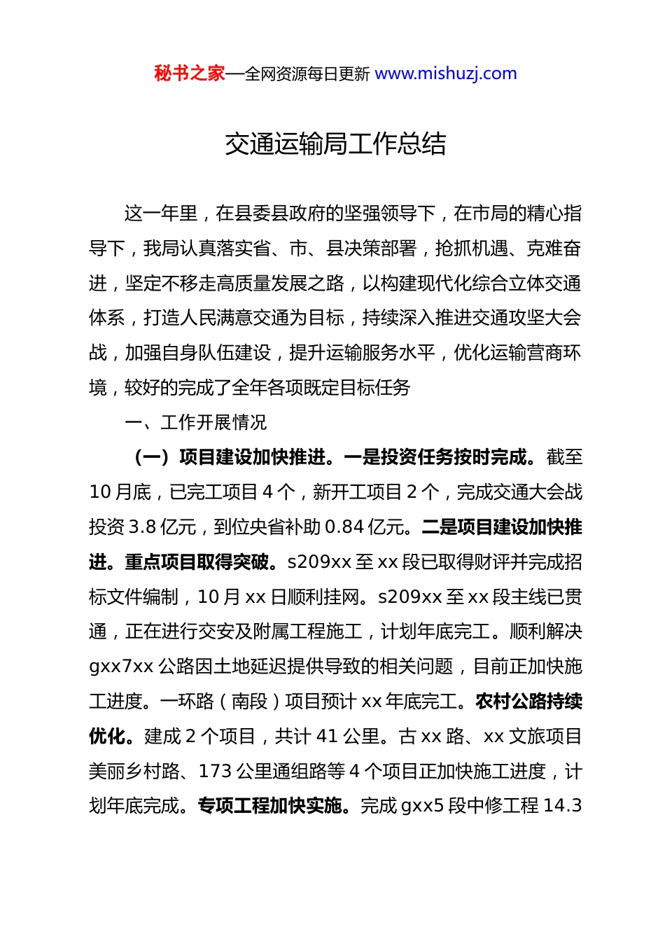 秘书之家—全网资源每日更新 www.mishuzj.com交通运输局工作总结这一年里,在县委县政府的坚强领导下,在市局的精心指导下,我局认真落实省、市、县决策部署,抢抓机遇、克难奋进,坚定不移走高质量发展之路,以构建现代化综合立体交通体系,打造人民满意交通为目标,持续深入推进交通攻坚大会战,加强自身队伍建设,提升运输服务水平,优化运输营商环境,较好的完成了全年各项既定目标任务一、工作开展情况(一)项目建设加快推进。一是投资任务按时完成。截至10 月底,已完工项目 4 个,新开工项目 2 个,完成交通大会战投资 3.8 亿元,到位央省补助 0.84 亿元。二是项目建设加快推进。重点项目取得突破。s209xx 至 xx 段已取得财评并完成招标文件编制,10 月 xx 日顺利挂网。s209xx 至 xx 段主线已贯通,正在进行交安及附属工程施工,计划年底完工。顺利解决gxx7xx 公路因土地延迟提供导致的相关问题,目前正加快施工进度。一环路(南段)项目预计 xx 年底完工。农村公路持续优化。建成 2 个项目,共计 41 公里。古 xx 路、xx 文旅项目美丽乡村路、173 公里通组路等 4 个项目正加快施工进度,计划年底完成。专项工程加快实施。完成 gxx5 段中修工程 14.3秘书之家—全网资源每日更新 www.mishuzj.com公里及古井镇花园桥等 10 座危桥改造工程。完成乡道三芙路11.3 公里道路安全隐患整治工程。三是项目保障有力有效。加强对上争取,将一环路(南段)、xx 路大修等 3 个项目成功纳入省厅十四五中期项目库,预计可争取补助资金 2.09 亿元;将原下达我县 80 公里通组路建设计划争取调整为 173 公里,可争取补助资金 5190 万元,增幅达 116.3%。x035 永石路、望松路等 11 个项目纳入农业农村局乡村振兴专项债项目,项目总投资 3.87 亿元、专项债资金需求 3.39 亿元。四是项目谋划蓄足后劲。着眼 20xx 年,展望 20xx 年,储备、策划项目xx 个,s209xx 至 xx 段等 13 个储备项目准备启动前期工作,项目投资后劲有力。配合相关部门做好 xx 铁路及 xx 高速前期工作。(二)服务质量不断提升。一是圆满完成运输任务。圆满完成“春运”“国庆”“两会”及高、中考等重要时段运输保障任务,尤其“春运”工作成效突出,受到省委省政府、省厅全省通报表扬,免费运送返乡返岗务工人员做法被省市主流媒体宣传报道,社会反响较好。二是积极谋划行业转型。加大定制交通规模,累计开通 xx 至机场的“通力行”定制客运线路,日均运送旅客达 1800 余人。加快融合发展步伐,在现有“县、乡、村”三级物流体系基础上,推动客运车辆附搭小件快递,秘书之家—全网资源每日更新 www.mishuzj.com发展货运班车,累计投入“小黄车”54 辆、“金通货车”2 辆。进一步提升“交邮结合”能力。以“串联一路风景、带动一片产业、造福一方群众”的目标,推进“交旅融合”发展,在现有旅游线路的基础上,新开行 xx 班湖旅游客运班线,累计服务游客 9000 人次。三是妥善解决民忧民盼。关注社会热点,升级公交刷卡系统,自 8 月 1 日起,全县持优待证的退役军人和“三属”将免费乘坐公交车。及时回应群众关心的道路交通建设、运输服务等问题,通过 12345、12328 等网络问政平台办理业务工单 800 余件,办结率 100%、群众满意率 100%,尤其是 12328 监督热线办理平均时长从 9 小时提升到 0.18 小时,办理工作连续三个月被市局评定为 a 等次。四是持续扮靓路域环境。印发《xx 县公路沿线路域环境整治专项行动实施方案》,今年以来,累计清理公路区域垃圾杂物 20 吨及破损、非交通标志 180 余处;拆除更换损坏、老化的公路附属设施70 余处。打造“便于群众候车、特色农产品售卖、日常休闲”的交通驿站体系,目前已完成进黄路等 3 条示范路改造,为县域内县、乡、村道建设起到较好的示范作用。五是多措助力绿色交通。扎实开展道路扬尘治理、机动车维修行业污染治理、在建项目污染治理、重污染天气响应等方面工作,今年以来,开展多轮次环保督察检查,共检查在建项目、维修企业 350 余秘书之家—全网资源每...