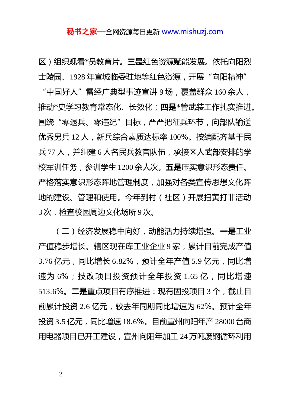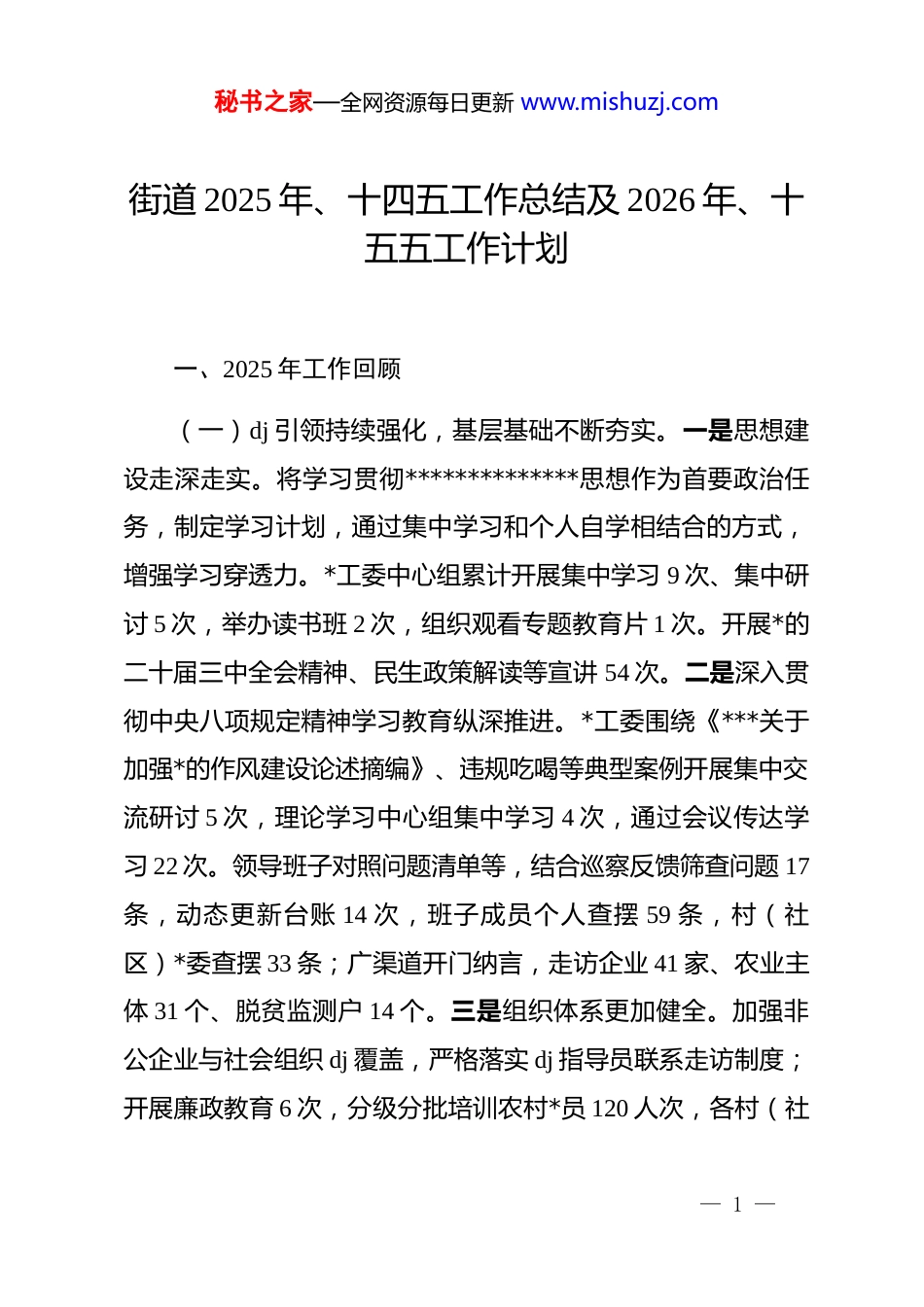 秘书之家—全网资源每日更新 www.mishuzj.com街道 2025 年、十四五工作总结及 2026 年、十五五工作计划一、2025 年工作回顾(一)dj 引领持续强化,基层基础不断夯实。一是思想建设走深走实。将学习贯彻**************思想作为首要政治任务,制定学习计划,通过集中学习和个人自学相结合的方式,增强学习穿透力。*工委中心组累计开展集中学习 9 次、集中研讨 5 次,举办读书班 2 次,组织观看专题教育片 1 次。开展*的二十届三中全会精神、民生政策解读等宣讲 54 次。二是深入贯彻中央八项规定精神学习教育纵深推进。*工委围绕《***关于加强*的作风建设论述摘编》、违规吃喝等典型案例开展集中交流研讨 5 次,理论学习中心组集中学习 4 次,通过会议传达学习 22 次。领导班子对照问题清单等,结合巡察反馈筛查问题 17条,动态更新台账 14 次,班子成员个人查摆 59 条,村(社区)*委查摆 33 条;广渠道开门纳言,走访企业 41 家、农业主体 31 个、脱贫监测户 14 个。三是组织体系更加健全。加强非公企业与社会组织 dj 覆盖,严格落实 dj 指导员联系走访制度;开展廉政教育 6 次,分级分批培训农村*员 120 人次,各村(社— 1 —秘书之家—全网资源每日更新 www.mishuzj.com区)组织观看*员教育片。三是红色资源赋能发展。依托向阳烈士陵园、1928 年宣城临委驻地等红色资源,开展“向阳精神”“中国好人”雷经广典型事迹宣讲 9 场,覆盖群众 160 余人,推动*史学习教育常态化、长效化;四是*管武装工作扎实推进。围绕“零退兵、零违纪”目标,严严把征兵环节,向部队输送优秀男兵 12 人,新兵综合素质达标率 100%。按编配齐基干民兵 77 人,并组建 6 人名民兵教官队伍,承接区人武部安排的学校军训任务,参训学生 1200 余人次。五是压实意识形态责任。严格落实意识形态阵地管理制度,加强对各类宣传思想文化阵地的建设、管理和使用。今年到村(社区)开展扫黄打非活动3 次,检查校园周边文化场所 9 次。(二)经济发展稳中向好,动能活力持续增强。一是工业产值稳步增长。辖区现在库工业企业 9 家,累计目前完成产值3.76 亿元,同比增长 6.82%,预计全年产值 5.9 亿元,同比增速为 6%;技改项目投资预计全年投资 1.65 亿,同比增速513.6%。二是重点项目有序推进:现有固投项目 3 个,截止目前累计投资 2.6 亿元,较去年同期同比增速为 62%。预计全年投资 3.5 亿元,同比增速 18.6%。目前宣州向阳年产 28000 台商用电器项目已开工建设,宣州向阳年加工 24 万吨废钢循环利用— 2 —秘书之家—全网资源每日更新 www.mishuzj.com项目正在办理土地手续。三是财政收入趋于稳定。截止目前街道完成一般公共预算收入 1719 万元,预计年度公共预算收入2770 万元。发放补贴资金 37 项,126 批次,共计发放 2367.09万元。上报一事一议财政奖补项目 10 个,总投资 145.7 万元,已经全部完工。四是营商环境持续优化:组建企业帮办代办队伍,提供“一站式”服务,营造贴心服务氛围,积极打造优质营商环境,累计目前完成企业项目立项 8 个,帮助企业解决基础设施建设、临时用电等实际问题 7 个。五是加大土地供应力度。截至目前街道已供应土地 6 宗、面积 56.71 亩,其中划拨 3宗,面积 21.86 亩;出让 2 宗,面积 34.85 亩,出让价款 628 万元。六是文旅产业创新突破。招引一批“小投入、有创意、聚流量”的文旅新业态。创新发展网红打卡点“昕宸花园”、“鳄鱼咬咬面包坊”“宛陵里”“田觅拾光”,开展话题营销,积极引流,提升向阳文旅热度。(三)乡村振兴扎实推进,产业兴旺蓬勃发展。一是和美乡村建设成效显著:全面推进 10 个乡村整治点建设,累计投入资金 178.13 万元,形成“政府引导、村社主导、村民参与”的多元投入格局。全力推进 2025 年省级精品示范村培育村提升项目,累计投入资金 94.8 万元,标准化建设、精细化改造,为街— 3 —秘书之家—全网资源每日更新 www.mishuzj.com道和美乡村建设树立核心标杆。二是农业发展持续推进。2025年小麦、油...