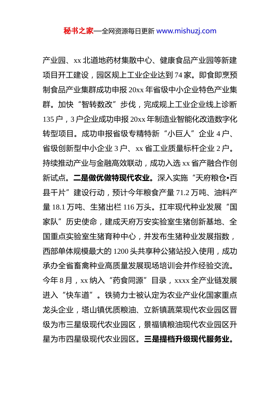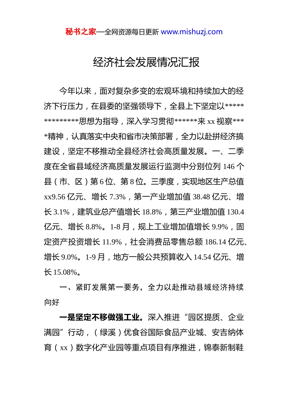 秘书之家—全网资源每日更新 www.mishuzj.com 经济社会发展情况汇报今年以来,面对复杂多变的宏观环境和持续加大的经济下行压力,在县委的坚强领导下,全县上下坚定以**************思想为指导,深入学习贯彻******来 xx 视察****精神,认真落实中央和省市决策部署,全力以赴拼经济搞建设,坚定不移推动全县经济社会高质量发展。一、二季度在全省县域经济高质量发展运行监测中分别位列 146 个县(市、区)第 6 位、第 8 位。三季度,实现地区生产总值xx9.56 亿元、增长 7.3%,第一产业增加值 38.48 亿元、增长 3.1%,建筑业总产值增长 18.8%,第三产业增加值 130.4亿元、增长 8.8%。1-8 月,规上工业增加值增长 9.9%,固定资产投资增长 11.9%,社会消费品零售总额 186.14 亿元、增长 9.0%。1-9 月,地方一般公共预算收入 14.54 亿元、增长 15.08%。一、紧盯发展第一要务,全力以赴推动县域经济持续向好一是坚定不移做强工业。深入推进“园区提质、企业满园”行动,(绿溪)优食谷国际食品产业城、安吉纳体育(xx)数字化产业园等重点项目有序推进,锦泰新制鞋秘书之家—全网资源每日更新 www.mishuzj.com产业园、xx 北道地药材集散中心、健康食品产业园等新建项目开工建设,园区规上工业企业达到 74 家。即食即烹预制食品产业集群成功申报 20xx 年省级中小企业特色产业集群。加快“智转数改”步伐,完成规上工业企业线上诊断135 户,3 户企业成功申报 20xx 年制造业智能化改造数字化转型项目。成功申报省级专精特新“小巨人”企业 4 户、省级创新型中小企业 3 户、xx 省工业质量标杆企业 2 户。持续推动产业与金融高效联动,成功入选 xx 省产融合作创新试点。二是做优做特现代农业。深入实施“天府粮仓•百县千片”建设行动,预计今年粮食产量 71.2 万吨、油料产量 18.1 万吨、生猪出栏 116 万头。扛牢现代种业发展“国家队”历史使命,建成天府万安实验室生猪创新基地、全国重点实验室生猪育种中心,并发布生猪种业发展指数,西部单体规模最大的 1200 头共享种公猪站投入使用,成功承办全省畜禽种业高质量发展现场培训会并作经验交流。今年 8 月,xx 纳入“药食同源”目录,xxxx 全产业链发展进入“快车道”。铁骑力士被认定为农业产业化国家重点龙头企业,塔山镇优质粮油、立新镇蔬菜现代农业园区晋级为市三星级现代农业园区,景福镇粮油现代农业园区升星为市四星级现代农业园区。三是提档升级现代服务业。秘书之家—全网资源每日更新 www.mishuzj.com在全省、全市率先启动实施家电以旧换新试点,累计申请补贴 5088 笔,已兑现 4758 笔、兑现金额 321.82 万元。改造升级一批商业综合体、专业市场、特色商业街,天平巷特色商业街启动打造,潘家坝城市综合体建设加快推进,星巴克 xx 首店正式营业。召开 xx 县-红原县农特产品专场推介会暨产销对接活动,签订意向订单超 5 亿元。组织 106家企业参加广交会、越南行等国际性展会活动,签订进出口订单超 600 万元,全县实绩外贸进出口企业增至 19 家,省级外贸转型升级基地通过省商务厅考核并获评优秀等次高质量承办“春游 xx·观花乡野”赏春推广、第四届郪汉文化旅游周暨第二届“一江三地”郪江大集等文旅活动 30 余场,吸引游客近百万人,拉动消费近 2 亿元。四是持续扩大项目投资。强化延链补链强链招商,成功签约高速铜连接项目等 5 亿元以上项目 6 个、金额 35.2 亿元。对交通、教体、卫健等领域进行穿透式梳理,策划实施“三大路”整治提升、凤凰山学校等一批群众呼声大、必须要干、早晚要干、符合 xx 实际的项目。全力推进项目建设,77 个省市县重点项目累计完成投资 83.49 亿元,高于时间进度 6.54个百分点。树牢“民有所呼,我有所应”理念,加快群众关心关注的重点项目进度,铁路 xx 段项目前期工作全面完秘书之家—全网资源每日更新 www.mishuzj.com成,先行用地范围实体工程已于今年 6 月实质性开工建设,预计 2028 年上半年建成通车。水库工程建设项目已于今年2 月取得国务院征地批文,正在推进水库主体工程建...