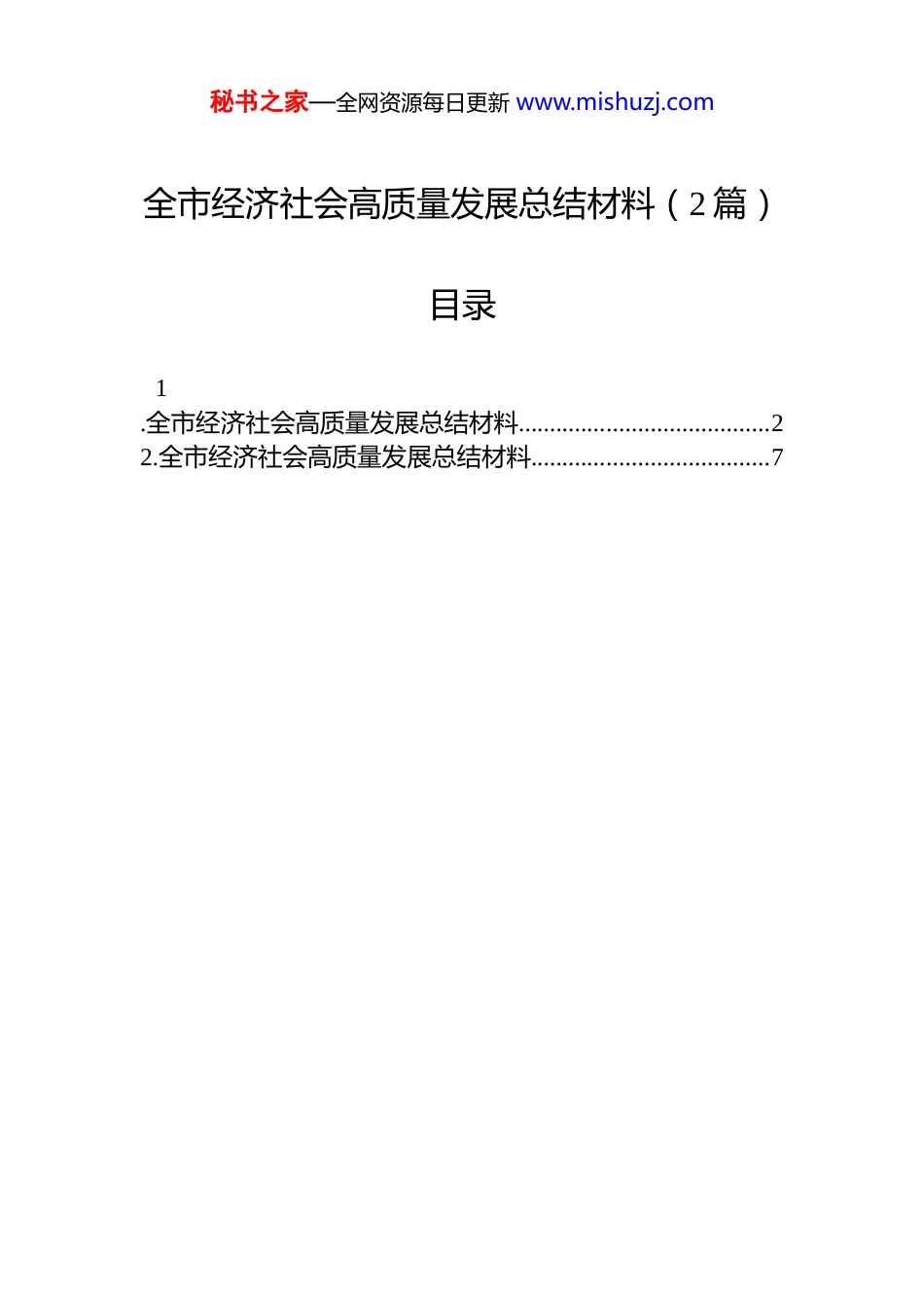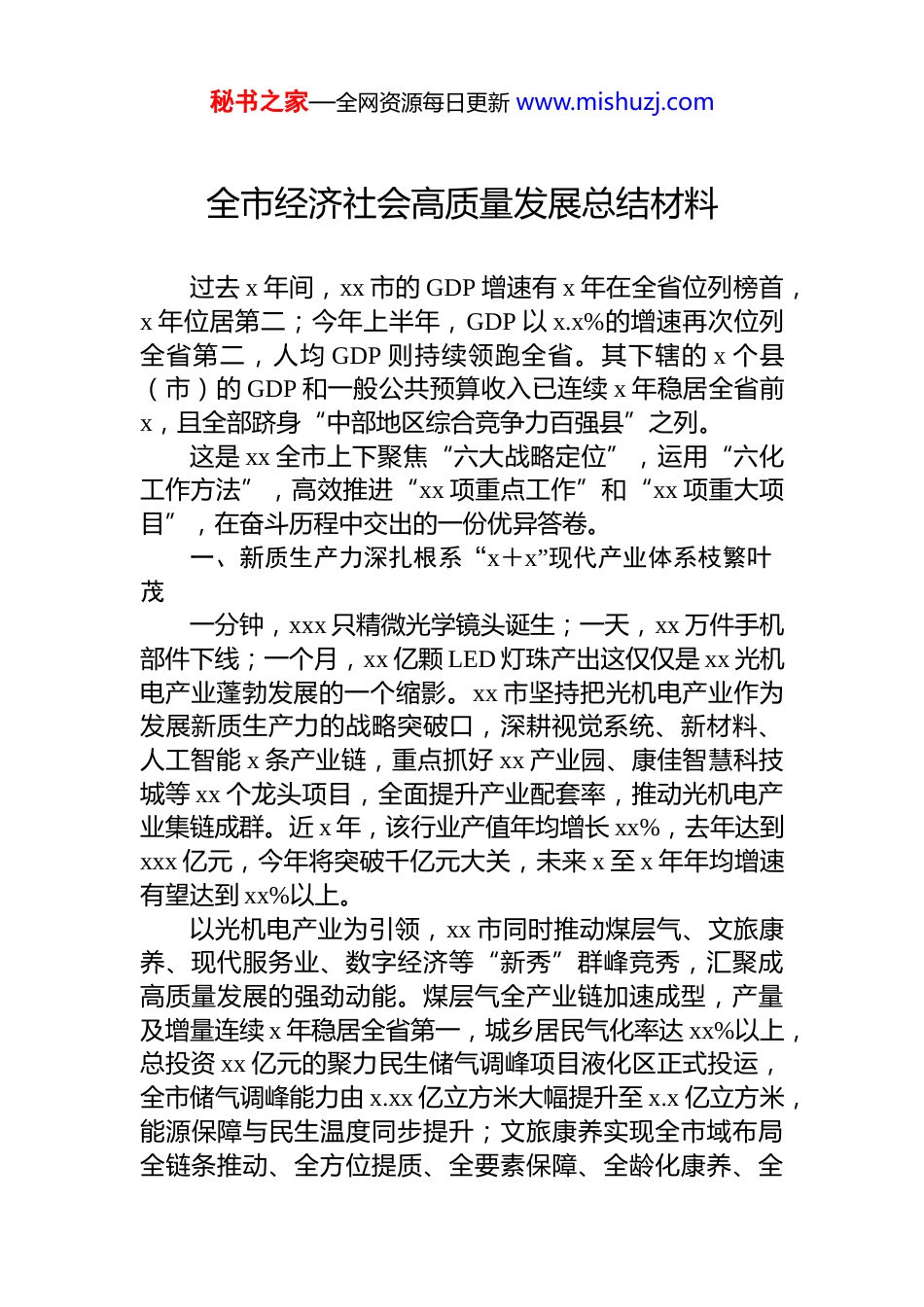 秘书之家—全网资源每日更新 www.mishuzj.com全市经济社会高质量发展总结材料(2 篇)目录1.全市经济社会高质量发展总结材料........................................22.全市经济社会高质量发展总结材料......................................7秘书之家—全网资源每日更新 www.mishuzj.com全市经济社会高质量发展总结材料过去 x 年间,xx 市的 GDP 增速有 x 年在全省位列榜首,x 年位居第二;今年上半年,GDP 以 x.x%的增速再次位列全省第二,人均 GDP 则持续领跑全省。其下辖的 x 个县(市)的 GDP 和一般公共预算收入已连续 x 年稳居全省前x,且全部跻身“中部地区综合竞争力百强县”之列。这是 xx 全市上下聚焦“六大战略定位”,运用“六化工作方法”,高效推进“xx 项重点工作”和“xx 项重大项目”,在奋斗历程中交出的一份优异答卷。一、新质生产力深扎根系“x+x”现代产业体系枝繁叶茂一分钟,xxx 只精微光学镜头诞生;一天,xx 万件手机部件下线;一个月,xx 亿颗 LED 灯珠产出这仅仅是 xx 光机电产业蓬勃发展的一个缩影。xx 市坚持把光机电产业作为发展新质生产力的战略突破口,深耕视觉系统、新材料、人工智能 x 条产业链,重点抓好 xx 产业园、康佳智慧科技城等 xx 个龙头项目,全面提升产业配套率,推动光机电产业集链成群。近 x 年,该行业产值年均增长 xx%,去年达到xxx 亿元,今年将突破千亿元大关,未来 x 至 x 年年均增速有望达到 xx%以上。以光机电产业为引领,xx 市同时推动煤层气、文旅康养、现代服务业、数字经济等“新秀”群峰竞秀,汇聚成高质量发展的强劲动能。煤层气全产业链加速成型,产量及增量连续 x 年稳居全省第一,城乡居民气化率达 xx%以上,总投资 xx 亿元的聚力民生储气调峰项目液化区正式投运,全市储气调峰能力由 x.xx 亿立方米大幅提升至 x.x 亿立方米,能源保障与民生温度同步提升;文旅康养实现全市域布局全链条推动、全方位提质、全要素保障、全龄化康养、全秘书之家—全网资源每日更新 www.mishuzj.com媒体宣传,上半年共接待国内游客 xxxx.x 万人次,增长xx.x%,全省排名第 x 位,“东方古堡、人间 xx,云锦太行、诗画 xx”的名片熠熠生辉;现代服务业提质增效,整合组建xxx 家平台公司,扎实推进 xx 个服务业龙头项目,加快建设十大物流园区,发放消费品以旧换新资金 x.xx 亿元,直接拉动消费 xx 亿元,持续推进 x 个乡村 e 镇、xx 个美食街区、xx 个夜经济专区提档升级,积极创建国家文化和旅游消费示范(试点)城市;数字经济加快发展,大力实施“数字 xx”战略,全力打造全省制造业数字化改造先行区,建成智能工厂 xx 户,xxx 户企业通过国家两化融合管理体系认证;“xx 光谷”等数字产业园加快建设,上半年全市数字经济核心企业营业收入同比增长 xx.x%。扎实推进传统产业转型升级,发挥煤炭“压舱石”作用。上半年原煤产量完成 xxxx.x 万吨,xx 座煤矿智能化改造全部开工,累计建成 xx 座,先进产能占比达 xx%,高于全省 xx.x 个百分点;加速铸造产业创新集聚,深化六大铸造产业园建设,推进配套 xx 绿色铸造、xx 智能制造总部基地等项目,构建“精密铸件—关键零部件—整机制造”全产业链,全国铸造学术会议在该市召开,显著提升行业影响力。二、项目建设提速增效高质量发展支撑强劲有力“我们不是在建一个传统意义上的产业园区,而是在打造一个融合‘数字科技+产业生态+智慧建筑’的未来电商新地标。”省级重点工程、xx 市电商创新创业基地项目现场,规划设计团队正围绕项目方案,精准推敲功能分区布局。xx 市紧扣“两重”“两新”等政策,坚持谋划、策划、规划“三划一体”,工作专班、专业机构、专项资金“三专结合”,深入开展“项目建设攻坚年”活动,谋划实施年度投资 xxx 亿元的 xxxx 个建设项目,为经济社会发展锻造了强劲引擎。秘书之家—全网资源每日更新 www.mishuzj.com充分发挥市县两级“一办三中心”统筹协调作用,依托“指挥部+公司”、“赛马”比拼、领导包联和常态化调度机制,全力推动重大项目...