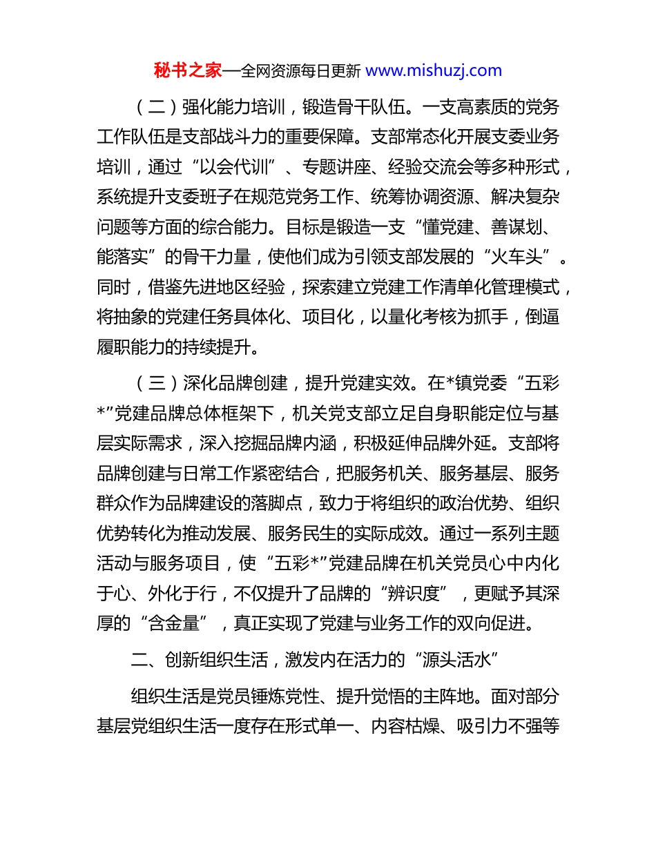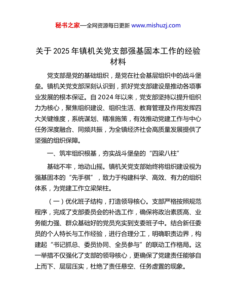 秘书之家—全网资源每日更新 www.mishuzj.com关于 2025 年镇机关党支部强基固本工作的经验材料党支部是党的基础组织,是党在社会基层组织中的战斗堡垒。镇机关党支部深刻认识到,抓好党支部建设是推动各项事业发展的根本保证。自 2024 年以来,党支部坚持以提升组织力为核心,聚焦组织建设、组织生活、教育管理及作用发挥四大关键维度,系统谋划、精准施策,有效推动党建工作与中心任务深度融合、同频共振,为全镇经济社会高质量发展提供了坚强的组织保障。一、筑牢组织根基,夯实战斗堡垒的“四梁八柱”基础不牢,地动山摇。镇机关党支部始终将组织建设视为强基固本的“先手棋”,致力于构建科学、高效、有力的组织体系,为党建工作立梁架柱。(一)优化班子结构,打造领导核心。支部严格按照规范程序,完成了支部委员会的补选工作,确保将政治素质高、业务能力强、群众基础好的党员充实到支委班子中。结合新任委员的个人特长与工作经验,进行合理分工,明确职责边界,构建起“书记抓总、委员协同、全员参与”的联动工作格局。这一举措不仅强化了支部的领导核心,更确保了党建责任能够自上而下、层层压实,杜绝了责任悬空、任务虚置的现象。秘书之家—全网资源每日更新 www.mishuzj.com(二)强化能力培训,锻造骨干队伍。一支高素质的党务工作队伍是支部战斗力的重要保障。支部常态化开展支委业务培训,通过“以会代训”、专题讲座、经验交流会等多种形式,系统提升支委班子在规范党务工作、统筹协调资源、解决复杂问题等方面的综合能力。目标是锻造一支“懂党建、善谋划、能落实”的骨干力量,使他们成为引领支部发展的“火车头”。同时,借鉴先进地区经验,探索建立党建工作清单化管理模式,将抽象的党建任务具体化、项目化,以量化考核为抓手,倒逼履职能力的持续提升。(三)深化品牌创建,提升党建实效。在*镇党委“五彩*”党建品牌总体框架下,机关党支部立足自身职能定位与基层实际需求,深入挖掘品牌内涵,积极延伸品牌外延。支部将品牌创建与日常工作紧密结合,把服务机关、服务基层、服务群众作为品牌建设的落脚点,致力于将组织的政治优势、组织优势转化为推动发展、服务民生的实际成效。通过一系列主题活动与服务项目,使“五彩*”党建品牌在机关党员心中内化于心、外化于行,不仅提升了品牌的“辨识度”,更赋予其深厚的“含金量”,真正实现了党建与业务工作的双向促进。二、创新组织生活,激发内在活力的“源头活水”组织生活是党员锤炼党性、提升觉悟的主阵地。面对部分基层党组织生活一度存在形式单一、内容枯燥、吸引力不强等秘书之家—全网资源每日更新 www.mishuzj.com挑战,*镇机关党支部坚持以标准化、规范化为基础,以创新为驱动,着力让组织生活既有严肃的“党味”,又有生动的“趣味”,更有显著的“实效”。(一)科学规划,确保内容“精准化”。支部改变了以往临时抱佛脚、随意安排的做法,创新性地推出了组织生活“课程表”制度。每月初,支委会根据上级党委要求、当前中心工作以及重要时间节点,精心制定当月活动计划,明确学习主题、活动形式、参与人员和预期目标。在严格落实“三会一课”等基本制度的基础上,紧密结合中央八项规定精神学习教育、党纪学习教育等重点任务,动态调整学习内容,确保组织生活与时代同步、与任务同向。这种精细化的计划管理,有效解决了工学矛盾,提升了组织生活的计划性和严肃性。(二)打破壁垒,拓展活动“联动圈”。为破解机关党建“自我循环”的局限,支部主动走出机关大院,积极构建多方联动的“党建生态圈”。2024 年以来,支部先后联合各*村(嘎查)党支部,赴看守所开展廉政警示教育主题党日,通过现场的强烈震撼筑牢党员思想防线;联合辖区重点企业党支部,开展“党员当先锋,助企开门红”主题党日,为企业发展出谋划策、解决难题;联合共建单位党支部,开展“清整战备‘生命线’,淬炼党员硬作风”主题党日,在实践中锤炼党员的责任与担当;联合辖区派出所党支部,共同开展城乡环境卫生综秘书之家—全网资源每日更新 www.mishuzj.com合整治行动。这种“开门搞党建”的模式,不仅丰富了活动形式,...