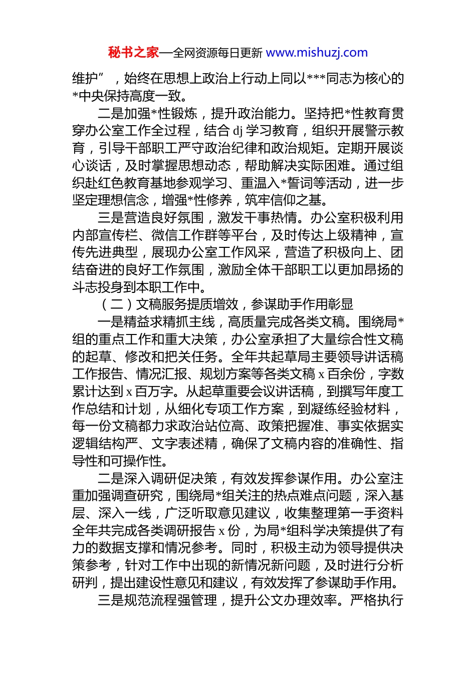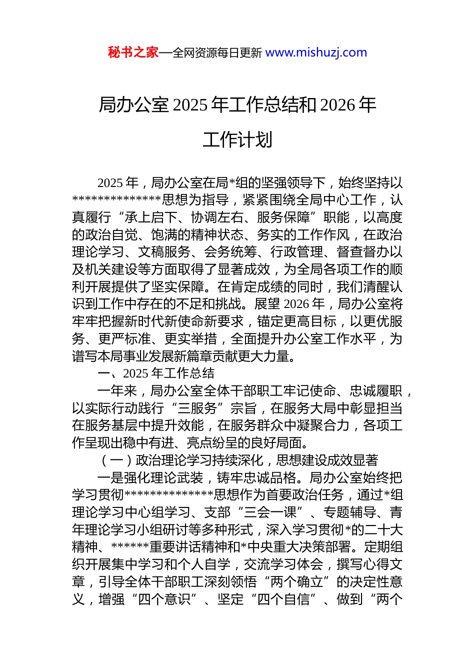 秘书之家—全网资源每日更新 www.mishuzj.com局办公室 2025 年工作总结和 2026 年工作计划2025 年,局办公室在局*组的坚强领导下,始终坚持以**************思想为指导,紧紧围绕全局中心工作,认真履行“承上启下、协调左右、服务保障”职能,以高度的政治自觉、饱满的精神状态、务实的工作作风,在政治理论学习、文稿服务、会务统筹、行政管理、督查督办以及机关建设等方面取得了显著成效,为全局各项工作的顺利开展提供了坚实保障。在肯定成绩的同时,我们清醒认识到工作中存在的不足和挑战。展望 2026 年,局办公室将牢牢把握新时代新使命新要求,锚定更高目标,以更优服务、更严标准、更实举措,全面提升办公室工作水平,为谱写本局事业发展新篇章贡献更大力量。一、2025 年工作总结一年来,局办公室全体干部职工牢记使命、忠诚履职,以实际行动践行“三服务”宗旨,在服务大局中彰显担当在服务基层中提升效能,在服务群众中凝聚合力,各项工作呈现出稳中有进、亮点纷呈的良好局面。(一)政治理论学习持续深化,思想建设成效显著一是强化理论武装,铸牢忠诚品格。局办公室始终把学习贯彻**************思想作为首要政治任务,通过*组理论学习中心组学习、支部“三会一课”、专题辅导、青年理论学习小组研讨等多种形式,深入学习贯彻*的二十大精神、******重要讲话精神和*中央重大决策部署。定期组织开展集中学习和个人自学,交流学习体会,撰写心得文章,引导全体干部职工深刻领悟“两个确立”的决定性意义,增强“四个意识”、坚定“四个自信”、做到“两个秘书之家—全网资源每日更新 www.mishuzj.com维护”,始终在思想上政治上行动上同以***同志为核心的*中央保持高度一致。二是加强*性锻炼,提升政治能力。坚持把*性教育贯穿办公室工作全过程,结合 dj 学习教育,组织开展警示教育,引导干部职工严守政治纪律和政治规矩。定期开展谈心谈话,及时掌握思想动态,帮助解决实际困难。通过组织赴红色教育基地参观学习、重温入*誓词等活动,进一步坚定理想信念,增强*性修养,筑牢信仰之基。三是营造良好氛围,激发干事热情。办公室积极利用内部宣传栏、微信工作群等平台,及时传达上级精神,宣传先进典型,展现办公室工作风采,营造了积极向上、团结奋进的良好工作氛围,激励全体干部职工以更加昂扬的斗志投身到本职工作中。(二)文稿服务提质增效,参谋助手作用彰显一是精益求精抓主线,高质量完成各类文稿。围绕局*组的重点工作和重大决策,办公室承担了大量综合性文稿的起草、修改和把关任务。全年共起草局主要领导讲话稿工作报告、情况汇报、规划方案等各类文稿 x 百余份,字数累计达到 x 百万字。从起草重要会议讲话稿,到撰写年度工作总结和计划,从细化专项工作方案,到凝练经验材料,每一份文稿都力求政治站位高、政策把握准、事实依据实逻辑结构严、文字表述精,确保了文稿内容的准确性、指导性和可操作性。二是深入调研促决策,有效发挥参谋作用。办公室注重加强调查研究,围绕局*组关注的热点难点问题,深入基层、深入一线,广泛听取意见建议,收集整理第一手资料全年共完成各类调研报告 x 份,为局*组科学决策提供了有力的数据支撑和情况参考。同时,积极主动为领导提供决策参考,针对工作中出现的新情况新问题,及时进行分析研判,提出建设性意见和建议,有效发挥了参谋助手作用。三是规范流程强管理,提升公文办理效率。严格执行秘书之家—全网资源每日更新 www.mishuzj.com公文处理制度,完善收发、批办、传阅、归档等各环节管理。持续优化公文运转流程,推进公文电子化流转,大大提高了公文办理的时效性和准确性。全年办理各类收发文件 x 千余件,无一错漏,确保了全局公文运行规范有序、安全高效。(三)会务保障精准高效,重大活动圆满完成一是周密部署重细节,高质量完成各类会议保障。办公室认真贯彻“精简高效”的会议原则,全年组织承办各类大型会议、专题会议、*组会议 x 百余场次。从会议通知、议程安排、材料准备、场地布置、设备调试,到记录整理纪要印发,每一个环节都力求精准细致、周密严谨。特别是对于全局性的重要会...