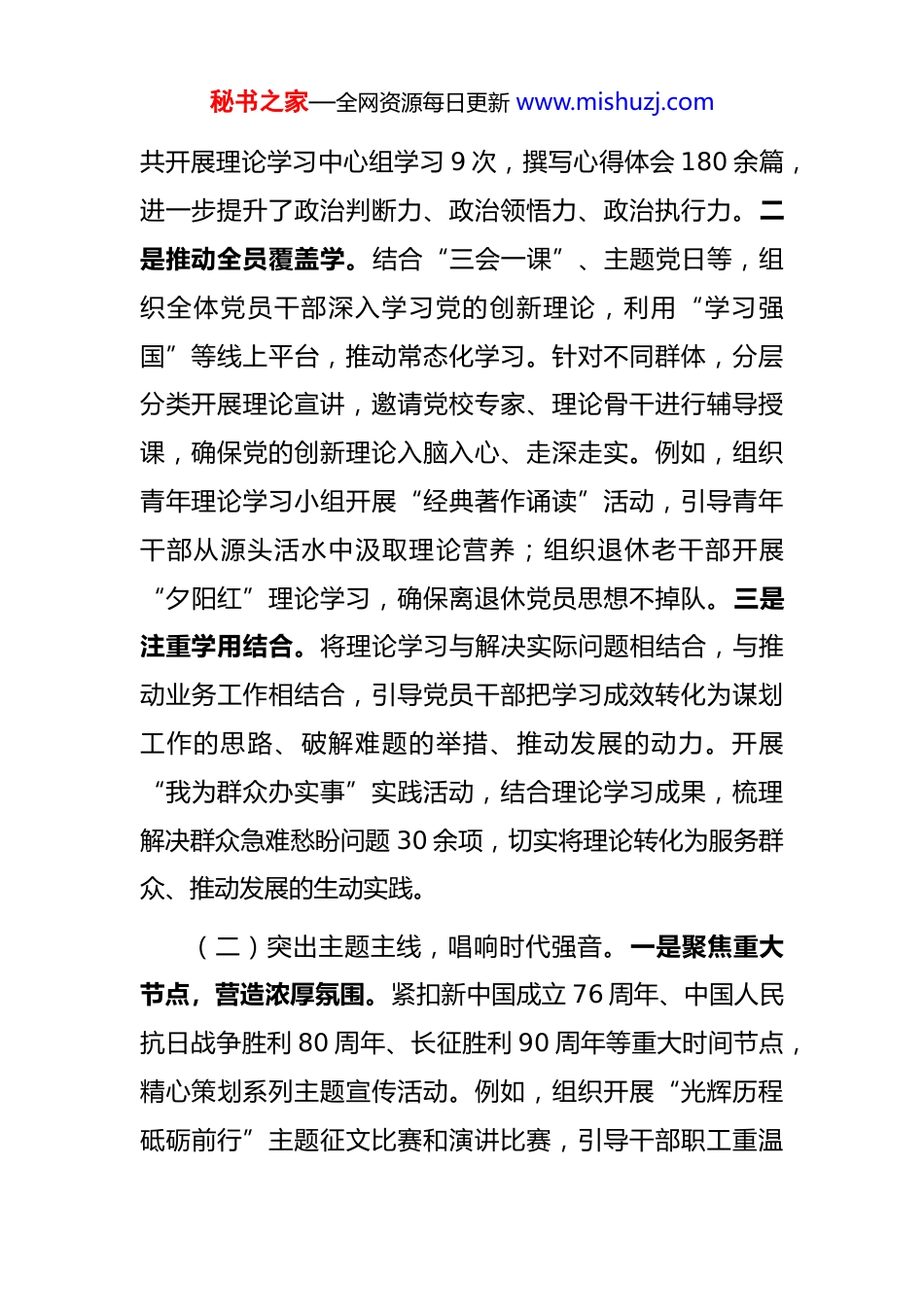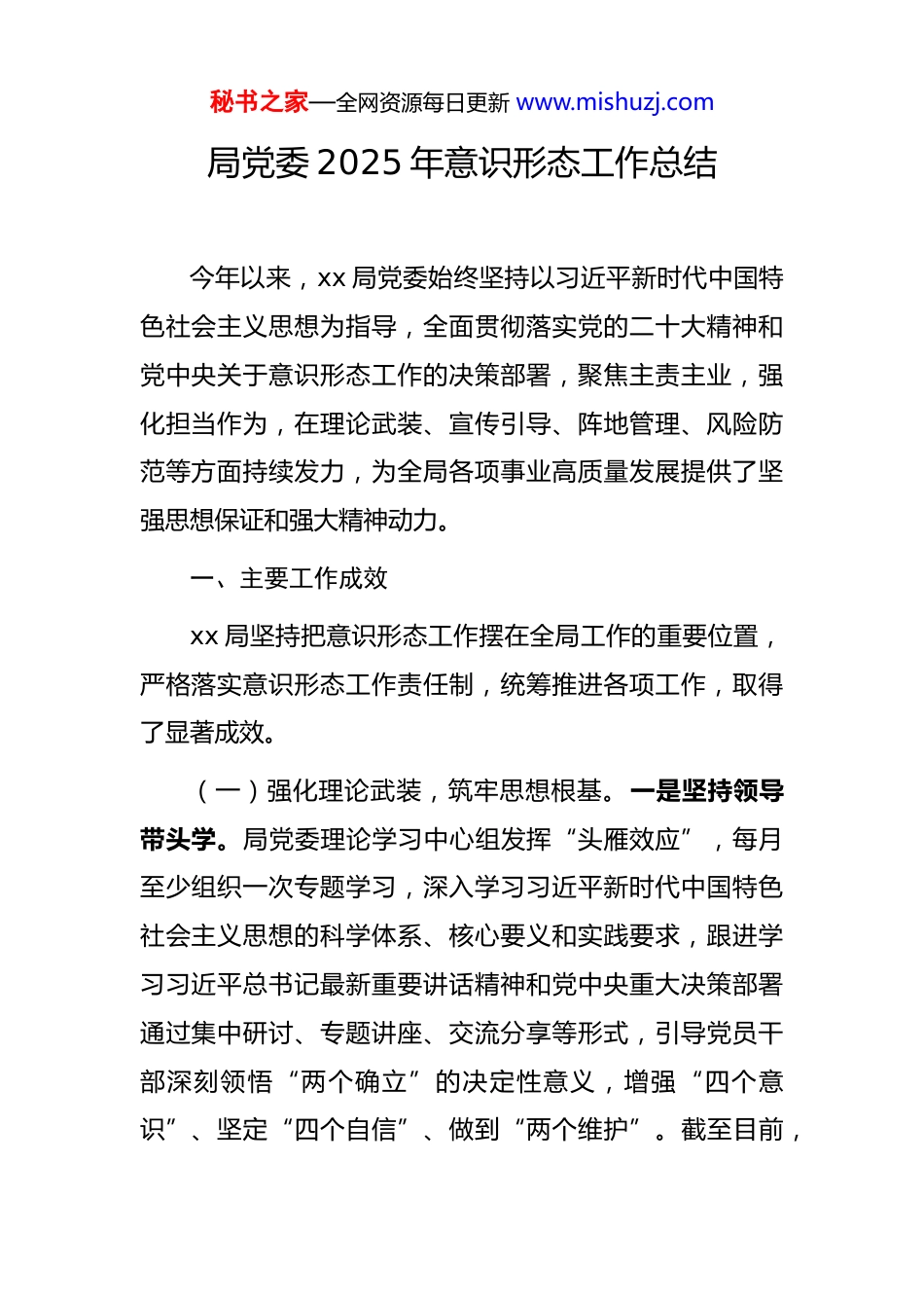 秘书之家—全网资源每日更新 www.mishuzj.com局党委 2025 年意识形态工作总结今年以来,xx 局党委始终坚持以习近平新时代中国特色社会主义思想为指导,全面贯彻落实党的二十大精神和党中央关于意识形态工作的决策部署,聚焦主责主业,强化担当作为,在理论武装、宣传引导、阵地管理、风险防范等方面持续发力,为全局各项事业高质量发展提供了坚强思想保证和强大精神动力。一、主要工作成效xx 局坚持把意识形态工作摆在全局工作的重要位置,严格落实意识形态工作责任制,统筹推进各项工作,取得了显著成效。(一)强化理论武装,筑牢思想根基。一是坚持领导带头学。局党委理论学习中心组发挥“头雁效应”,每月至少组织一次专题学习,深入学习习近平新时代中国特色社会主义思想的科学体系、核心要义和实践要求,跟进学习习近平总书记最新重要讲话精神和党中央重大决策部署通过集中研讨、专题讲座、交流分享等形式,引导党员干部深刻领悟“两个确立”的决定性意义,增强“四个意识”、坚定“四个自信”、做到“两个维护”。截至目前,秘书之家—全网资源每日更新 www.mishuzj.com共开展理论学习中心组学习 9 次,撰写心得体会 180 余篇,进一步提升了政治判断力、政治领悟力、政治执行力。二是推动全员覆盖学。结合“三会一课”、主题党日等,组织全体党员干部深入学习党的创新理论,利用“学习强国”等线上平台,推动常态化学习。针对不同群体,分层分类开展理论宣讲,邀请党校专家、理论骨干进行辅导授课,确保党的创新理论入脑入心、走深走实。例如,组织青年理论学习小组开展“经典著作诵读”活动,引导青年干部从源头活水中汲取理论营养;组织退休老干部开展“夕阳红”理论学习,确保离退休党员思想不掉队。三是注重学用结合。将理论学习与解决实际问题相结合,与推动业务工作相结合,引导党员干部把学习成效转化为谋划工作的思路、破解难题的举措、推动发展的动力。开展“我为群众办实事”实践活动,结合理论学习成果,梳理解决群众急难愁盼问题 30 余项,切实将理论转化为服务群众、推动发展的生动实践。(二)突出主题主线,唱响时代强音。一是聚焦重大节点,营造浓厚氛围。紧扣新中国成立 76 周年、中国人民抗日战争胜利 80 周年、长征胜利 90 周年等重大时间节点,精心策划系列主题宣传活动。例如,组织开展“光辉历程砥砺前行”主题征文比赛和演讲比赛,引导干部职工重温秘书之家—全网资源每日更新 www.mishuzj.com党史、新中国史,激发爱党爱国热情。举办“辉煌七十载奋进新时代”图片展,通过生动影像展现祖国发展成就和人民幸福生活。这些活动不仅丰富了干部职工的精神文化生活,更汇聚了同心同德、团结奋进的强大正能量。二是创新宣传形式,讲好 xx 故事。充分利用局官方网站、微信、内部刊物、宣传栏等多种平台载体,加大正面宣传力度。策划推出“岗位建功新时代”“身边的榜样”等专题报道深度挖掘先进典型和感人事迹,用鲜活案例和具体细节展现干部职工爱岗敬业、无私奉献的精神风貌。加强与主流媒体的沟通协作,积极投稿发声,对外展示 xx 局的良好形象和工作成效。前三季度,共在各级媒体刊发稿件 50 余篇,局微信推送信息 200 余条,累计阅读量突破 50 万次。三是深化精神文明创建,提升文明素养。以全国文明单位创建为抓手,持续深化社会主义核心价值观宣传教育,引导干部职工自觉践行文明风尚。开展“文明服务我先行”“志愿服务暖人心”等活动,组织干部职工积极参与社会公益事业,展现 xx 局的责任担当。通过形式多样的创建活动,全局干部职工的文明素养和道德水平得到显著提升,营造了积极向上、和谐友善的良好氛围。(三)坚持守正创新,繁荣文化阵地。一是加强文化产品供给。根据干部职工的精神文化需求,积极组织开展秘书之家—全网资源每日更新 www.mishuzj.com形式多样的文化活动。例如,举办“书香润心灵”读书分享会,引导干部职工多读书、读好书,提升人文素养。组织“强身健体活力 xx”职工运动会,丰富干部职工的业余生活。开展“廉洁文化进机关”系列活动,通过观看警示教育片、参观廉政教育基地等,筑牢思...
