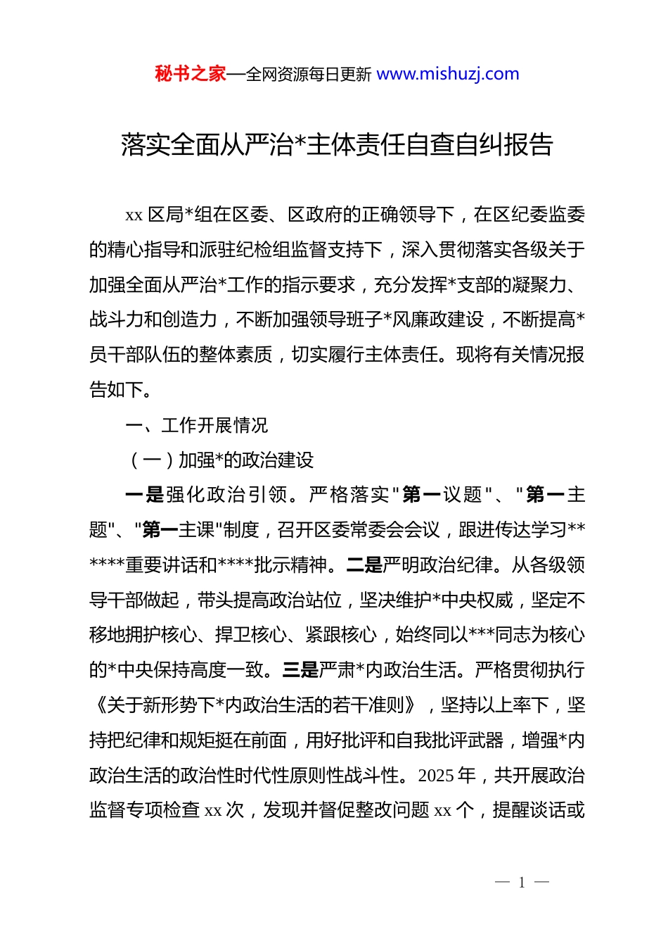 秘书之家—全网资源每日更新 www.mishuzj.com落实全面从严治*主体责任自查自纠报告xx 区局*组在区委、区政府的正确领导下,在区纪委监委的精心指导和派驻纪检组监督支持下,深入贯彻落实各级关于加强全面从严治*工作的指示要求,充分发挥*支部的凝聚力、战斗力和创造力,不断加强领导班子*风廉政建设,不断提高*员干部队伍的整体素质,切实履行主体责任。现将有关情况报告如下。一、工作开展情况(一)加强*的政治建设一是强化政治引领。严格落实 "第一议题"、"第一主题"、"第一主课"制度,召开区委常委会会议,跟进传达学习******重要讲话和****批示精神。二是严明政治纪律。从各级领导干部做起,带头提高政治站位,坚决维护*中央权威,坚定不移地拥护核心、捍卫核心、紧跟核心,始终同以***同志为核心的*中央保持高度一致。三是严肃*内政治生活。严格贯彻执行《关于新形势下*内政治生活的若干准则》,坚持以上率下,坚持把纪律和规矩挺在前面,用好批评和自我批评武器,增强*内政治生活的政治性时代性原则性战斗性。2025 年,共开展政治监督专项检查 xx 次,发现并督促整改问题 xx 个,提醒谈话或— 1 —秘书之家—全网资源每日更新 www.mishuzj.com约谈 xx 人,确保*的路线方针政策和决议执行到位。(二)强化*的思想建设一是加强理论学习。及时召开专题会议传达学习**************思想,全面学习把握落实*的二十大精神,按要求订阅*报*刊和 zt 教育书籍,通过中国教育干部网络学院、学习强国、灯塔-dj 在线等平台开展个人自主学习。年初切实制定*组理论学习中心组计划,开展集中学习 6 次,学习教育读书班集中学习研讨 2 次,并结合本单位工作实际,研究制定贯彻措施,形成工作任务清单,确保落地见效。二是强化*性教育。持续推进*员"三亮四比五作为"、机关*员"三强三创"等主题实践活动,结合学习宣传贯彻*的十九大精神,在全区基层*组织中广泛开展"跟着***重温一次入*誓词"、举办一次*的十九大精神知识竞赛、参观一次红色教育基地、开展一次"我心中的十九大"主题演讲等"四个一"主题*日活动。三是深化警示教育。组织*员干部观看警示教育片,参观廉政教育基地,加强廉洁文化建设。2025 年,共举办各类理论学习班 xx 期,培训*员干部 xx 人次,实现乡科级领导干部培训全覆盖。(三)夯实*的组织建设一是全面抓好基层 dj。树牢大抓基层、大抓基础鲜明导向,统筹机关、国企、事业单位等各领域 dj,探索加强"两企三— 2 —秘书之家—全网资源每日更新 www.mishuzj.com新"dj 有效路径,举办 2025 年新兴领域*组织书记第一期培训班,打造全市首例专门面向新就业群体的暖"新"公寓,不断扩大*的组织覆盖和工作覆盖。二是加强*组织领导班子建设。坚持"选优配强"原则,选拔了一批有思路、有能力、有担当的*组织书记,为基层 dj 工作提供了有力保障。三是优化*组织设置。以"服务型*组织"建设为引领,按照"地域相邻、行业相近、便于管理、利于服务"的原则,调整优化*组织设置,实现*组织全覆盖。2025 年,全区共设立*(总)支部 620 个,*小组 1500 个,实现了基层*组织的优化设置。(四)深化*的作风建设一是落实中央八项规定精神。认真贯彻执行中央八项规定精神及实施细则,持续深化作风建设,坚决防止"四风"问题反弹回潮。二是加强干部作风建设。开展干部作风整顿活动,针对存在的形式主义、官僚主义等问题,进行自查自纠,建立问题清单和整改台账,明确整改措施和整改时限,实行销号管理。三是加强机关效能建设。简化办事程序,提高办事效率,方便群众办事。四是开展作风建设调研。深入基层开展作风建设调研,了解群众需求,解决实际问题。2025 年,共开展作风建设调研 xx 次,收集群众意见 xx 条,整改问题 xx 个,群众满意度达 xx%。— 3 —秘书之家—全网资源每日更新 www.mishuzj.com(五)严明 d 的纪律建设一是加强纪律教育。坚持不懈用**************思想凝心铸魂,以"行百里者半九十"的严谨态度和务实作风坚持正风肃纪,锲而不舍落实中央八项规定精神,持续深化纠治"四风"。二是严格纪律执行。对违纪问题发现一起查处一起...