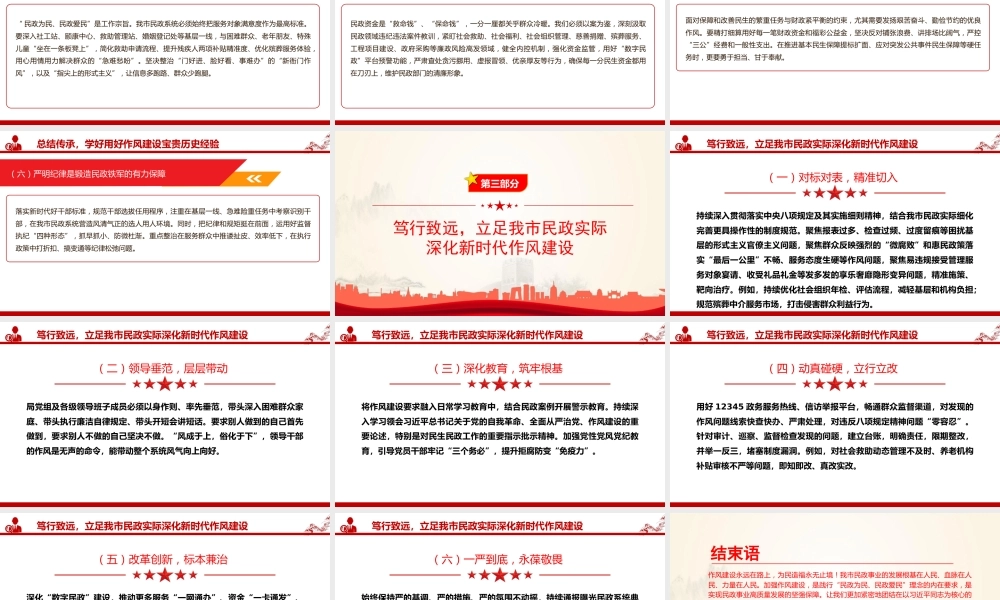 锲而不舍加强党的作风建设,为民政事业高质量发展提供坚强的作风保障授课人: XXX前 言 PREFACE习近平总书记指出,“自我革命是我们党跳出治乱兴衰历史周期率的第二个答案”,“从抓作风入手推进全面从严治党是新时代党的自我革命一条重要经验”。这为我们持之以恒加强作风建设提供了根本遵循。回首百年征程,特别是党的十八大以来的伟大变革,我们党始终坚持以马克思主义世界观方法论为指导,传承中华优秀传统文化精髓,形成了系统完备的作风建设理论与生动实践。深刻领悟其理论逻辑、历史逻辑、实践逻辑,对于我市民政系统锻造过硬作风、护航事业高质量发展,具有极端重要的现实意义。我们必须提高政治站位,增强抓好作风建设的政治自觉、思想自觉和行动自觉。目录 CONTENTS一、溯源固本,准确把握作风建设的理论根基与实践传承二、总结传承,学好用好作风建设宝贵历史经验三、笃行致远,立足我市民政实际深化新时代作风建设溯源固本,准确把握作风建设的理论根基与实践传承第一部分溯源固本,准确把握作风建设的理论根基与实践传承中华智慧中的“风”之哲思。从《诗经》的“观风知政”到孔子的“君子德风”,中华文明将自然之“风”升华为关乎政治伦理与社会风尚的核心概念。“风以动之,教以化之”(《毛诗序》),“上为之,下效之”(《白虎通义》)的理念,深刻揭示了执政者作风对社会风气的引领作用。这对我们我市民政人而言,意味着我们的一言一行、一举一动,都代表着党和政府在困难群众、服务对象心中的形象,是引领社会风气向善的重要力量。我们在养老服务、儿童福利、社会救助、社区服务等窗口岗位的作风,直接影响着群众对公平正义的感知。溯源固本,准确把握作风建设的理论根基与实践传承马克思主义经典作家的警示。马克思、恩格斯、列宁都高度重视政党风气。恩格斯直言“又吃又喝…议论一番,这根本不是我的作风”,列宁则坚决要求“打倒装腔作势的作风”、“同官僚主义和官僚作风进行斗争”。这些论述直指作风问题的要害,警示我们必须时刻警惕脱离群众、形式主义、官僚主义等顽疾对民政公信力的侵蚀。特别是在管理使用庞大的民生资金、分配公共资源时,更需要清正廉洁、务实高效的作风作保障。溯源固本,准确把握作风建设的理论根基与实践传承共产党人一脉相承优良传统。毛泽东同志系统构建作风建设理论,提出“党风正,则民风淳”,确立“三大作风”与“两个务必”。邓小平同志在新时期强调“端正党的作风,具有决定的意义”。习近平总书记更是指出,“作风问题任何时候都不能掉以轻心”,“如果不坚决纠正不良风气,我们党就会失去根基、失去血脉、失去力量”。这些重要论述鞭策我们我市民政人必须将作风建设作为生命线,以“赶考”的清醒为民政对象提供更贴心、更精准的服务。我们要清醒认识到,民政工作点多线长面广,资金密集、资源富集、政策关联度高,作风建设稍有松懈,就可能滋生腐败,损害群众切身利益。总结传承,学好用好作风建设宝贵历史经验第二部分(一)实事求是是贯穿我市民政实践的生命线 坚持一切从实际出发,是破解难题的金钥匙。新时代我市民政事业发展面临人口老龄化加速、困难群体需求多元化、基层治理精细化要求提升等新挑战。我们必须大兴调查研究之风,深入开展“大走访、深调研、解难题、促发展”活动,精准掌握低保边缘群体、失能半失能老人、困境儿童、流浪乞讨人员的真实需求和痛点堵点,坚决反对“一刀切”、“拍脑袋”决策,确保救助政策精准滴灌、养老服务有效供给、社区治理切合民意。例如,在推进长者饭堂提质增效、家庭养老床位建设、社区慈善基金运作等工作中,必须基于真实数据和群众反馈不断调整优化。总结传承,学好用好作风建设宝贵历史经验(二)理论联系实际是提升履职能力的压舱石 学习党的创新理论特别是习近平总书记关于民生民政工作的重要论述,关键在于武装头脑、指导实践、推动工作。我们要坚决摒弃学用脱节、“两张皮”现象,将学习成果转化为推动我市“慈善之城”、“长者饭堂”升级、困境儿童计划深化、流浪乞讨人员源头治理等品牌工作的具体思路和举措。避免为了学习而学习,确保学以致用。总结传承...