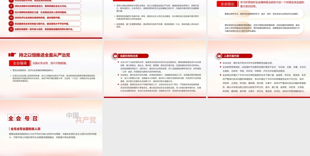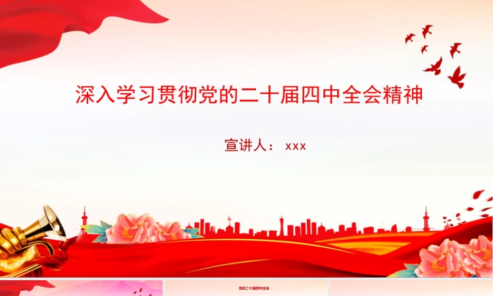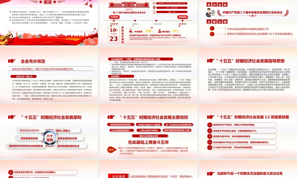 宣讲人: xxx深入学习贯彻党的二十届四中全会精神前言 出席这次全会的有,中央委员 168 人,候补中央委员 147 人。中央纪律检查委员会常务委员会委员和有关方面负责同志列席会议。党的二十大代表中部分基层同志和专家学者也列席了会议。 全会由中央政治局主持。中央委员会总书记习近平作了重要讲话。 全会听取和讨论了习近平受中央政治局委托所作的工作报告,审议通过了《中共中央关于制定国民经济和社会发展第十五个五年规划的建议》。习近平就《建议(讨论稿)》向全会作了说明。党的二十届四中全会候补委员中国共产党第二十届中央委员会第四次全体会议召开时间: 2025 年 10 月 20 日至 23 日北京 · 人民大会堂会期: 4 天10 月 20日10 月 21日10 月 22 日10 月 23日 开会时间 闭会时间参加会议情况中央委员168 人147 人全会由中央政治局主持。中央委员会总书记习近平作了重要讲话。中央纪律检查委员会常务委员会委员和有关方面负责同志列席会议。党的二十大代表中部分基层同志和专家学者也列席了会议。10月October23会议全称中国共产党第二十届中央委员会第四次全体会议主要议程中共中央政治局向中央委员会报告工作1研究关于制定国民经济和社会发展第十五个五年规划的建议。2全会充分肯定全会充分肯定党的二十届三中全会以来中央政治局的工作。 全会认为一致认为中央政治局认真落实党的二十大和二十届历次全会精神,坚持稳中求进工作总基调,完整准确全面贯彻新发展理念,统筹推进“五位一体”总体布局,协调推进“四个全面”战略布局,统筹国内国际两个大局,统筹发展和安全,进一步全面深化改革,扎实推动高质量发展,推进社会主义民主法治建设,加强宣传思想文化工作,切实抓好民生保障和生态环境保护,维护国家安全和社会稳定,开展深入贯彻中央八项规定精神学习教育、纵深推进全面从严治党,加强国防和军队现代化建设,做好港澳工作和对台工作,深入推进中国特色大国外交,推动经济持续回升向好,“十四五”主要目标任务即将胜利完成。隆重纪念中国人民抗日战争暨世界反法西斯战争胜利 80周年,极大振奋民族精神、激发爱国热情、凝聚奋斗力量。全会高度评价“十四五”时期我国发展取得的重大成就。 “ 十四五”时期我国发展历程极不寻常、极不平凡。 面对错综复杂的国际形势和艰巨繁重的国内改革发展稳定任务,以习近平同志为核心的党中央团结带领全党全国各族人民,迎难而上、砥砺前行,经受住世纪疫情严重冲击,有效应对一系列重大风险挑战,推动党和国家事业取得新的重大成就。 我国经济实力、科技实力、综合国力跃上新台阶,中国式现代化迈出新的坚实步伐,第二个百年奋斗目标新征程实现良好开局。全会指出实现社会主义现代化是一个阶梯式递进、不断发展进步的历史过程,需要不懈努力、接续奋斗。“十五五”时期是基本实现社会主义现代化夯实基础、全面发力的关键时期,在基本实现社会主义现代化进程中具有承前启后的重要地位。“十五五”时期我国发展环境面临深刻复杂变化,我国发展处于战略机遇和风险挑战并存、不确定难预料因素增多的时期。我国经济基础稳、优势多、韧性强、潜能大,长期向好的支撑条件和基本趋势没有变,中国特色社会主义制度优势、超大规模市场优势、完整产业体系优势、丰富人才资源优势更加彰显。全党要深刻领悟“两个确立”的决定性意义,增强“四个意识”、坚定“四个自信”、做到“两个维护”,保持战略定力,增强必胜信心,积极识变应变求变,敢于斗争、善于斗争,勇于面对风高浪急甚至惊涛骇浪的重大考验,以历史主动精神克难关、战风险、迎挑战,集中力量办好自己的事,续写经济快速发展和社会长期稳定两大奇迹新篇章,奋力开创中国式现代化建设新局面。“ 十五五”时期经济社会发展指导思想全会强调,“十五五”时期经济社会发展,必须坚持马克思列宁主义、毛泽东思想、邓小平理论、“三个代表”重要思想、科学发展观,全面贯彻习近平新时代中国特色社会主义思想,深入贯彻党的二十大和二十届历次全会精神,围绕全面建成社会主义现代化强国、实现第二个百年奋斗目标,以中国式现...