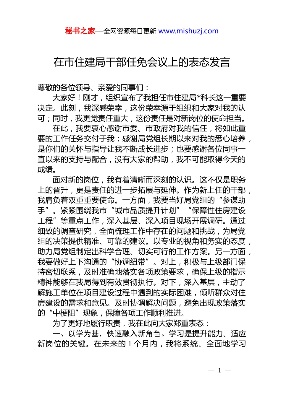 秘书之家—全网资源每日更新 www.mishuzj.com在市住建局干部任免会议上的表态发言尊敬的各位领导、亲爱的同事们:大家好!刚才,组织宣布了我担任市住建局*科长这一重要决定。此刻,我深感荣幸,这份荣幸源于组织和大家对我的认可;同时,我更觉责任重大,这份责任是对新岗位的使命担当。在此,我要衷心感谢市委、市政府对我的信任,将如此重要的工作任务交付于我;感谢局党组长期以来对我的悉心培养,是你们的关怀与指导让我不断成长进步;也要感谢各位同事一直以来的支持与配合,没有大家的帮助,我不可能取得今天的成绩。面对新的岗位,我有着清晰而深刻的认识。这不仅是职务上的晋升,更是责任的进一步拓展与延伸。作为新上任的干部,我肩负着双重重要使命。一方面,我要当好局党组的“参谋助手”。紧紧围绕我市“城市品质提升计划”“保障性住房建设工程”等重点工作,深入基层、深入项目现场开展调研。通过细致的调查研究,全面梳理工作中存在的问题和挑战,为局党组的决策提供精准、可靠的建议。以专业的视角和务实的态度,助力局党组制定出科学合理、切实可行的工作方案。另一方面,我要做好上下沟通的“协调纽带”。对上,积极与上级部门保持密切联系,及时准确地落实各项政策要求,确保上级的指示精神能够在我局得到有效贯彻执行。对下,深入基层,主动了解施工单位在项目建设过程中遇到的实际困难,倾听群众对住房建设的需求和意见。及时协调解决问题,避免出现政策落实的“中梗阻”现象,保障各项工作顺利推进。为了更好地履行职责,我在此向大家郑重表态:一、以学为基,快速融入新角色。学习是提升能力、适应新岗位的关键。在未来的 1 个月内,我将系统、全面地学习— 1 —秘书之家—全网资源每日更新 www.mishuzj.com《建筑工程质量管理条例》《城市规划法》等相关政策文件,深入领会其精神实质和具体要求,为工作开展提供坚实的理论支撑。每周至少抽出 1 次时间,向局长和其他副局长请教工作思路和方法,学习他们的宝贵经验和领导艺术。同时,计划在3 个月内走遍全市 25 个在建重点项目现场,详细了解项目的进展情况、存在的问题以及施工工艺等,尽快熟悉全局的业务流程和工作重点,以最快的速度融入新的工作环境。二、以干为先,全力推动工作进展。实干是成就事业的根本。针对当前保障性住房建设进度缓慢的问题,我将迅速牵头成立专项工作组,明确各成员的职责分工,制定详细的工作计划和时间表。每周召开 1 次进度调度会,及时掌握项目进展情况,协调解决建材供应短缺、施工人员不足等难点问题。加强与相关部门的沟通协作,争取政策支持和资源保障,确保今年11 月底前完成 10 个保障性住房项目的建设任务,让更多的群众能够早日住上安心房。同时,积极推动党建与业务深度融合,在重点项目中成立党员先锋队,充分发挥党员的先锋模范作用,以党建引领业务发展,为住房建设工作注入强大的精神动力。三、以廉为绳,坚守廉洁自律底线。廉洁是从政的基本准则。我将始终牢记“公生明,廉生威”的古训,严格执行廉洁自律的各项规定。在工程招标、物资采购、资金拨付等关键环节,坚决做到按制度办事、按程序操作,不搞任何特殊化。自觉接受纪检部门和同事们的监督,主动公开工作信息,确保权力在阳光下运行。坚决杜绝利用职务之便谋取私利的行为,保持清正廉洁的政治本色,树立良好的干部形象。四、以和为贵,凝聚团队强大合力。团结是做好工作的重要保障。我将尊重班子成员的意见和建议,积极配合局长做好全局的统筹协调工作。在工作中,充分发扬民主,不搞“一言堂”。对于分管科室的工作,多倾听基层干部和施工人员的想法,鼓励大家积极参与决策和管理。营造一个“心往一处想、— 2 —秘书之家—全网资源每日更新 www.mishuzj.com劲往一处使”的良好工作氛围,让每一位同事都能在和谐的环境中充分发挥自己的才能,共同为市住建局的发展贡献力量。最后,我想说,今天的提拔对我而言,不是终点,而是一个全新的起点。在未来的工作中,我将以“时时放心不下”的责任感和使命感,脚踏实地、真抓实干,干干净净做人、兢兢业业做事。我会用实实在在的工作...