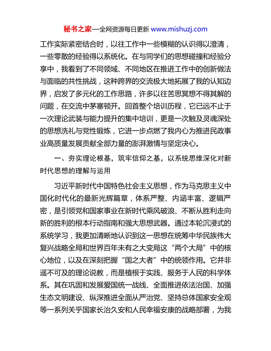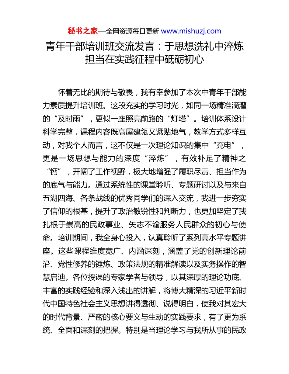 秘书之家—全网资源每日更新 www.mishuzj.com青年干部培训班交流发言:于思想洗礼中淬炼担当在实践征程中砥砺初心怀着无比的期待与敬畏,我有幸参加了本次中青年干部能力素质提升培训班。这段充实的学习时光,如同一场精准滴灌的“及时雨”,更似一座照亮前路的“灯塔”。培训体系设计科学完整,课程内容既高屋建瓴又紧贴地气,教学方式多样互动,对我个人而言,这不仅是一次理论知识的集中“充电”,更是一场思想与能力的深度“淬炼”,有效补足了精神之“钙”,开阔了工作视野,极大地增强了履职尽责、担当作为的底气与能力。通过系统性的课堂聆听、专题研讨以及与来自五湖四海、各条战线的优秀同学们的深入交流,我进一步夯实了信仰的根基,提升了政治敏锐性和判断力,也更加坚定了我扎根于崇高的民政事业、矢志不渝服务人民群众的初心与使命。培训期间,我全身心投入,认真聆听了系列高水平专题讲座。这些课程维度宽广、内涵深刻,涵盖了党的创新理论前沿、党性修养的锤炼、政策法规的精准解读以及实务操作的智慧启迪。各位授课的专家学者与领导,以其深厚的理论功底、丰富的实践经验和深入浅出的讲解,将博大精深的习近平新时代中国特色社会主义思想讲得透彻、说得明白,使我对其宏大的时代背景、严密的核心要义与生动的实践要求,有了更为系统、全面和深刻的把握。特别是当理论学习与我所从事的民政秘书之家—全网资源每日更新 www.mishuzj.com工作实际紧密结合时,以往工作中一些模糊的认识得以澄清,一些零散的经验得以系统化。在与同学们的思想碰撞和经验分享中,我看到了不同领域、不同地区在推进工作中的创新做法与面临的共性挑战,这种跨界的交流极大地拓展了我的认知边界,启发了多元化的工作思路,许多以往苦思冥想不得其解的问题,在交流中茅塞顿开。回首整个培训历程,它已远不止于一次理论武装与能力提升的集中培训,更是一次触及灵魂深处的思想洗礼与党性锻炼,它进一步点燃了我内心为推进民政事业高质量发展贡献全部力量的澎湃激情与坚定决心。一、夯实理论根基,筑牢信仰之基,以系统思维深化对新时代思想的理解与运用习近平新时代中国特色社会主义思想,作为马克思主义中国化时代化的最新光辉篇章,体系严整、内涵丰富、逻辑严密,是引领党和国家事业在新时代乘风破浪、不断从胜利走向新的胜利的根本行动指南和强大思想武器。通过本轮沉浸式的系统学习,我更加清晰地认识到这一思想在统筹中华民族伟大复兴战略全局和世界百年未有之大变局这“两个大局”中的核心地位,以及在深刻把握“国之大者”中的统领作用。它并非遥不可及的理论说教,而是植根于实践、服务于人民的科学体系。其在巩固和发展爱国统一战线、全面推进依法治国、加强生态文明建设、纵深推进全面从严治党、坚持总体国家安全观等一系列关乎国家长治久安和人民幸福安康的战略部署,为我秘书之家—全网资源每日更新 www.mishuzj.com们开展各项民政工作提供了全方位、立体化、根本性的思想指引与实践路径。例如,从统一战线的维度审视,民政工作作为党和政府密切联系人民群众的“最后一公里”,天然具有团结人、凝聚人的功能。我们必须善于运用统战思维,广泛凝聚社会各界的共识,有效整合各类资源与力量,积极构建人人有责、人人尽责、人人享有的共建共治共享的社会治理新格局。在法治建设的宏大背景下,民政干部必须率先垂范,善于运用法治思维和法治方式来谋划和推进工作,无论是在社会救助的精准实施、残疾人权益的切实保障,还是在社区治理的规范运行中,都要确保每一项政策、每一次执行都在法治的轨道上和阳光的监督下运行,让公平正义以看得见的方式惠及每一位群众。在推动绿色发展的时代浪潮中,民政领域的殡葬改革同样肩负着重要使命,必须坚决贯彻生态文明理念,积极倡导和推广节地、生态、环保的安葬方式,移风易俗,为建设美丽中国贡献民政力量。尤为重要的是,必须将坚持和加强党的全面领导这一根本原则,贯穿于民政工作的全过程、各方面,以高质量党建引领和保障业务的高质量发展,同时要时刻保持清醒头脑,坚决防范化解民政领域可能存在的各类风险隐患,牢牢筑起民生保障的安全...
