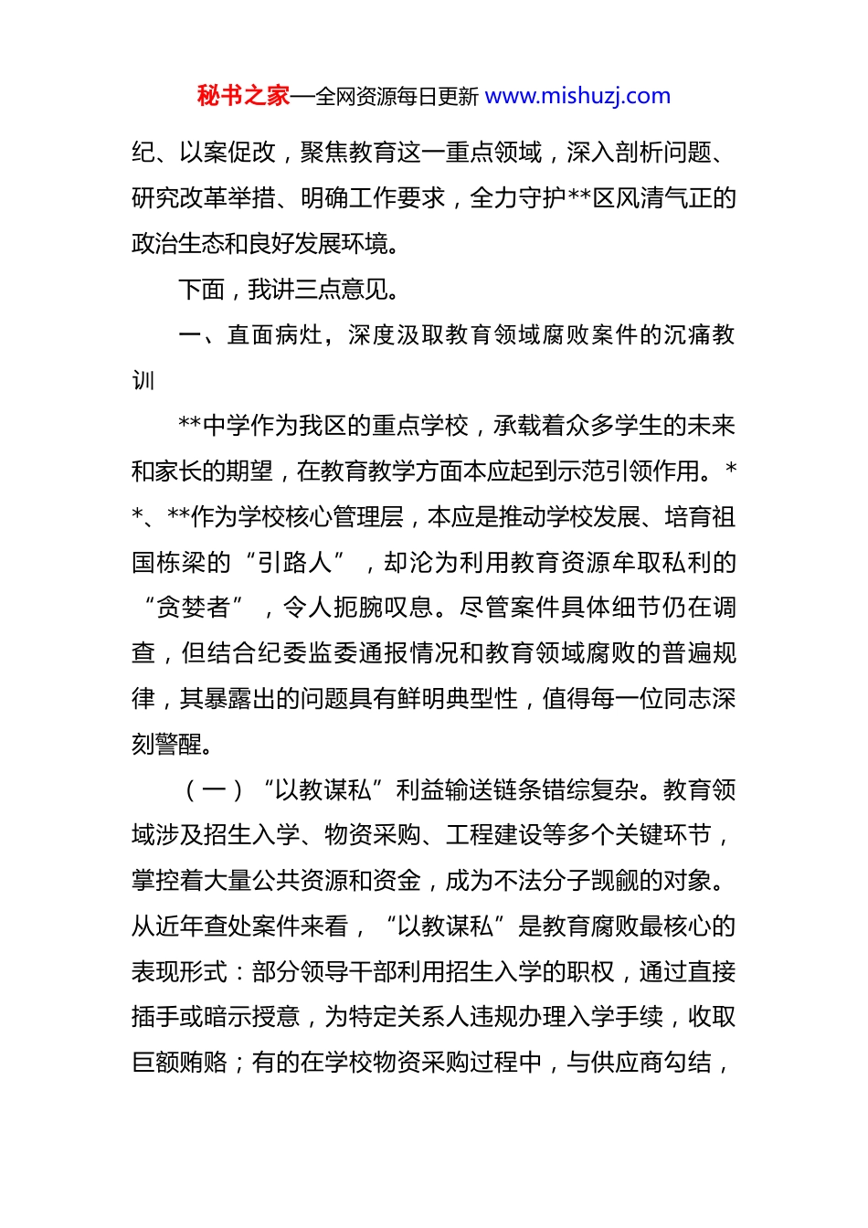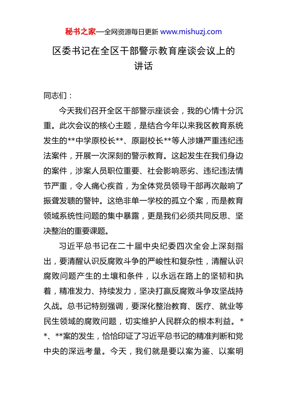 秘书之家—全网资源每日更新 www.mishuzj.com区委书记在全区干部警示教育座谈会议上的讲话 同志们:今天我们召开全区干部警示座谈会,我的心情十分沉重。此次会议的核心主题,是结合今年以来我区教育系统发生的**中学原校长**、原副校长**等人涉嫌严重违纪违法案件,开展一次深刻的警示教育。这起发生在我们身边的案件,涉案人员职位重要、社会影响恶劣、违纪违法情节严重,令人痛心疾首,为全体党员领导干部再次敲响了振聋发聩的警钟。这绝非单一学校的孤立个案,而是教育领域系统性问题的集中暴露,更是我们必须共同反思、坚决整治的重要课题。习近平总书记在二十届中央纪委四次全会上深刻指出,要清醒认识反腐败斗争的严峻性和复杂性,清醒认识腐败问题产生的土壤和条件,以永远在路上的坚韧和执着,精准发力、持续发力,坚决打赢反腐败斗争攻坚战持久战。总书记特别强调,要深化整治教育、医疗、就业等民生领域的腐败问题,切实维护人民群众的根本利益。**、**案的发生,恰恰印证了习近平总书记的精准判断和党中央的深远考量。今天,我们就是要以案为鉴、以案明秘书之家—全网资源每日更新 www.mishuzj.com纪、以案促改,聚焦教育这一重点领域,深入剖析问题、研究改革举措、明确工作要求,全力守护**区风清气正的政治生态和良好发展环境。下面,我讲三点意见。一、直面病灶,深度汲取教育领域腐败案件的沉痛教训**中学作为我区的重点学校,承载着众多学生的未来和家长的期望,在教育教学方面本应起到示范引领作用。**、**作为学校核心管理层,本应是推动学校发展、培育祖国栋梁的“引路人”,却沦为利用教育资源牟取私利的“贪婪者”,令人扼腕叹息。尽管案件具体细节仍在调查,但结合纪委监委通报情况和教育领域腐败的普遍规律,其暴露出的问题具有鲜明典型性,值得每一位同志深刻警醒。(一)“以教谋私”利益输送链条错综复杂。教育领域涉及招生入学、物资采购、工程建设等多个关键环节,掌控着大量公共资源和资金,成为不法分子觊觎的对象。从近年查处案件来看,“以教谋私”是教育腐败最核心的表现形式:部分领导干部利用招生入学的职权,通过直接插手或暗示授意,为特定关系人违规办理入学手续,收取巨额贿赂;有的在学校物资采购过程中,与供应商勾结,秘书之家—全网资源每日更新 www.mishuzj.com抬高采购价格,从中谋取私利;还有的在学校工程建设项目中,利用职务之便,为施工方提供便利,收受回扣。涉案学校在招生、采购等环节本就备受社会关注,背后极可能存在类似利益输送网络,严重破坏了教育公平和学校的正常教学秩序。(二)“师德失范”行为严重损害教育形象。教师是人类灵魂的工程师,师德是教师的立身之本。然而,部分涉案人员师德严重失范,不仅没有履行好教书育人的职责,反而做出违背道德和法律的行为。他们在课堂上敷衍了事,却热衷于课外有偿补课;对学生区别对待,对送礼品、送红包的学生关爱有加,对普通学生则冷漠忽视。这种行为严重损害了教师的形象,伤害了学生的心灵,也让社会对教育行业产生了质疑。我们必须认识到,师德师风建设是教育事业发展的基石,一旦师德滑坡,教育的公信力将荡然无存。(三)“监管缺失”导致权力运行失控。在教育领域,一些学校的监管机制形同虚设,对权力运行缺乏有效地制约和监督。学校的重大决策往往由少数人说了算,民主集中制得不到有效落实。财务管理制度不健全,资金使用缺乏透明度,为腐败行为提供了可乘之机。同时,上级主管部门对学校的监管也存在漏洞,对学校的财务状况、秘书之家—全网资源每日更新 www.mishuzj.com招生情况等缺乏深入检查和监督,未能及时发现和纠正存在的问题。这种监管缺失使得权力在缺乏约束的环境中运行,极易滋生腐败现象。二、猛药去疴,全面推进教育领域腐败问题专项整治针对教育领域存在的腐败问题,我们必须采取有力措施,进行全面深入的专项整治,坚决遏制腐败现象的滋生蔓延。(一)加强制度建设,扎紧权力运行的笼子。制度是管根本、管长远的。我们要建立健全教育领域的各项规章制度,完善招生入学、物资采购、工程建设等关键环节的监管制度。明确权力运行的流程和标...