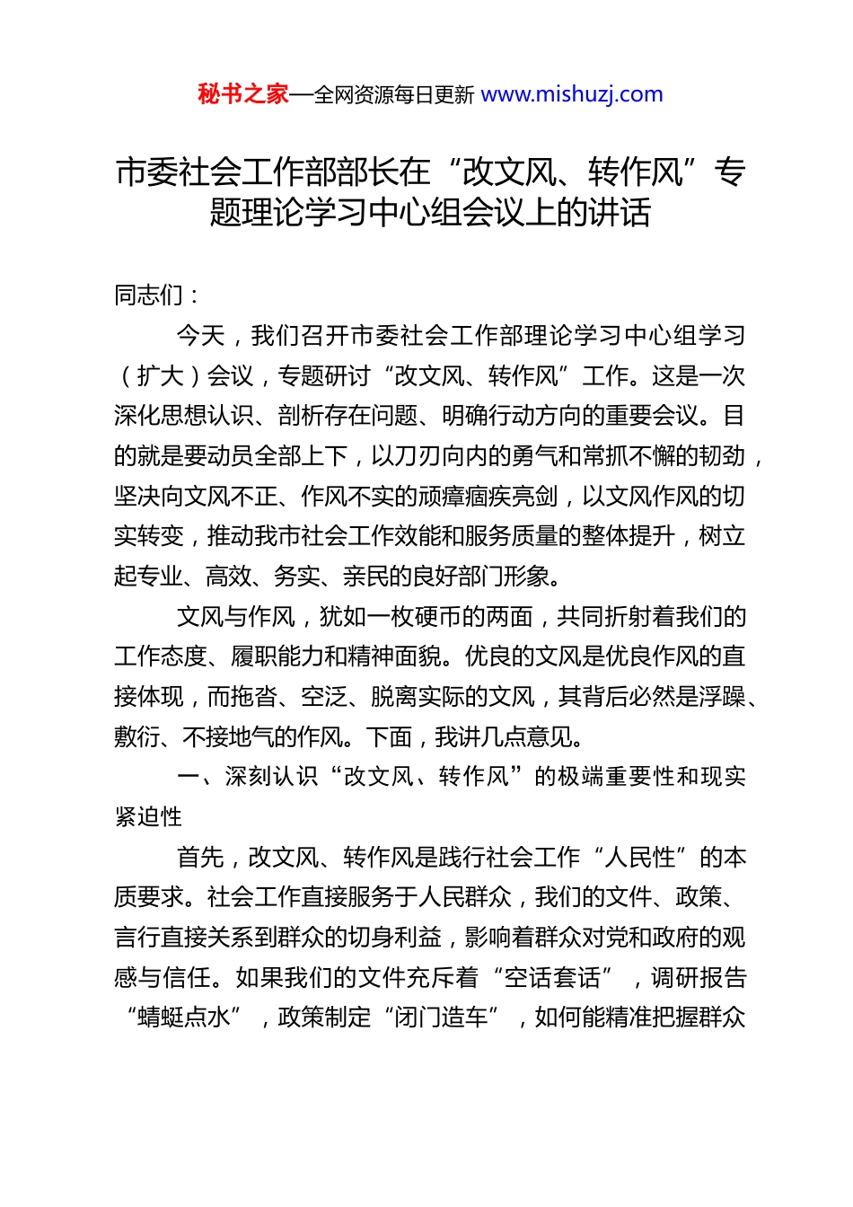 秘书之家—全网资源每日更新 www.mishuzj.com市委社会工作部部长在“改文风、转作风”专题理论学习中心组会议上的讲话同志们:今天,我们召开市委社会工作部理论学习中心组学习(扩大)会议,专题研讨“改文风、转作风”工作。这是一次深化思想认识、剖析存在问题、明确行动方向的重要会议。目的就是要动员全部上下,以刀刃向内的勇气和常抓不懈的韧劲,坚决向文风不正、作风不实的顽瘴痼疾亮剑,以文风作风的切实转变,推动我市社会工作效能和服务质量的整体提升,树立起专业、高效、务实、亲民的良好部门形象。文风与作风,犹如一枚硬币的两面,共同折射着我们的工作态度、履职能力和精神面貌。优良的文风是优良作风的直接体现,而拖沓、空泛、脱离实际的文风,其背后必然是浮躁、敷衍、不接地气的作风。下面,我讲几点意见。一、深刻认识“改文风、转作风”的极端重要性和现实紧迫性首先,改文风、转作风是践行社会工作“人民性”的本质要求。社会工作直接服务于人民群众,我们的文件、政策、言行直接关系到群众的切身利益,影响着群众对党和政府的观感与信任。如果我们的文件充斥着“空话套话”,调研报告“蜻蜓点水”,政策制定“闭门造车”,如何能精准把握群众秘书之家—全网资源每日更新 www.mishuzj.com需求?如何能有效解决基层难题?近期其他地区暴露出的公文抄袭问题,如将外地材料简单套用甚至地名都未修改的案例,警示我们文风不正不仅是能力问题,更是对党和人民事业极不负责的表现,必须引以为戒。其次,改文风、转作风是提升社会治理效能的迫切需要。当前,社会治理面临诸多新挑战,基层“小马拉大车”现象依然存在,新业态新就业群体服务管理、社区精准化精细化治理等课题亟待破解。破解这些难题,需要的是察实情、出实招、求实效的务实作风。而形式主义的文风,如“文山会海”、“过度留痕”,不仅无助于解决问题,反而会耗费基层干部本可用于服务群众的宝贵时间和精力,必须下大力气整治。再次,改文风、转作风是锻造过硬社会工作铁军的内在要求。一支作风优良、能打硬仗的队伍,必然崇尚实干、注重实绩。部机关全体干部,特别是领导干部,必须带头摒弃“长、空、假”的陋习,树立“短、实、新”的风气,把心思和精力用到调查研究、解决问题、推动发展上来,这才是我们队伍保持先进性和战斗力的关键。二、聚焦突出问题,以钉钉子精神狠抓文风作风整改针对当前文风、作风方面存在的突出问题,我们必须拿出硬招实招,精准发力,务求实效。一要坚决向公文抄袭、“山寨”文稿亮剑。公文是实施领导、履行职能、处理公务的重要工具,其生命力在于针对性秘书之家—全网资源每日更新 www.mishuzj.com和可操作性。要立即组织开展一次部门内部的“公文清源”核查行动,对近一年来的重要政策文件、规划方案、调研报告等进行自查自纠,重点核查是否存在照搬照抄上级文件、盲目套用外地经验、内容严重脱离本地实际等问题。要健全公文起草、审核、签发全流程责任机制,严格执行四级审核制度,压实起草人、科室负责人、分管领导、办公室核稿各环节责任。要探索引入技术辅助手段,对重要公文进行原创性筛查。同时,要规范第三方服务外包管理,明确单位对第三方文稿的实质性审核责任,绝不能让“服务外包”成为“责任外包”。二要持续深化整治形式主义,切实为基层减负。要严格落实中央及省市关于整治形式主义为基层减负的各项规定,严控文件数量,能不发的文坚决不发,能合并的发文合并办理,确保年度发文总量只减不增。要提升文件质量,倡导“短、实、新”的文风,部署专项工作的文件原则上不超过规定字数,坚决杜绝“穿靴戴帽”、冗长空洞。要大力精简会议,提倡开短会、开套会、开管用的会,全面推行“无会周”“无会日”,让干部从“会海”中解脱出来,有更多时间深入基层抓落实。要整治“指尖上的形式主义”,清理规范各类政务 APP、工作群组,杜绝重复填报、多头报送。三要大兴调查研究之风,以扎实调研支撑务实文风。大力倡导“不调研不决策”的原则。要推动干部深入基层一线,像我们之前开展的“我陪新就业群体上一天班”体验式调研那秘书之家—全网资源每日更新 ...