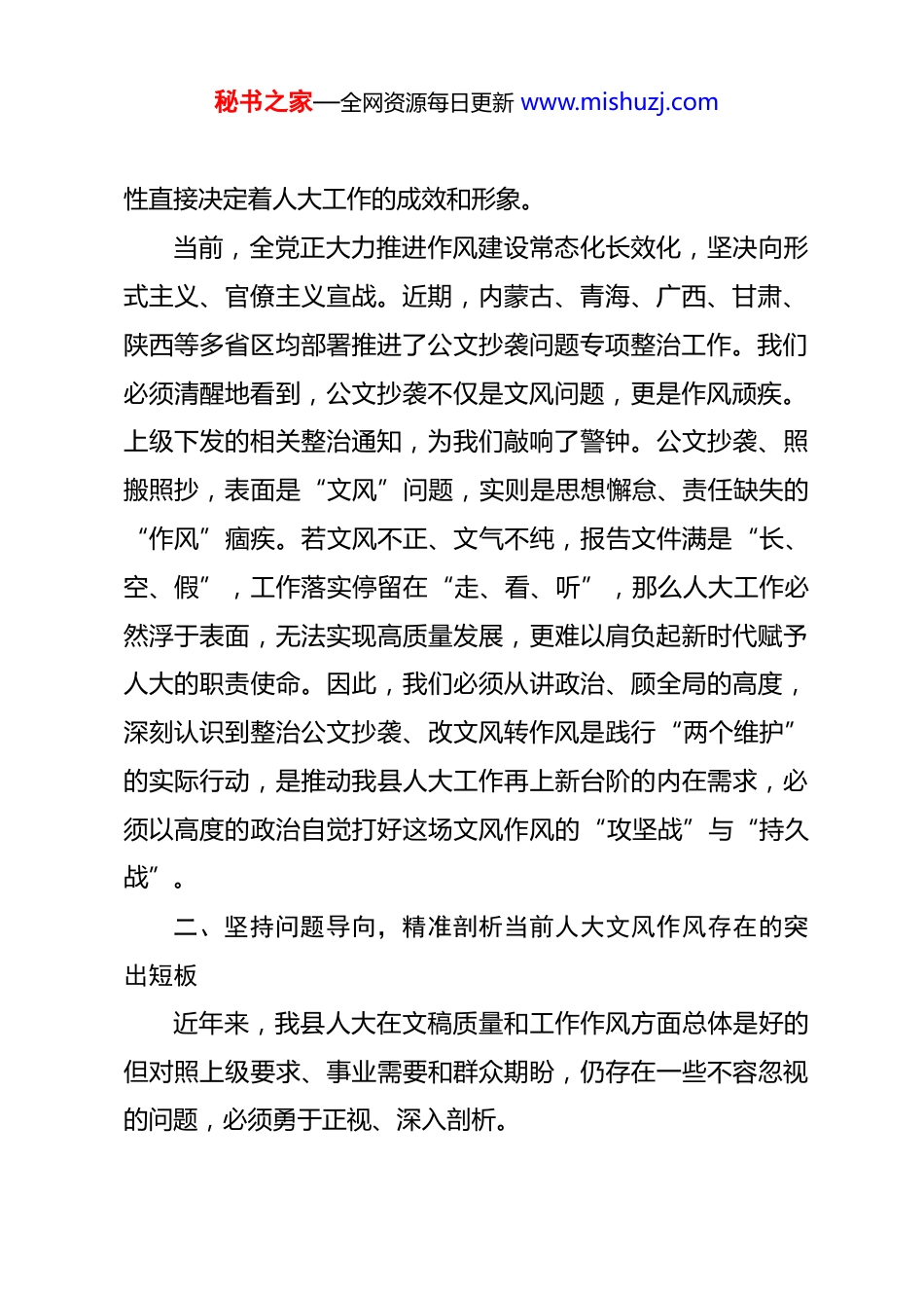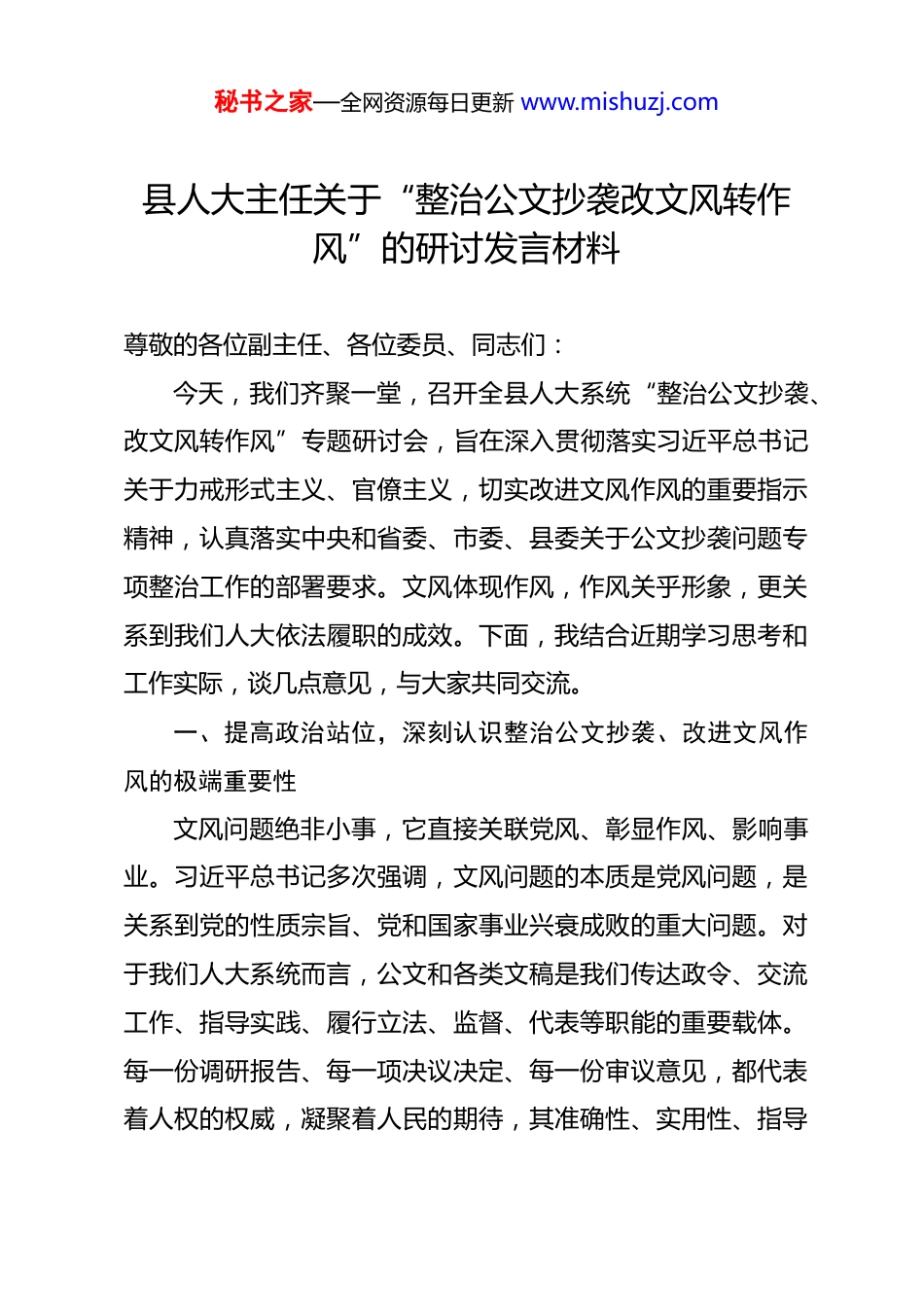 秘书之家—全网资源每日更新 www.mishuzj.com县人大主任关于“整治公文抄袭改文风转作风”的研讨发言材料尊敬的各位副主任、各位委员、同志们:今天,我们齐聚一堂,召开全县人大系统“整治公文抄袭、改文风转作风”专题研讨会,旨在深入贯彻落实习近平总书记关于力戒形式主义、官僚主义,切实改进文风作风的重要指示精神,认真落实中央和省委、市委、县委关于公文抄袭问题专项整治工作的部署要求。文风体现作风,作风关乎形象,更关系到我们人大依法履职的成效。下面,我结合近期学习思考和工作实际,谈几点意见,与大家共同交流。一、提高政治站位,深刻认识整治公文抄袭、改进文风作风的极端重要性文风问题绝非小事,它直接关联党风、彰显作风、影响事业。习近平总书记多次强调,文风问题的本质是党风问题,是关系到党的性质宗旨、党和国家事业兴衰成败的重大问题。对于我们人大系统而言,公文和各类文稿是我们传达政令、交流工作、指导实践、履行立法、监督、代表等职能的重要载体。每一份调研报告、每一项决议决定、每一份审议意见,都代表着人权的权威,凝聚着人民的期待,其准确性、实用性、指导秘书之家—全网资源每日更新 www.mishuzj.com性直接决定着人大工作的成效和形象。当前,全党正大力推进作风建设常态化长效化,坚决向形式主义、官僚主义宣战。近期,内蒙古、青海、广西、甘肃、陕西等多省区均部署推进了公文抄袭问题专项整治工作。我们必须清醒地看到,公文抄袭不仅是文风问题,更是作风顽疾。上级下发的相关整治通知,为我们敲响了警钟。公文抄袭、照搬照抄,表面是“文风”问题,实则是思想懈怠、责任缺失的“作风”痼疾。若文风不正、文气不纯,报告文件满是“长、空、假”,工作落实停留在“走、看、听”,那么人大工作必然浮于表面,无法实现高质量发展,更难以肩负起新时代赋予人大的职责使命。因此,我们必须从讲政治、顾全局的高度,深刻认识到整治公文抄袭、改文风转作风是践行“两个维护”的实际行动,是推动我县人大工作再上新台阶的内在需求,必须以高度的政治自觉打好这场文风作风的“攻坚战”与“持久战”。二、坚持问题导向,精准剖析当前人大文风作风存在的突出短板近年来,我县人大在文稿质量和工作作风方面总体是好的但对照上级要求、事业需要和群众期盼,仍存在一些不容忽视的问题,必须勇于正视、深入剖析。秘书之家—全网资源每日更新 www.mishuzj.com一是在“抄”字上反映出思想懒惰与创新不足。部分同志习惯于当“文抄公”,撰写材料时不愿深入思考,上网搜索、向下索要、四处“借鉴”,简单修改标题和数据便当作成果,致使文件千篇一律,缺乏针对性和创新性。特别是在一些调研报告、审议意见中,套话连篇,看似全面,实则空洞。这种“拿来主义”的背后,是思想上的“懒惰病”和能力上的“恐慌症”,反映出对工作缺乏认真负责的态度和独立思考的精神。二是在“长”字上表现出内容空洞与重点缺失。部分文稿追求篇幅冗长、内容繁杂,动辄引经据典、穿靴戴帽,看似体系完备,但真正有价值、能解决实际问题的“干货”少之又少。一些调研报告,开头大篇幅阐述背景意义,中间罗列现象却不深入分析,结尾提出放之四海而皆准的“通用”建议,耗费大量资源,却对实际工作缺乏指导价值。这凸显出我们在提炼重点、把握关键方面的能力不足。三是在“空”字上凸显出务实欠缺与脱离实际。一些文件和讲话充斥着正确的大话、漂亮的空话、严谨的套话,缺乏实际内容和具体措施。在安排工作时,只是泛泛而谈;在总结成绩时,夸大其词。这种形式主义的文风,不仅浪费了资源,还影响了工作效率和人大形象,使工作难以落到实处。四是在“浮”字上体现出调研不深与能力不足。在调研工秘书之家—全网资源每日更新 www.mishuzj.com作中,部分同志存在“走过场”现象,满足于走马观花、蜻蜓点水,只看“门面”和“窗口”,不看“后院”和“角落”。调研前准备不充分,调研中不善于发现问题,调研后不善于提炼总结。这样的调研无法为人大常委会行使职权提供有力支撑,导致监督工作缺乏针对性和实效性。更深层次看,这些问题也与基层负担过重、评价机制偏差有关。...