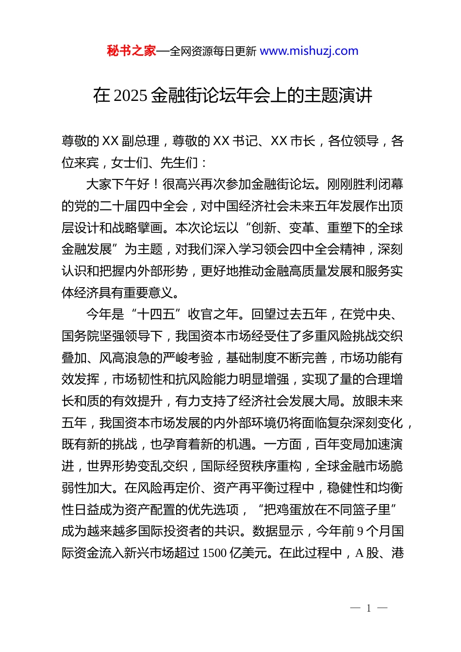 秘书之家—全网资源每日更新 www.mishuzj.com在 2025 金融街论坛年会上的主题演讲尊敬的 XX 副总理,尊敬的 XX 书记、XX 市长,各位领导,各位来宾,女士们、先生们:大家下午好!很高兴再次参加金融街论坛。刚刚胜利闭幕的党的二十届四中全会,对中国经济社会未来五年发展作出顶层设计和战略擘画。本次论坛以“创新、变革、重塑下的全球金融发展”为主题,对我们深入学习领会四中全会精神,深刻认识和把握内外部形势,更好地推动金融高质量发展和服务实体经济具有重要意义。今年是“十四五”收官之年。回望过去五年,在党中央、国务院坚强领导下,我国资本市场经受住了多重风险挑战交织叠加、风高浪急的严峻考验,基础制度不断完善,市场功能有效发挥,市场韧性和抗风险能力明显增强,实现了量的合理增长和质的有效提升,有力支持了经济社会发展大局。放眼未来五年,我国资本市场发展的内外部环境仍将面临复杂深刻变化,既有新的挑战,也孕育着新的机遇。一方面,百年变局加速演进,世界形势变乱交织,国际经贸秩序重构,全球金融市场脆弱性加大。在风险再定价、资产再平衡过程中,稳健性和均衡性日益成为资产配置的优先选项,“把鸡蛋放在不同篮子里”成为越来越多国际投资者的共识。数据显示,今年前 9 个月国际资金流入新兴市场超过 1500 亿美元。在此过程中,A 股、港— 1 —股等中国资产的价值被持续重估、配置和再配置。另一方面,在新一轮科技革命和产业变革引领下,以人工智能、生物医药为代表的新产业、新业态蓬勃发展,在重塑生产方式、优化资源配置、提升全要素生产率方面发挥着关键作用。这些新产业、新业态投入高、风险大、回报周期长,往往需要更大规模的耐心资本投入和更灵活、更包容的融资环境,以利于更好支持创新资本形成和创新动能培育。总的看,在全球格局和科技创新趋势深刻变化的今天,无论是融资端,还是投资端,都对资本市场发展和功能发挥提出了新要求、新期待,只有不失时机深化改革,不断增强市场制度的包容性、适应性,提升市场吸引力和竞争力,才能更好地在不确定的环境中赢得主动、赢得未来。党的二十届四中全会科学研判国际国内大局大势,紧扣“两步走”战略目标,明确了今后五年经济社会发展的目标任务,对建设现代化产业体系、加快高水平科技自立自强、加快构建高水平社会主义市场经济体制等作出重要部署,为我们有效应对复杂严峻的外部环境新变化、深入推动经济社会高质量发展指明了方向,提供了根本遵循。上周五,XX 副总理主持召开金融系统学习贯彻党的二十届四中全会精神会议,刚才在主旨演讲中带领我们再学习、再领会,强调要推动金融高质量发展,加快建设金融强国。我们将深入学习领会、认真贯彻落实四中全会精神,牢牢把握“六个坚持”,紧紧围绕防风险、强— 2 —秘书之家—全网资源每日更新 www.mishuzj.com监管、促高质量发展工作主线,更加聚焦服务新质生产力发展,更加聚焦统筹发展与安全,更加聚焦强本强基,进一步深化投融资综合改革,持续增强我国资本市场的包容性、适应性和吸引力、竞争力,更好服务经济社会发展和金融强国建设。一是纵深推进板块改革,增强多层次市场体系的包容性和覆盖面。今年 6 月,我们宣布了科创板“1+6”政策举措。经过各方努力,明天科创板科创成长层将迎来首批新注册企业上市,试点引入资深专业机构投资者、预先审阅等已经实施,改革效应正加快显现。我们还将启动实施深化创业板改革,设置更加契合新兴领域和未来产业创新创业企业特征的上市标准,为新产业、新业态、新技术企业提供更加精准、包容的金融服务。同时,我们将坚持打造服务创新型中小企业主阵地的定位,持续推动北交所高质量发展,健全新三板市场差异化的挂牌、信披、交易制度,畅通三、四板对接机制,筑牢多层次资本市场的塔基和底座。二是进一步固本培元,夯实市场稳定内在基础。高质量的上市公司是资本市场稳定运行的基石。我们将择机推出再融资储架发行制度,进一步拓宽并购重组支持渠道,促进上市公司产业整合、做优做强。督促上市公司完善治理、加大分红回购增持力度,以稳健业绩筑牢价值根基,用真金白银回报...