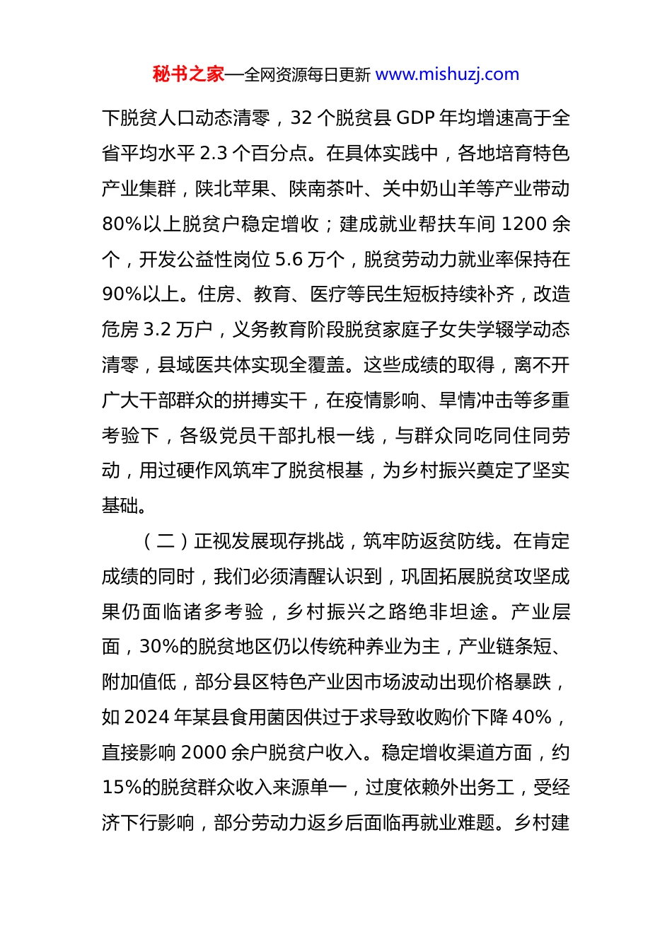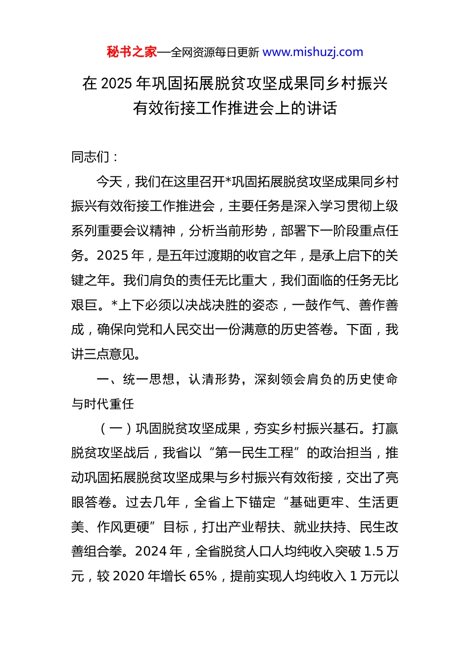 秘书之家—全网资源每日更新 www.mishuzj.com在 2025 年巩固拓展脱贫攻坚成果同乡村振兴有效衔接工作推进会上的讲话 同志们:今天,我们在这里召开*巩固拓展脱贫攻坚成果同乡村振兴有效衔接工作推进会,主要任务是深入学习贯彻上级系列重要会议精神,分析当前形势,部署下一阶段重点任务。2025 年,是五年过渡期的收官之年,是承上启下的关键之年。我们肩负的责任无比重大,我们面临的任务无比艰巨。*上下必须以决战决胜的姿态,一鼓作气、善作善成,确保向党和人民交出一份满意的历史答卷。下面,我讲三点意见。一、统一思想,认清形势,深刻领会肩负的历史使命与时代重任(一)巩固脱贫攻坚成果,夯实乡村振兴基石。打赢脱贫攻坚战后,我省以“第一民生工程”的政治担当,推动巩固拓展脱贫攻坚成果与乡村振兴有效衔接,交出了亮眼答卷。过去几年,全省上下锚定“基础更牢、生活更美、作风更硬”目标,打出产业帮扶、就业扶持、民生改善组合拳。2024 年,全省脱贫人口人均纯收入突破 1.5 万元,较 2020 年增长 65%,提前实现人均纯收入 1 万元以秘书之家—全网资源每日更新 www.mishuzj.com下脱贫人口动态清零,32 个脱贫县 GDP 年均增速高于全省平均水平 2.3 个百分点。在具体实践中,各地培育特色产业集群,陕北苹果、陕南茶叶、关中奶山羊等产业带动80%以上脱贫户稳定增收;建成就业帮扶车间 1200 余个,开发公益性岗位 5.6 万个,脱贫劳动力就业率保持在90%以上。住房、教育、医疗等民生短板持续补齐,改造危房 3.2 万户,义务教育阶段脱贫家庭子女失学辍学动态清零,县域医共体实现全覆盖。这些成绩的取得,离不开广大干部群众的拼搏实干,在疫情影响、旱情冲击等多重考验下,各级党员干部扎根一线,与群众同吃同住同劳动,用过硬作风筑牢了脱贫根基,为乡村振兴奠定了坚实基础。(二)正视发展现存挑战,筑牢防返贫防线。在肯定成绩的同时,我们必须清醒认识到,巩固拓展脱贫攻坚成果仍面临诸多考验,乡村振兴之路绝非坦途。产业层面,30%的脱贫地区仍以传统种养业为主,产业链条短、附加值低,部分县区特色产业因市场波动出现价格暴跌,如 2024 年某县食用菌因供过于求导致收购价下降 40%,直接影响 2000 余户脱贫户收入。稳定增收渠道方面,约15%的脱贫群众收入来源单一,过度依赖外出务工,受经济下行影响,部分劳动力返乡后面临再就业难题。乡村建秘书之家—全网资源每日更新 www.mishuzj.com设与治理存在明显短板,80%的行政村存在基础设施老化问题,垃圾分类、污水治理等长效机制尚未健全,个别村“两委”班子带动能力弱,出现“干部干、群众看”的被动局面。更需警惕的是,返贫致贫风险依然存在。2024 年全省监测到易返贫致贫人口 1.2 万人,其中因病因灾因学返贫占比达 65%。这些问题警示我们,收官不等于收摊,必须摒弃“松口气、歇歇脚”的懈怠思想,以“时时放心不下”的责任感筑牢防返贫防线。(三)聚焦两好两升目标,续写乡村振兴新篇。面对新形势新挑战,全省上下需锚定“两好两升两确保”目标,以更实举措推动乡村全面振兴。要提升脱贫成果巩固成色,健全防止返贫动态监测机制,对脱贫不稳定户、边缘易致贫户实行“每月走访、每季评估”,确保早发现、早干预、早帮扶。同时,开展群众满意度提升行动,通过“百姓评、乡贤议、部门查”多维评价体系,倒逼帮扶工作提质增效,力争 2025 年群众满意度突破 90 分。在产业发展与乡村治理上持续发力,实施“一县一业”强链工程,每个脱贫县重点培育 1-2 个主导产业,建设农产品加工园、冷链物流中心,推动陕北苹果深加工、陕南中药材炮制等产业链延伸,2025 年前实现脱贫地区产业产值翻番。乡村治理推行“党建+积分制”,将环境卫生、孝老爱秘书之家—全网资源每日更新 www.mishuzj.com亲等纳入积分管理,激发群众参与热情,年底前实现村级议事协商机制全覆盖。全体党员干部要扛牢政治责任,把巩固成果、推进振兴作为检验作风的“试金石”,建立“包村联户”责任清单,对重点任务实行“周调度、月通报、季考核”。唯有以“不获全胜决不收兵”的韧劲真抓实干,才能确保...