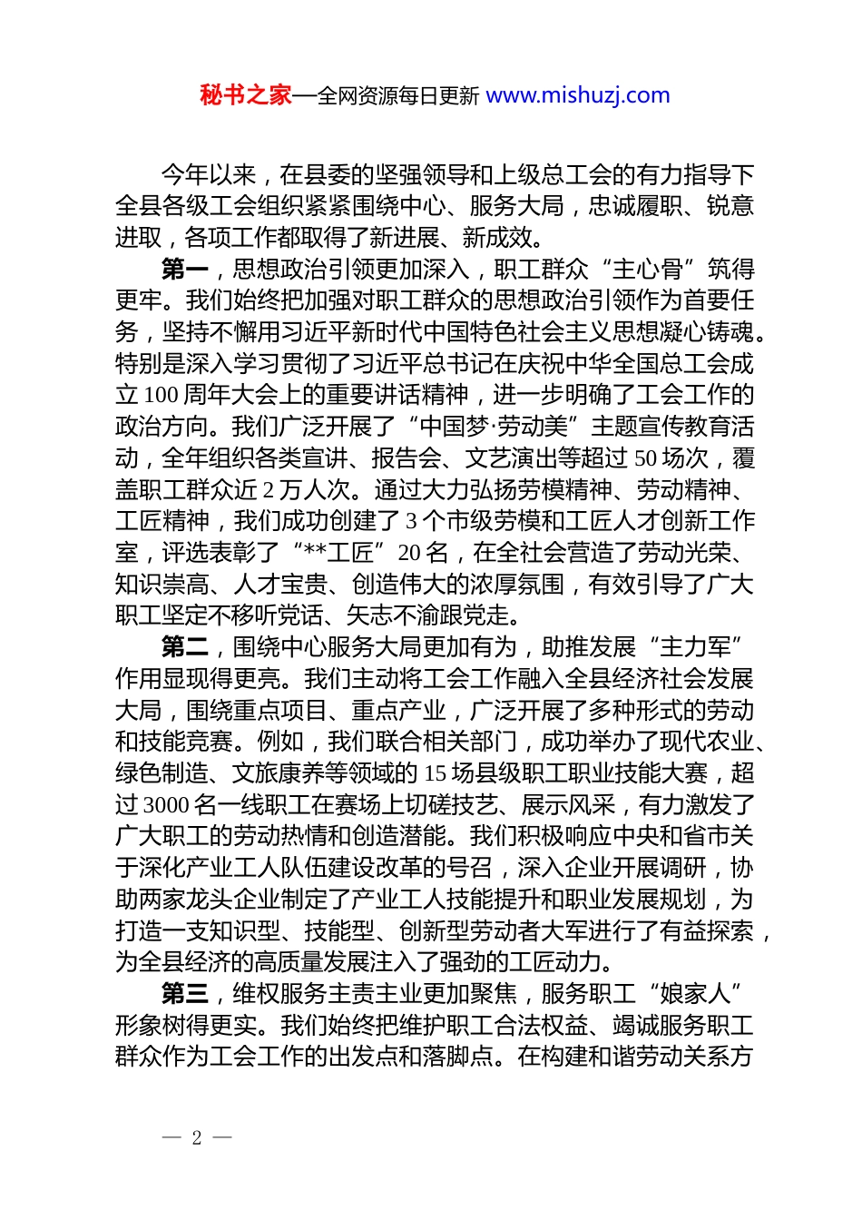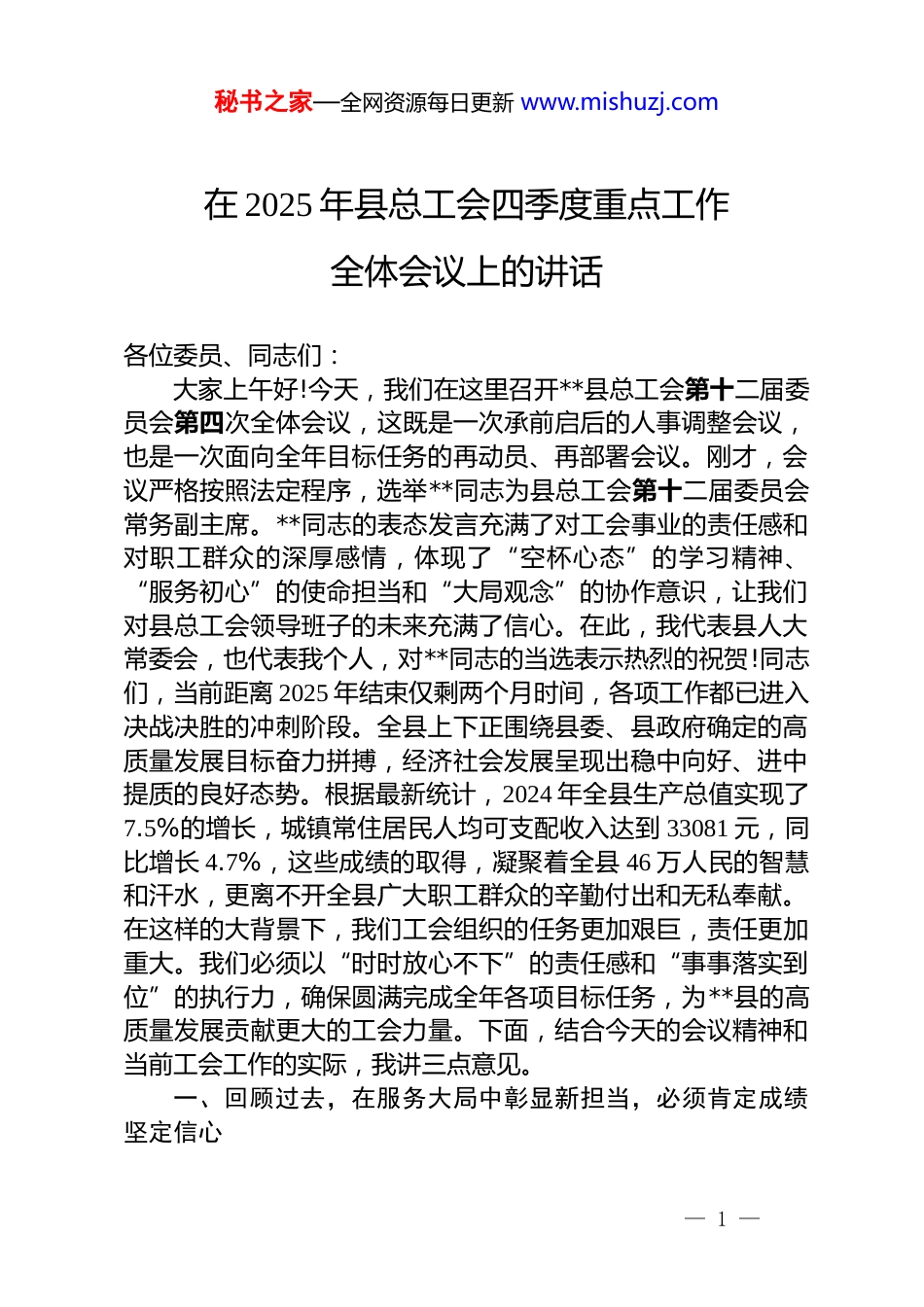 秘书之家—全网资源每日更新 www.mishuzj.com在 2025 年县总工会四季度重点工作全体会议上的讲话各位委员、同志们:大家上午好!今天,我们在这里召开**县总工会第十二届委员会第四次全体会议,这既是一次承前启后的人事调整会议,也是一次面向全年目标任务的再动员、再部署会议。刚才,会议严格按照法定程序,选举**同志为县总工会第十二届委员会常务副主席。**同志的表态发言充满了对工会事业的责任感和对职工群众的深厚感情,体现了“空杯心态”的学习精神、“服务初心”的使命担当和“大局观念”的协作意识,让我们对县总工会领导班子的未来充满了信心。在此,我代表县人大常委会,也代表我个人,对**同志的当选表示热烈的祝贺!同志们,当前距离 2025 年结束仅剩两个月时间,各项工作都已进入决战决胜的冲刺阶段。全县上下正围绕县委、县政府确定的高质量发展目标奋力拼搏,经济社会发展呈现出稳中向好、进中提质的良好态势。根据最新统计,2024 年全县生产总值实现了7.5%的增长,城镇常住居民人均可支配收入达到 33081 元,同比增长 4.7%,这些成绩的取得,凝聚着全县 46 万人民的智慧和汗水,更离不开全县广大职工群众的辛勤付出和无私奉献。在这样的大背景下,我们工会组织的任务更加艰巨,责任更加重大。我们必须以“时时放心不下”的责任感和“事事落实到位”的执行力,确保圆满完成全年各项目标任务,为**县的高质量发展贡献更大的工会力量。下面,结合今天的会议精神和当前工会工作的实际,我讲三点意见。一、回顾过去,在服务大局中彰显新担当,必须肯定成绩坚定信心— 1 —秘书之家—全网资源每日更新 www.mishuzj.com今年以来,在县委的坚强领导和上级总工会的有力指导下全县各级工会组织紧紧围绕中心、服务大局,忠诚履职、锐意进取,各项工作都取得了新进展、新成效。第一,思想政治引领更加深入,职工群众“主心骨”筑得更牢。我们始终把加强对职工群众的思想政治引领作为首要任务,坚持不懈用习近平新时代中国特色社会主义思想凝心铸魂。特别是深入学习贯彻了习近平总书记在庆祝中华全国总工会成立 100 周年大会上的重要讲话精神,进一步明确了工会工作的政治方向。我们广泛开展了“中国梦·劳动美”主题宣传教育活动,全年组织各类宣讲、报告会、文艺演出等超过 50 场次,覆盖职工群众近 2 万人次。通过大力弘扬劳模精神、劳动精神、工匠精神,我们成功创建了 3 个市级劳模和工匠人才创新工作室,评选表彰了“**工匠”20 名,在全社会营造了劳动光荣、知识崇高、人才宝贵、创造伟大的浓厚氛围,有效引导了广大职工坚定不移听党话、矢志不渝跟党走。第二,围绕中心服务大局更加有为,助推发展“主力军”作用显现得更亮。我们主动将工会工作融入全县经济社会发展大局,围绕重点项目、重点产业,广泛开展了多种形式的劳动和技能竞赛。例如,我们联合相关部门,成功举办了现代农业、绿色制造、文旅康养等领域的 15 场县级职工职业技能大赛,超过 3000 名一线职工在赛场上切磋技艺、展示风采,有力激发了广大职工的劳动热情和创造潜能。我们积极响应中央和省市关于深化产业工人队伍建设改革的号召,深入企业开展调研,协助两家龙头企业制定了产业工人技能提升和职业发展规划,为打造一支知识型、技能型、创新型劳动者大军进行了有益探索,为全县经济的高质量发展注入了强劲的工匠动力。第三,维权服务主责主业更加聚焦,服务职工“娘家人”形象树得更实。我们始终把维护职工合法权益、竭诚服务职工群众作为工会工作的出发点和落脚点。在构建和谐劳动关系方— 2 —秘书之家—全网资源每日更新 www.mishuzj.com面,我们加大了劳动争议调处力度,全年共受理劳动争议案件120 余起,调解成功率达到 95%以上,有效维护了职工队伍的稳定。在帮扶救助困难职工方面,我们持续深化“送温暖”等品牌活动,全年累计发放各类帮扶资金超过 120 万元,为 600多户困难职工家庭解了燃眉之急;“金秋助学”活动帮助了150 名困难职工子女圆了大学梦。尤其值得肯定的是,我们高度关注新就业形态劳动者群体,针对货车司机、快递员、外卖配送员等群体的...