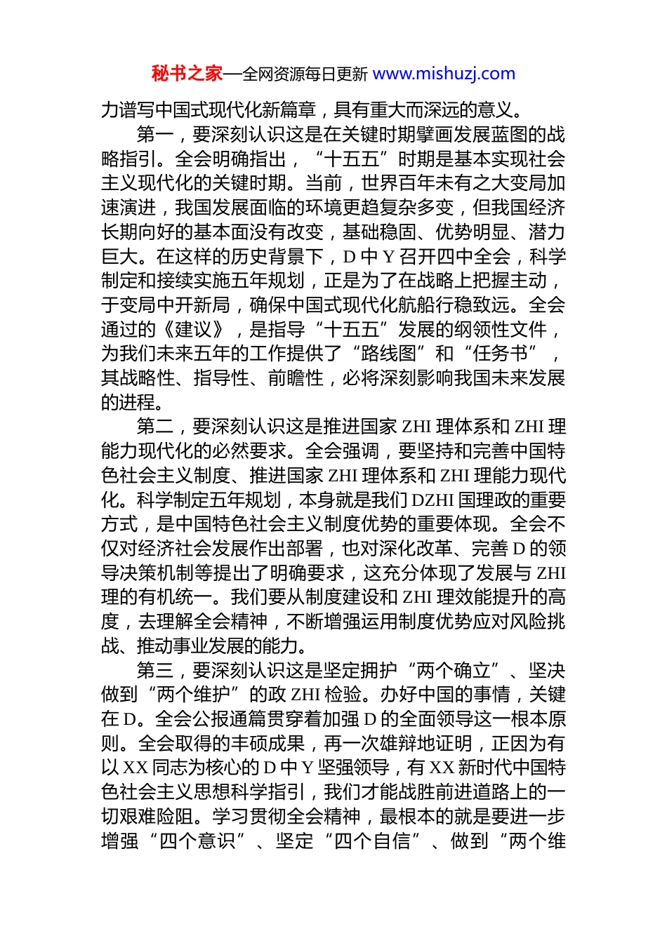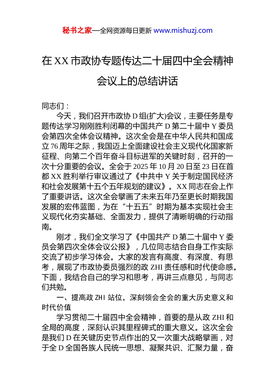 秘书之家—全网资源每日更新 www.mishuzj.com在 XX 市政协专题传达二十届四中全会精神会议上的总结讲话同志们:今天,我们召开市政协 D 组(扩大)会议,主要任务是专题传达学习刚刚胜利闭幕的中国共产 D 第二十届中 Y 委员会第四次全体会议精神。这次全会是在中华人民共和国成立 76 周年之际,我国迈上全面建设社会主义现代化国家新征程、向第二个百年奋斗目标进军的关键时刻,召开的一次十分重要的会议。全会于 2025 年 10 月 20 日至 23 日在首都 XX 胜利举行审议通过了《中共中 Y 关于制定国民经济和社会发展第十五个五年规划的建议》。XX 同志在会上作了重要讲话。这次全会擘画了未来五年乃至更长时期我国发展的宏伟蓝图,为在“十五五”时期为基本实现社会主义现代化夯实基础、全面发力,提供了清晰明确的行动指南。刚才,我们全文学习了《中国共产 D 第二十届中 Y 委员会第四次全体会议公报》,几位同志结合自身工作实际交流了初步学习体会。大家的发言有高度、有深度、有思考,展现了市政协委员强烈的政 ZHI 责任感和时代使命感。下面,我结合自己的学习和思考,再讲三点意见,与同志们共勉。一、提高政 ZHI 站位,深刻领会全会的重大历史意义和时代价值学习贯彻二十届四中全会精神,首要的是从政 ZHI 和全局的高度,深刻认识其里程碑式的重大意义。这次全会是我们 D 在关键历史节点作出的又一次重大战略擘画,对于全 D 全国各族人民统一思想、凝聚共识、汇聚力量,奋秘书之家—全网资源每日更新 www.mishuzj.com力谱写中国式现代化新篇章,具有重大而深远的意义。第一,要深刻认识这是在关键时期擘画发展蓝图的战略指引。全会明确指出,“十五五”时期是基本实现社会主义现代化的关键时期。当前,世界百年未有之大变局加速演进,我国发展面临的环境更趋复杂多变,但我国经济长期向好的基本面没有改变,基础稳固、优势明显、潜力巨大。在这样的历史背景下,D 中 Y 召开四中全会,科学制定和接续实施五年规划,正是为了在战略上把握主动,于变局中开新局,确保中国式现代化航船行稳致远。全会通过的《建议》,是指导“十五五”发展的纲领性文件,为我们未来五年的工作提供了“路线图”和“任务书”,其战略性、指导性、前瞻性,必将深刻影响我国未来发展的进程。第二,要深刻认识这是推进国家 ZHI 理体系和 ZHI 理能力现代化的必然要求。全会强调,要坚持和完善中国特色社会主义制度、推进国家 ZHI 理体系和 ZHI 理能力现代化。科学制定五年规划,本身就是我们 DZHI 国理政的重要方式,是中国特色社会主义制度优势的重要体现。全会不仅对经济社会发展作出部署,也对深化改革、完善 D 的领导决策机制等提出了明确要求,这充分体现了发展与 ZHI理的有机统一。我们要从制度建设和 ZHI 理效能提升的高度,去理解全会精神,不断增强运用制度优势应对风险挑战、推动事业发展的能力。第三,要深刻认识这是坚定拥护“两个确立”、坚决做到“两个维护”的政 ZHI 检验。办好中国的事情,关键在 D。全会公报通篇贯穿着加强 D 的全面领导这一根本原则。全会取得的丰硕成果,再一次雄辩地证明,正因为有以 XX 同志为核心的 D 中 Y 坚强领导,有 XX 新时代中国特色社会主义思想科学指引,我们才能战胜前进道路上的一切艰难险阻。学习贯彻全会精神,最根本的就是要进一步增强“四个意识”、坚定“四个自信”、做到“两个维秘书之家—全网资源每日更新 www.mishuzj.com护”,始终在思想上政 ZHI 上行动上同以 XX 同志为核心的D 中 Y 保持高度一致,确保中 Y 各项决策部署在 XX 市不折不扣落地生根、开花结果。二、把握核心要义,精准聚焦高质量发展的战略部署二十届四中全会公报内容博大精深,全文五千多字系统部署了十二项重大任务为推动高质量发展指明了主攻方向和着力重点。我们要逐条逐句研读,全面系统把握,尤其要结合 XX 市发展实际,找准贯彻落实的切入点和结合点。一是要牢牢把握以科技创新引领现代化产业体系建设这个首要任务。全会把“加快高水平科技自立自强,引领发展新质生产力”放在突出...