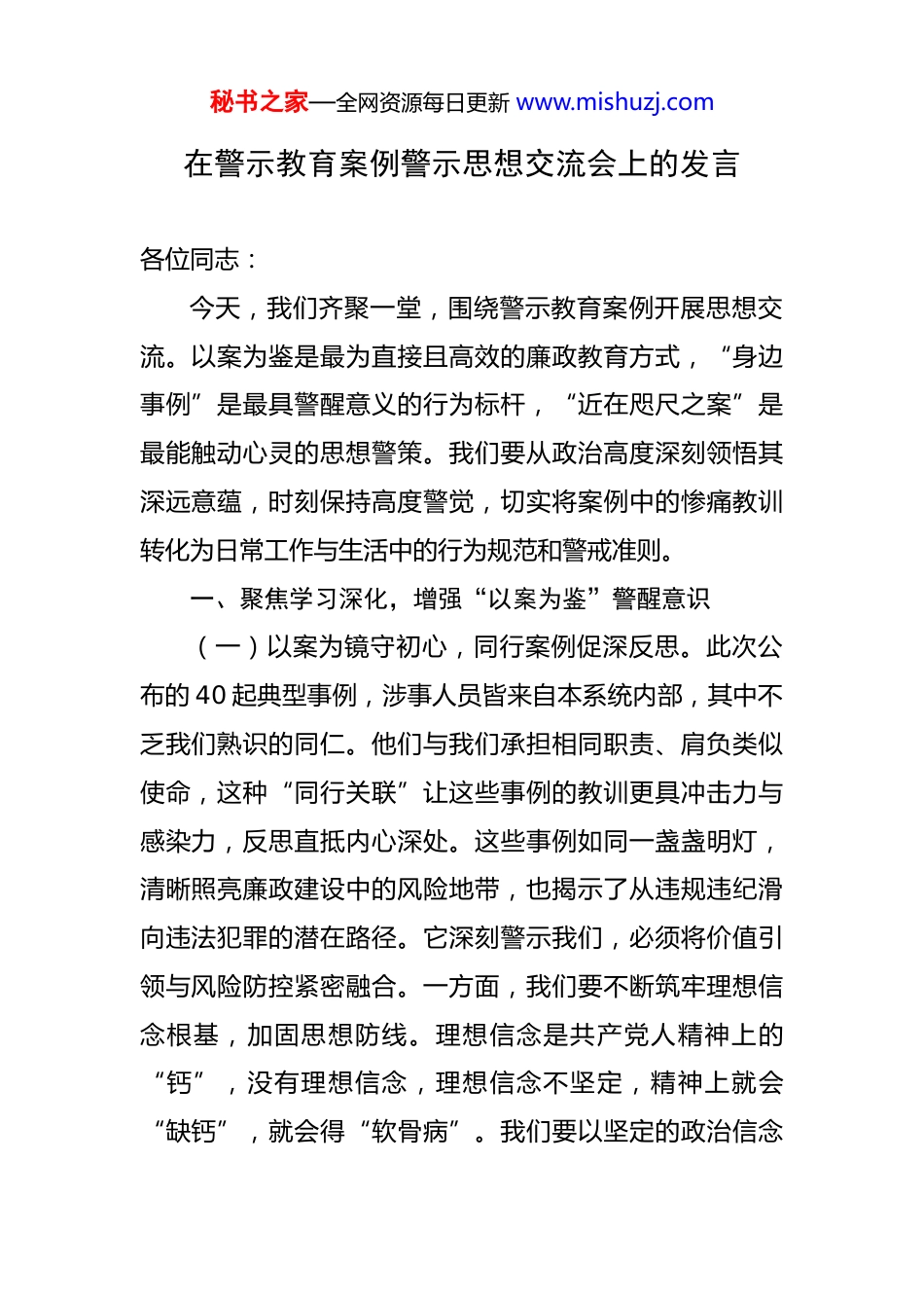 秘书之家—全网资源每日更新 www.mishuzj.com在警示教育案例警示思想交流会上的发言 各位同志:今天,我们齐聚一堂,围绕警示教育案例开展思想交流。以案为鉴是最为直接且高效的廉政教育方式,“身边事例”是最具警醒意义的行为标杆,“近在咫尺之案”是最能触动心灵的思想警策。我们要从政治高度深刻领悟其深远意蕴,时刻保持高度警觉,切实将案例中的惨痛教训转化为日常工作与生活中的行为规范和警戒准则。一、聚焦学习深化,增强“以案为鉴”警醒意识(一)以案为镜守初心,同行案例促深反思。此次公布的 40 起典型事例,涉事人员皆来自本系统内部,其中不乏我们熟识的同仁。他们与我们承担相同职责、肩负类似使命,这种“同行关联”让这些事例的教训更具冲击力与感染力,反思直抵内心深处。这些事例如同一盏盏明灯,清晰照亮廉政建设中的风险地带,也揭示了从违规违纪滑向违法犯罪的潜在路径。它深刻警示我们,必须将价值引领与风险防控紧密融合。一方面,我们要不断筑牢理想信念根基,加固思想防线。理想信念是共产党人精神上的“钙”,没有理想信念,理想信念不坚定,精神上就会“缺钙”,就会得“软骨病”。我们要以坚定的政治信念秘书之家—全网资源每日更新 www.mishuzj.com引领工作稳健前行,时刻牢记为人民服务的宗旨,把人民的利益放在首位。另一方面,我们要以“时刻不可懈怠”的责任感,敏锐洞察违规行为的新态势、新特征。尤其要警惕“变相的利益输送”“隐蔽的权力寻租”等现象。在项目招投标、人事选拔任用等关键节点,以及资源调配、信息管控等重要环节和易出问题的领域,我们要秉持“毫不松懈”的坚定态度,筑牢法律屏障。同时,我们必须坚持常态预防、早抓防范、从小处着手。从经费预算规划、办公用品购置等细微事务抓起,常怀对法规制度的敬畏之心,常守清正廉洁的操守底线。“千里之堤,毁于蚁穴”,我们要防止小失误演变成大灾祸,以同行的惨痛教训时刻警醒自己,做到警钟长鸣、自我约束。(二)自查自省砺党性,坚定信念抵御诱惑。“君子检身,常若有过。”我们要把自查自省作为一种习惯,定期审视自己的思想和行为。通过对照案例中的问题,查找自身存在的不足,及时纠正错误,不断提高党性修养。在面对各种诱惑时,我们要坚定理想信念,保持清醒的头脑。诱惑就像糖衣炮弹,看似甜蜜,实则危险。我们不能被眼前的利益所迷惑,要坚守道德和法律的底线。要时刻提醒自己,权力是人民赋予的,只能用来为人民谋利益,而不能用来谋取个人私利。我们还要加强自身的学习,提秘书之家—全网资源每日更新 www.mishuzj.com高自身的综合素质。只有不断学习,才能增强辨别是非的能力,才能在复杂的环境中保持正确的方向。要学习党的理论知识,学习法律法规,学习业务知识,不断提高自己的政治素养、法律意识和业务水平。二、强化责任担当,筑牢“廉洁从业”坚固防线(一)压实主体责任,推动廉政建设落地。各级领导干部要切实履行好党风廉政建设主体责任,把廉政建设工作与业务工作同部署、同落实、同检查、同考核。要明确责任分工,层层传导压力,确保廉政建设工作落到实处。领导干部要以身作则,带头遵守廉洁自律的各项规定。要求别人做到的,自己首先要做到;要求别人不做的,自己坚决不做。要发挥好示范引领作用,带领广大干部职工共同营造风清气正的工作环境。同时,要加强对干部职工的教育、管理和监督。要通过开展廉政教育活动,提高干部职工的廉洁意识;要加强对干部职工的日常管理,及时发现和纠正存在的问题;要强化对权力运行的监督,防止权力滥用和腐败现象的发生。(二)加强制度建设,扎紧权力运行笼子。制度是管根本、管长远的。我们要加强制度建设,建立健全各项规章制度,形成用制度管权、按制度办事、靠制度管人的长效机制。要完善廉政风险防控机制,对重点领域、关键环秘书之家—全网资源每日更新 www.mishuzj.com节进行全面排查,找出廉政风险点,制定相应的防控措施。要加强对制度执行情况的监督检查,确保制度的刚性约束,防止制度成为“稻草人”。在制度建设过程中,要注重制度的科学性、合理性和可操作性。要广泛征求干部职工的意见和建...