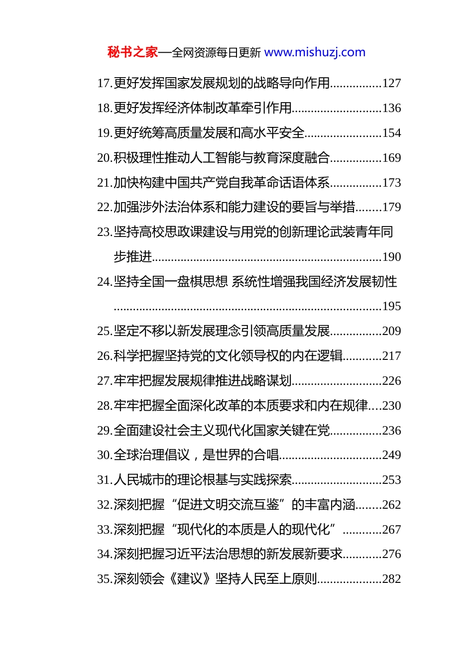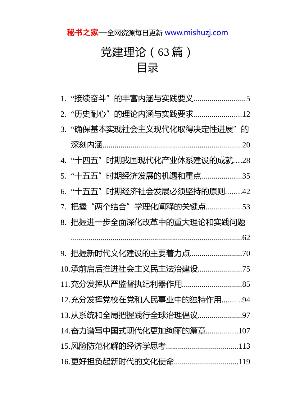 秘书之家—全网资源每日更新 www.mishuzj.com党建理论(63 篇)目录1. “接续奋斗”的丰富内涵与实践要义..........................52. “历史耐心”的理论内涵与实践要求........................123. “确保基本实现社会主义现代化取得决定性进展”的深刻内涵......................................................................204. “十四五”时期我国现代化产业体系建设的成就....285. “十五五”时期经济发展的机遇和重点....................356. “十五五”时期经济社会发展必须坚持的原则........427. 把握“两个结合”学理化阐释的关键点..................538. 把握进一步全面深化改革中的重大理论和实践问题......................................................................................629. 把握新时代文化建设的主要着力点..........................7010.承前启后推进社会主义民主法治建设......................7511.充分发挥从严监督执纪利器作用..............................8512.充分发挥党校在党和人民事业中的独特作用..........9413.从系统和全局把握践行全球治理倡议......................9714.奋力谱写中国式现代化更加绚丽的篇章................10715.风险防范化解的经济学思考....................................11316.更好担负起新时代的文化使命................................119秘书之家—全网资源每日更新 www.mishuzj.com17.更好发挥国家发展规划的战略导向作用................12718.更好发挥经济体制改革牵引作用............................13619.更好统筹高质量发展和高水平安全........................15420.积极理性推动人工智能与教育深度融合................16921.加快构建中国共产党自我革命话语体系................17322.加强涉外法治体系和能力建设的要旨与举措........17923.坚持高校思政课建设与用党的创新理论武装青年同步推进........................................................................19024.坚持全国一盘棋思想 系统性增强我国经济发展韧性....................................................................................19525.坚定不移以新发展理念引领高质量发展................20926.科学把握坚持党的文化领导权的内在逻辑............21727.牢牢把握发展规律推进战略谋划............................22628.牢牢把握全面深化改革的本质要求和内在规律....23029.全面建设社会主义现代化国家关键在党................23630.全球治理倡议,是世界的合唱................................24931.人民城市的理论根基与实践探索............................25332.深刻把握“促进文明交流互鉴”的丰富内涵........26233.深刻把握“现代化的本质是人的现代化”............26734.深刻把握习近平法治思想的新发展新要求............27635.深刻领会《建议》坚持人民至上原则....................282秘书之家—全网资源每日更新 www.mishuzj.com36.深刻认识五年规划彰显的制度优势........................29637.实现精神上的独立自主是坚定文化自信的首要任务....................................................................................30838.始终保持一张蓝图绘到底的战略定力....................31639.书写新时代民生建设新篇章....................................32440.思想淬火砺初心........................................................34141.提升中华文化全球传播效能的意义和路径............35342.统筹推进高质量发展与高效能治理........................36143.推动人工智能向善发展............................................37244.推进作风建设常态化长效化....................................37845.为文化强国建设提供制度支撑................................38946.文化润疆是新时代党的治疆方略的重大创新........39847.我国宏观经济治理体系的创新发展........................41648.习近平总书记关于加强和改进人民...
