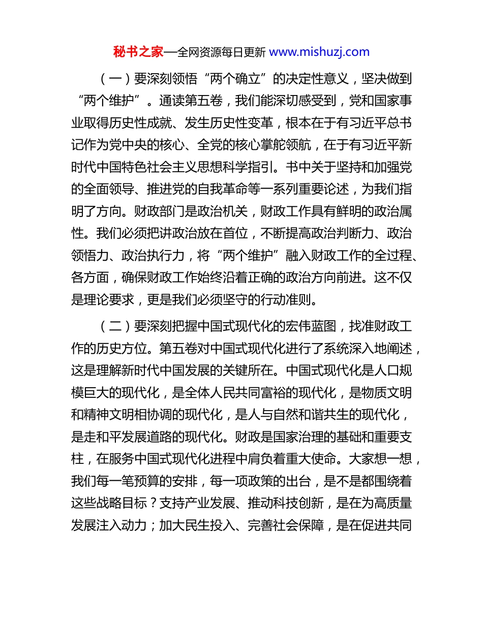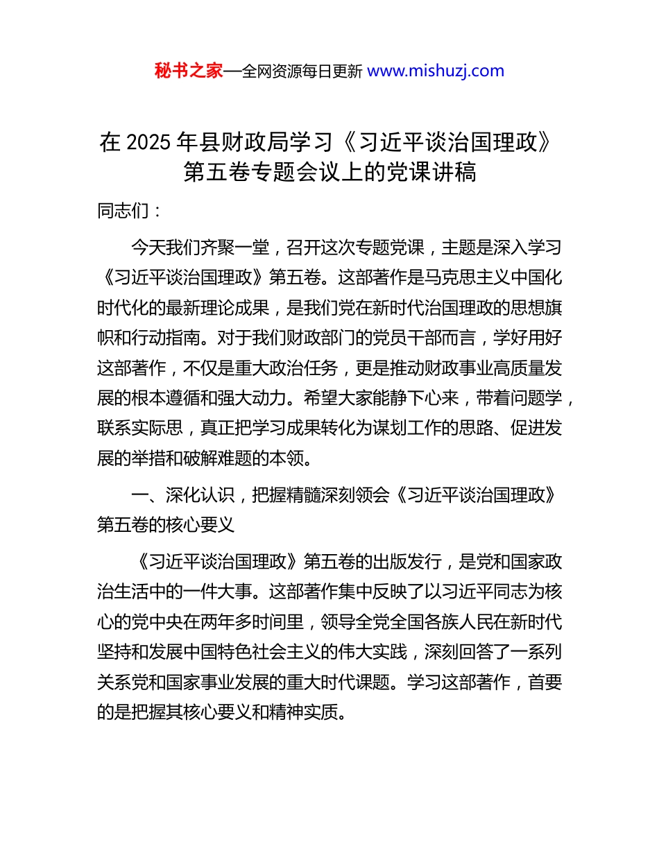 秘书之家—全网资源每日更新 www.mishuzj.com在 2025 年县财政局学习《习近平谈治国理政》第五卷专题会议上的党课讲稿同志们:今天我们齐聚一堂,召开这次专题党课,主题是深入学习《习近平谈治国理政》第五卷。这部著作是马克思主义中国化时代化的最新理论成果,是我们党在新时代治国理政的思想旗帜和行动指南。对于我们财政部门的党员干部而言,学好用好这部著作,不仅是重大政治任务,更是推动财政事业高质量发展的根本遵循和强大动力。希望大家能静下心来,带着问题学,联系实际思,真正把学习成果转化为谋划工作的思路、促进发展的举措和破解难题的本领。一、深化认识,把握精髓深刻领会《习近平谈治国理政》第五卷的核心要义《习近平谈治国理政》第五卷的出版发行,是党和国家政治生活中的一件大事。这部著作集中反映了以习近平同志为核心的党中央在两年多时间里,领导全党全国各族人民在新时代坚持和发展中国特色社会主义的伟大实践,深刻回答了一系列关系党和国家事业发展的重大时代课题。学习这部著作,首要的是把握其核心要义和精神实质。秘书之家—全网资源每日更新 www.mishuzj.com(一)要深刻领悟“两个确立”的决定性意义,坚决做到“两个维护”。通读第五卷,我们能深切感受到,党和国家事业取得历史性成就、发生历史性变革,根本在于有习近平总书记作为党中央的核心、全党的核心掌舵领航,在于有习近平新时代中国特色社会主义思想科学指引。书中关于坚持和加强党的全面领导、推进党的自我革命等一系列重要论述,为我们指明了方向。财政部门是政治机关,财政工作具有鲜明的政治属性。我们必须把讲政治放在首位,不断提高政治判断力、政治领悟力、政治执行力,将“两个维护”融入财政工作的全过程、各方面,确保财政工作始终沿着正确的政治方向前进。这不仅是理论要求,更是我们必须坚守的行动准则。(二)要深刻把握中国式现代化的宏伟蓝图,找准财政工作的历史方位。第五卷对中国式现代化进行了系统深入地阐述,这是理解新时代中国发展的关键所在。中国式现代化是人口规模巨大的现代化,是全体人民共同富裕的现代化,是物质文明和精神文明相协调的现代化,是人与自然和谐共生的现代化,是走和平发展道路的现代化。财政是国家治理的基础和重要支柱,在服务中国式现代化进程中肩负着重大使命。大家想一想,我们每一笔预算的安排,每一项政策的出台,是不是都围绕着这些战略目标?支持产业发展、推动科技创新,是在为高质量发展注入动力;加大民生投入、完善社会保障,是在促进共同秘书之家—全网资源每日更新 www.mishuzj.com富裕;投入环保资金、支持绿色发展,是在守护绿水青山。我们的工作,正是中国式宏伟蓝图在*县的生动实践。(三)要深刻理解发展新质生产力的战略要求,增强服务高质量发展的能力。第五卷将“发展新质生产力”置于突出位置,这是党中央从推动高质量发展的内在要求出发作出的重大战略部署。新质生产力以科技创新为主导,摆脱传统增长方式,具有高科技、高效能、高质量的特征。财政部门在支持新质生产力发展上大有可为。我们的工作不能停留在简单的“收收支支”,更要思考如何通过财税政策工具,引导资源向科技创新、战略性新兴产业、未来产业集聚。如何运用财政资金“四两拨千斤”的作用,撬动更多社会资本投入到新领域、新赛道?如何优化营商环境,为各类创新主体提供精准有效的财税支持?这些都是我们在学习第五卷后需要深入思考并付诸实践的重大课题。(四)要深刻践行以人民为中心的发展思想,坚守财政工作的根本立场。第五卷通篇贯穿着人民至上的价值理念。习近平总书记反复强调,“江山就是人民,人民就是江山”。财政取之于民、用之于民,保障和改善民生是财政工作的出发点和落脚点。近年来,我们局里在民生领域的投入持续加大,教育、医疗、社保、住房等一件件民生实事的背后,都有财政资金的坚实保障。学习第五卷,就是要让我们更加清醒地认识到,财政资金不是冰冷的数字,而是党和政府送向千家万户的温暖。秘书之家—全网资源每日更新 www.mishuzj.com我们必须坚持过“紧日子”,厉行勤俭节约,把省下来的每一分钱都用在刀刃...