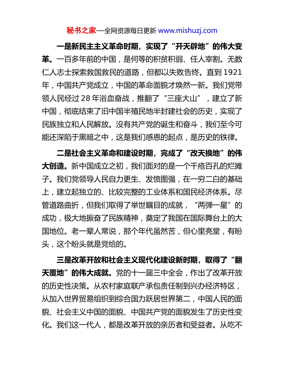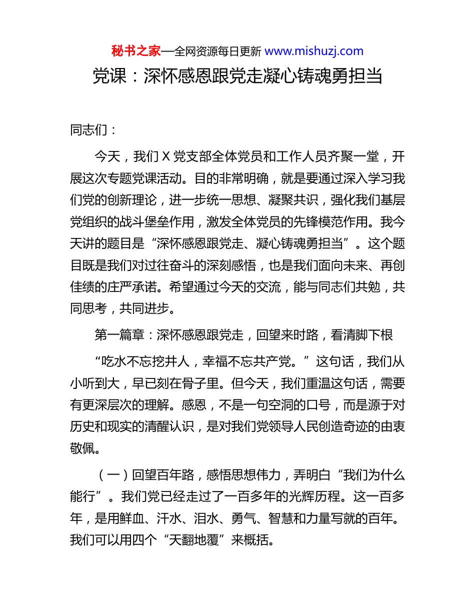 秘书之家—全网资源每日更新 www.mishuzj.com党课:深怀感恩跟党走凝心铸魂勇担当同志们:今天,我们 X 党支部全体党员和工作人员齐聚一堂,开展这次专题党课活动。目的非常明确,就是要通过深入学习我们党的创新理论,进一步统一思想、凝聚共识,强化我们基层党组织的战斗堡垒作用,激发全体党员的先锋模范作用。我今天讲的题目是“深怀感恩跟党走、凝心铸魂勇担当”。这个题目既是我们对过往奋斗的深刻感悟,也是我们面向未来、再创佳绩的庄严承诺。希望通过今天的交流,能与同志们共勉,共同思考,共同进步。第一篇章:深怀感恩跟党走,回望来时路,看清脚下根“吃水不忘挖井人,幸福不忘共产党。”这句话,我们从小听到大,早已刻在骨子里。但今天,我们重温这句话,需要有更深层次的理解。感恩,不是一句空洞的口号,而是源于对历史和现实的清醒认识,是对我们党领导人民创造奇迹的由衷敬佩。(一)回望百年路,感悟思想伟力,弄明白“我们为什么能行”。我们党已经走过了一百多年的光辉历程。这一百多年,是用鲜血、汗水、泪水、勇气、智慧和力量写就的百年。我们可以用四个“天翻地覆”来概括。秘书之家—全网资源每日更新 www.mishuzj.com一是新民主主义革命时期,实现了“开天辟地”的伟大变革。一百多年前的中国,是何等的积贫积弱、任人宰割。无数仁人志士探索救国救民的道路,但都以失败告终。直到 1921年,中国共产党成立,中国的革命面貌才焕然一新。我们党带领人民经过 28 年浴血奋战,推翻了“三座大山”,建立了新中国,彻底结束了旧中国半殖民地半封建社会的历史,实现了民族独立和人民解放。没有共产党的诞生和奋斗,我们至今可能还深陷于黑暗之中,这是我们感恩的起点,是历史的铁律。二是社会主义革命和建设时期,完成了“改天换地”的伟大创造。新中国成立之初,我们面对的是一个千疮百孔的烂摊子。我们党领导人民自力更生、发愤图强,在一穷二白的基础上,建立起独立的、比较完整的工业体系和国民经济体系。尽管道路曲折,但我们取得了举世瞩目的成就,“两弹一星”的成功,极大地振奋了民族精神,奠定了我国在国际舞台上的大国地位。老一辈人常说,那个年代虽然苦,但心里亮堂,有盼头,这个盼头就是党给的。三是改革开放和社会主义现代化建设新时期,取得了“翻天覆地”的伟大成就。党的十一届三中全会,作出了改革开放的历史性决策。从农村家庭联产承包责任制到兴办经济特区,从加入世界贸易组织到综合国力跃居世界第二,中国人民的面貌、社会主义中国的面貌、中国共产党的面貌发生了历史性变化。我们这一代人,都是改革开放的亲历者和受益者。从吃不秘书之家—全网资源每日更新 www.mishuzj.com饱到吃得好,从绿皮火车到风驰电掣的高铁,从凭票购物到网络“秒杀”,这翻天覆地的变化,是党带领我们一步一个脚印干出来的。四是中国特色社会主义新时代,铸就了“惊天动地”的伟大史诗。党的十八大以来,在以习近平同志为核心的党中央坚强领导下,我们解决了许多长期想解决而没有解决的难题,办成了许多过去想办而没有办成的大事。我们历史性地解决了绝对贫困问题,全面建成了小康社会,开启了全面建设社会主义现代化国家的新征程。面对世纪疫情,我们党坚持人民至上、生命至上,最大程度保护了人民生命安全和身体健康。这一系列的伟大成就,向世界雄辩地证明,中国共产党为什么能,中国特色社会主义为什么好,归根到底是马克思主义行,是中国化时代化的马克思主义行。回望这波澜壮阔的百年,我们之所以能从苦难走向辉煌,最根本的原因就是有了中国共产党的坚强领导。这是我们感恩党的历史逻辑。(二)立足新时代,感受发展脉搏,看清楚“党的恩情有多深”。历史的宏大叙事,最终要落到我们每个人的切身感受上。党的恩情,不仅写在史册里,更体现在我们 XX 村的一砖一瓦、一草一木和每一位村民的笑脸上。党的政策好不好,老百姓最有发言权。就拿我们 XX 村来说,这几年的变化,在座秘书之家—全网资源每日更新 www.mishuzj.com的同志们都是亲历者、参与者和见证者。我们不妨一起盘点一下。首先,是我们的“面子”靓了。曾几何时,我们村的道...