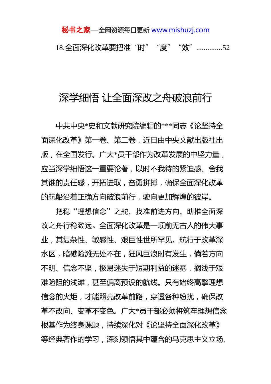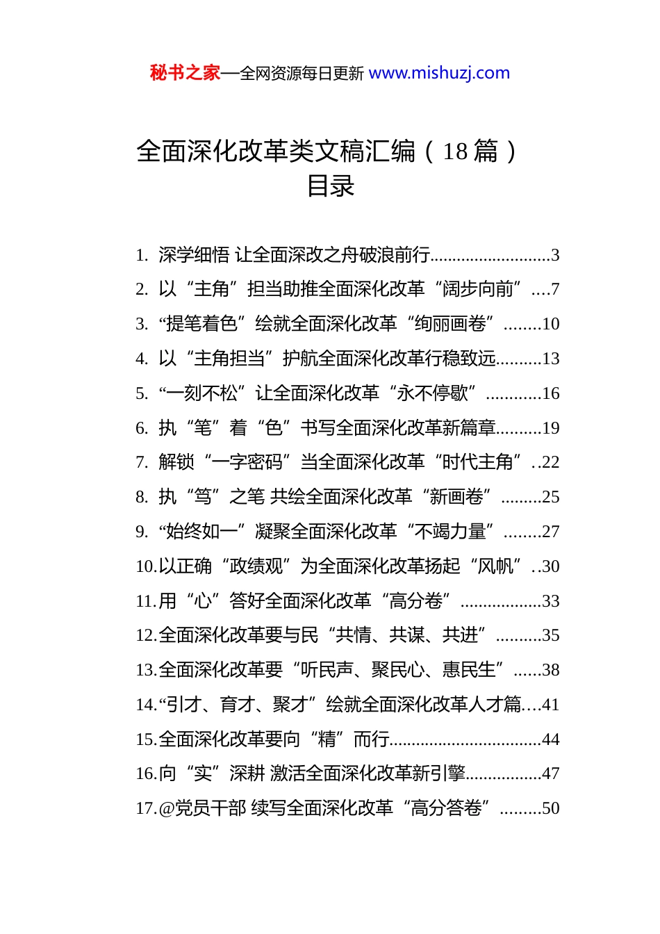 秘书之家—全网资源每日更新 www.mishuzj.com全面深化改革类文稿汇编(18 篇)目录1. 深学细悟 让全面深改之舟破浪前行...........................32. 以“主角”担当助推全面深化改革“阔步向前”....73. “提笔着色”绘就全面深化改革“绚丽画卷”........104. 以“主角担当”护航全面深化改革行稳致远..........135. “一刻不松”让全面深化改革“永不停歇”............166. 执“笔”着“色”书写全面深化改革新篇章..........197. 解锁“一字密码”当全面深化改革“时代主角”..228. 执“笃”之笔 共绘全面深化改革“新画卷”.........259. “始终如一”凝聚全面深化改革“不竭力量”........2710.以正确“政绩观”为全面深化改革扬起“风帆”..3011.用“心”答好全面深化改革“高分卷”..................3312.全面深化改革要与民“共情、共谋、共进”..........3513.全面深化改革要“听民声、聚民心、惠民生”......3814.“引才、育才、聚才”绘就全面深化改革人才篇....4115.全面深化改革要向“精”而行..................................4416.向“实”深耕 激活全面深化改革新引擎.................4717.@党员干部 续写全面深化改革“高分答卷”.........50秘书之家—全网资源每日更新 www.mishuzj.com18.全面深化改革要把准“时”“度”“效”..............52深学细悟 让全面深改之舟破浪前行中共中央*史和文献研究院编辑的***同志《论坚持全面深化改革》第一卷、第二卷,近日由中央文献出版社出版,在全国发行。广大*员干部作为改革发展的中坚力量,应当深学细悟这一重要论著,以时不我待的紧迫感、舍我其谁的责任感,开拓进取,奋勇拼搏,确保全面深化改革的航船沿着正确方向破浪前行,驶向更加辉煌的彼岸。把稳“理想信念”之舵,找准前进方向,助推全面深改之舟行稳致远。全面深化改革是一项前无古人的伟大事业,其复杂性、敏感性、艰巨性世所罕见。航行于改革深水区,暗礁险滩无处不在,狂风巨浪时有发生,倘若方向不明、信念不坚,极易迷失于短期利益的迷雾,搁浅于艰难险阻的浅滩,甚至偏离预设的航线。只有始终高擎理想信念的火炬,才能照亮改革前路,穿透各种纷扰,确保改革不改向、变革不变色。广大*员干部必须将筑牢理想信念根基作为终身课题,持续深化对《论坚持全面深化改革》等经典著作的学习,深刻领悟其中蕴含的马克思主义立场、秘书之家—全网资源每日更新 www.mishuzj.com观点、方法,准确把握*中央关于全面深化改革的战略意图、决策部署和内在逻辑。要自觉用*的创新理论武装头脑,不断增强“四个意识”、坚定“四个自信”、做到“两个维护”,始终在思想上政治上行动上同*中央保持高度一致。要把学习成果转化为不可撼动的理想信念,转化为对深化改革宏伟蓝图的执着追求,转化为面对复杂局面和严峻考验时的政治定力。要经常对照*的理论和路线方针政策、对照*章*规 dj、对照初心使命,检视自身在改革立场、改革方向上的偏差,及时校正航向,确保在任何时候、任何情况下,都做到“不畏浮云遮望眼”,牢牢把握改革的正确政治方向,使全面深化改革的航船始终在历史正确的一边破浪前行。力挥“实干担当”之楫,激荡奋斗力量,助推全面深改之舟行稳致远。改革目标的实现,蓝图的绘就,绝非敲锣打鼓、轻轻松松就能完成,必须依靠锲而不舍的实干、义无反顾的担当来驱动。全面深化改革已经进入“施工高峰期”和“攻坚关键期”,摆在我们面前的都是难啃的“硬骨头”,涉及深层次利益调整和体制机制重塑。如果仅仅停留在口号上、文件中,满足于“走过场”“摆姿态”,那么再好的改革方案也会沦为“空中楼阁”,再美的改革愿景也只能是“镜花水月”。实干担当是连接理想秘书之家—全网资源每日更新 www.mishuzj.com与现实的桥梁,是化解风险挑战的法宝,是推动改革巨轮破冰前行的强大引擎。广大*员干部要切实将改革责任扛在肩上,争当改革的“行动派”和“实干家”,坚决反对形式主义、官僚主义,力戒空谈,崇尚实干。要勇于到改革矛盾最集中、问题最复杂、任务最艰巨的一线去,直面挑战,正视问题,不回避、不退缩,以“功成不必在我,功...
