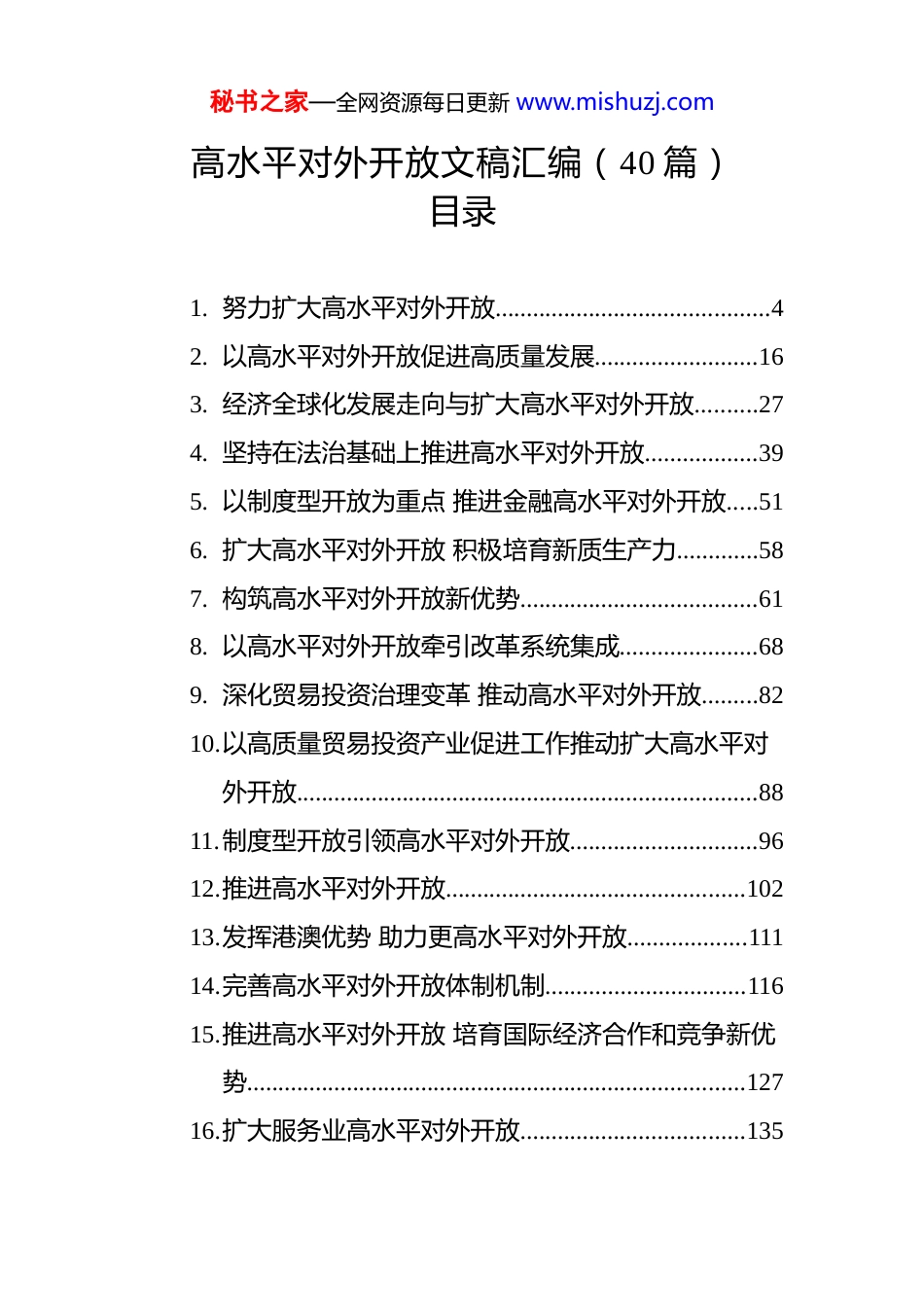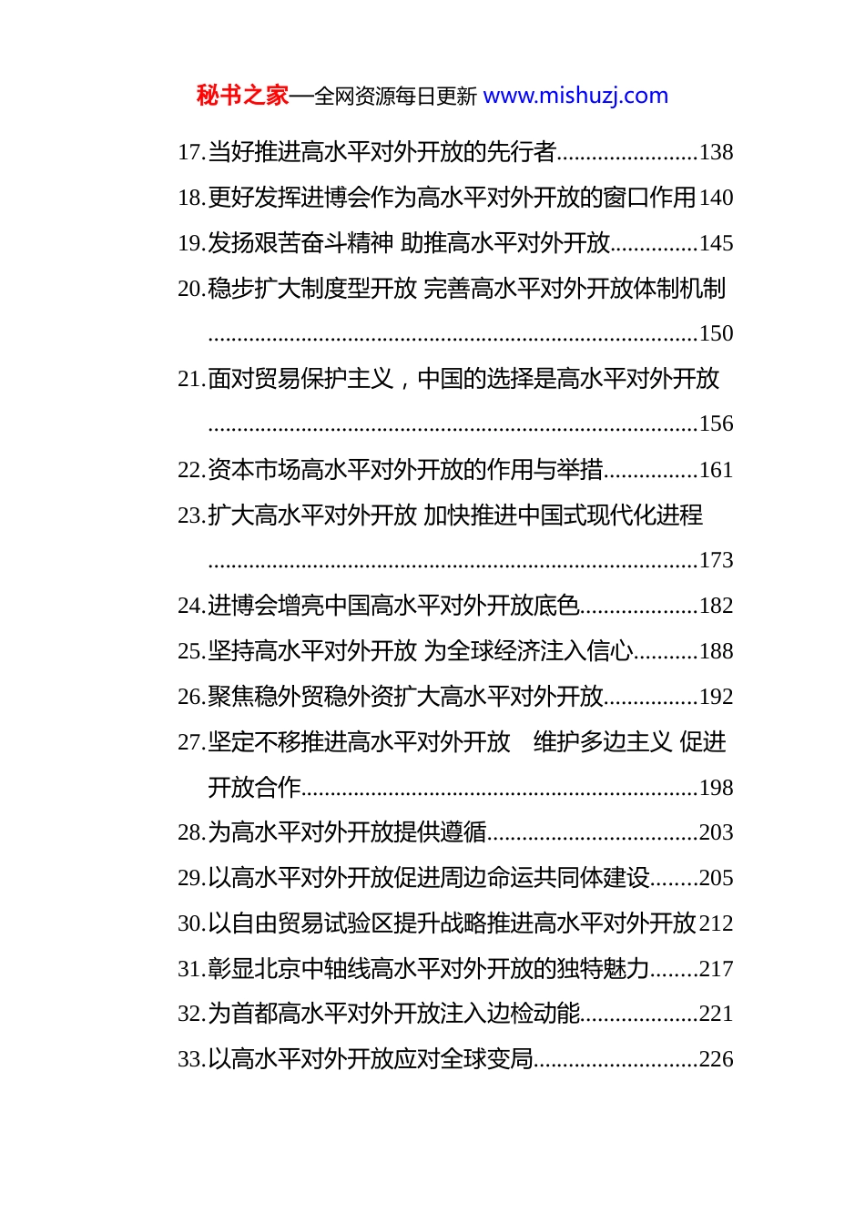 秘书之家—全网资源每日更新 www.mishuzj.com高水平对外开放文稿汇编(40 篇)目录1. 努力扩大高水平对外开放............................................42. 以高水平对外开放促进高质量发展..........................163. 经济全球化发展走向与扩大高水平对外开放..........274. 坚持在法治基础上推进高水平对外开放..................395. 以制度型开放为重点 推进金融高水平对外开放.....516. 扩大高水平对外开放 积极培育新质生产力.............587. 构筑高水平对外开放新优势......................................618. 以高水平对外开放牵引改革系统集成......................689. 深化贸易投资治理变革 推动高水平对外开放.........8210.以高质量贸易投资产业促进工作推动扩大高水平对外开放..........................................................................8811.制度型开放引领高水平对外开放..............................9612.推进高水平对外开放................................................10213.发挥港澳优势 助力更高水平对外开放...................11114.完善高水平对外开放体制机制................................11615.推进高水平对外开放 培育国际经济合作和竞争新优势................................................................................12716.扩大服务业高水平对外开放....................................135秘书之家—全网资源每日更新 www.mishuzj.com17.当好推进高水平对外开放的先行者........................13818.更好发挥进博会作为高水平对外开放的窗口作用14019.发扬艰苦奋斗精神 助推高水平对外开放...............14520.稳步扩大制度型开放 完善高水平对外开放体制机制....................................................................................15021.面对贸易保护主义,中国的选择是高水平对外开放....................................................................................15622.资本市场高水平对外开放的作用与举措................16123.扩大高水平对外开放 加快推进中国式现代化进程....................................................................................17324.进博会增亮中国高水平对外开放底色....................18225.坚持高水平对外开放 为全球经济注入信心...........18826.聚焦稳外贸稳外资扩大高水平对外开放................19227.坚定不移推进高水平对外开放 维护多边主义 促进开放合作....................................................................19828.为高水平对外开放提供遵循....................................20329.以高水平对外开放促进周边命运共同体建设........20530.以自由贸易试验区提升战略推进高水平对外开放21231.彰显北京中轴线高水平对外开放的独特魅力........21732.为首都高水平对外开放注入边检动能....................22133.以高水平对外开放应对全球变局............................226秘书之家—全网资源每日更新 www.mishuzj.com34.以链博会为契机 持续深化高水平对外开放...........22935.夯实高水平对外开放的法治根基............................23336.扩大高水平对外开放的丰富内涵和实施重点........24137.法治化推进高水平对外开放....................................24838.以高水平对外开放赢得主动....................................25439.我国高水平对外开放新格局加速形成....................25740.百年变局加速演进与高水平对外开放....................260秘书之家—全网资源每日更新 www.mishuzj.com努力扩大高水平对外开放2023 年 12 月召开的中央经济工作会议提出,要“扩大高水平对外开放”,这是对党的二十大报告提出的“坚持高水平对外开放”的具体部署。扩大高水平对外开放既是新时代新征程的重要任务,也是加快构建新发展格局、着力推动高质量发展的重要内容。高水平对外开放的衡量标准实现国内国际两个市场有效对接。高水平对外开放...