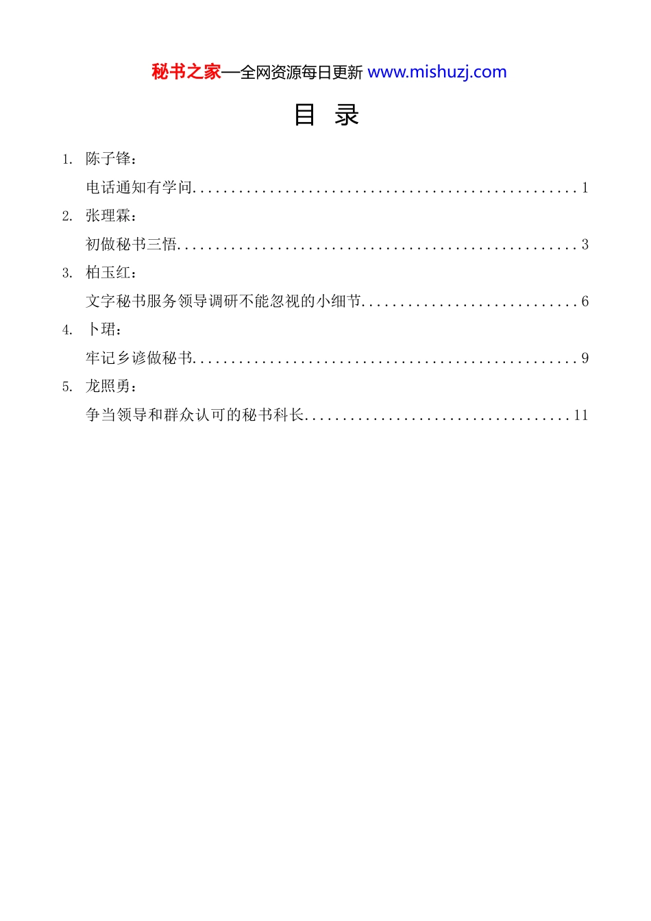 秘书之家—全网资源每日更新 www.mishuzj.com目 录1. 陈子锋: 电话通知有学问..................................................1 2. 张理霖: 初做秘书三悟....................................................3 3. 柏玉红: 文字秘书服务领导调研不能忽视的小细节............................6 4. 卜珺: 牢记乡谚做秘书..................................................9 5. 龙照勇: 争当领导和群众认可的秘书科长...................................11秘书之家—全网资源每日更新 www.mishuzj.com秘书之家—全网资源每日更新 www.mishuzj.com电话通知有学问陈子锋筹备会议时,电话通知各部门参会是办公室人员的一项常规工作。初当秘书时,我认为这个任务比较简单,只需原原本本传达会议通知,讲清时间、地点即可。但随着工作的开展,一个又一个问题接踵而至,我发现要做好这项看似简单的工作还真不容易。这里通过几个例子,跟大家交流一下自己的体会。一、事前:了解清楚很重要某次召开重大活动筹备会议,涉及卫生、安全、宣传等部门。当电话联系到某部门时,对方工作人员为准确通知到位,询问我本次活动需要其部门参与的具体事项有哪些。我愣了一下,因为本次活动方案由某单位牵头制定,我手头并没有准备,只好让对方再与牵头单位联系。这件事虽然顺利解决了,但给我敲了一个警钟:办公室工作不能有半点疏忽,会前通知更不能模棱两可、稀里糊涂,否则就会影响会议效果。从这以后, 每次电话通知前,我都要认真阅读会议方案和会议材料,特别是重点任务、重点对象、注意事项等,了解清楚会议的每一个环节,在头脑中像放电影一样预演“会议流程。正式电话通知前,我会在本子上罗列出会议关键词,比如 时间、地”点、注意事项 等,确保了然于胸。二、事中:一个部门也不能少某次召开电视电话会议,按要求设了分会场,与会部门达三十多个。会议按时开始后,有一个部门的主要负责同志却还没有签到。我赶紧联系其办公室人员,对方答复之前并没有收到会议通知。我这才回忆起来,昨天给他们打过电话,但没人接听,后来我外出办事,一忙就忘了再次打电话过去。这次失误让我懊悔万分。我认真总结了教训,思考怎样才能避免类似问题再次发生,并寻求一个稳妥的解决办法。于是,现在每次电话通知前,我都会在电脑上列出所有与会部门,然后按顺序一一通知,凡通知到位的部门都改成红色字体显示,凡未能接通的部门则仍用黑色字体,并在后面添加上电话号码, 这样做一是方便回头看,对哪些部门还没通知到位一目了然;二是方便再次电话联系。这样把工作做细做实,才能确保不出差错。三、事外:不能仅仅是机械传达某次电话通知会议,接通电话后,对方热情地和我打招呼,准确地说出我秘书之家—全网资源每日更新 www.mishuzj.com的姓和职务。我愣了一下,因为我并不认识他,他解释看到这个座机号码就知道是我办公室的。我这才想起来,有几次打电话到这个部门,都是他接的,但我从没问过他是谁,往往是电话一通,就开始程序化地传达会议要求。这次尴尬引起我的反思:电话通知不仅仅是单向机械传达,也是办公室和部门之间的一次沟通与合作。于是,我开始留心每一次通话。针对接触部门较多的情况,我用一张表格详细记录下每个部门办公室接听电话人员的姓和性别, 并努力记住他(她)的声音。这样,每当电话中传来对方的声音,我都能及时准确地与对方打招呼,电话通知变得不再冷冰冰,沟通更加和谐愉快。办公室工作无小事,哪怕是一件再简单的事,只要肯琢磨、爱动脑,总能发现新天地, 开辟工作的新境界。就拿电话通知会议来说,虽然简单,但其中也有学问,只有认真对待、处处留心,才能确保工作到位。秘书之家—全网资源每日更新 www.mishuzj.com初做秘书三悟张理霖一年前,我从办公室人事科调到秘书科工作。随着对秘书这个岗位慢慢由陌生变得熟悉,我从中也得出了一些感悟。一、敬畏心是从事秘书工作的前提人有敬畏心,才会行有所止。秘书工作者在领导身边,承担着沟通内外、综合协调等职责,更需心怀一颗敬畏心。当秘书,必须敬畏各项规章制度,以“”此作为...