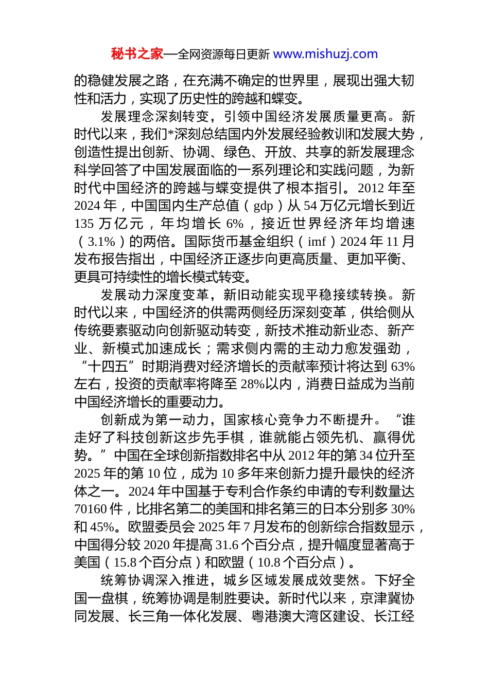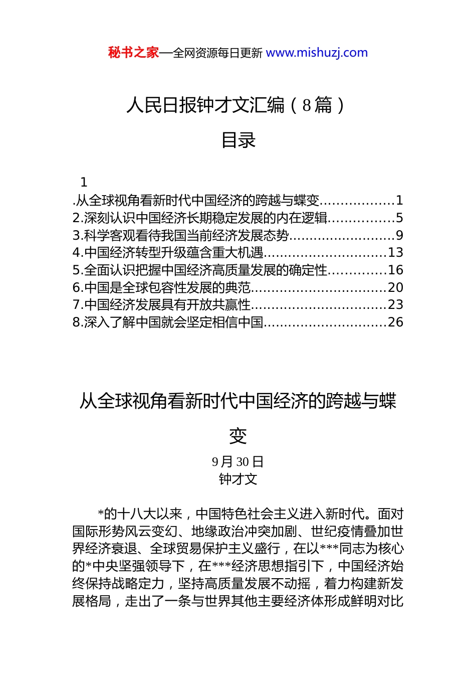 秘书之家—全网资源每日更新 www.mishuzj.com人民日报钟才文汇编(8 篇)目录1.从全球视角看新时代中国经济的跨越与蝶变..................12.深刻认识中国经济长期稳定发展的内在逻辑................53.科学客观看待我国当前经济发展态势..........................94.中国经济转型升级蕴含重大机遇..............................135.全面认识把握中国经济高质量发展的确定性..............166.中国是全球包容性发展的典范.................................207.中国经济发展具有开放共赢性.................................238.深入了解中国就会坚定相信中国..............................26从全球视角看新时代中国经济的跨越与蝶变9 月 30 日钟才文*的十八大以来,中国特色社会主义进入新时代。面对国际形势风云变幻、地缘政治冲突加剧、世纪疫情叠加世界经济衰退、全球贸易保护主义盛行,在以***同志为核心的*中央坚强领导下,在***经济思想指引下,中国经济始终保持战略定力,坚持高质量发展不动摇,着力构建新发展格局,走出了一条与世界其他主要经济体形成鲜明对比秘书之家—全网资源每日更新 www.mishuzj.com的稳健发展之路,在充满不确定的世界里,展现出强大韧性和活力,实现了历史性的跨越和蝶变。发展理念深刻转变,引领中国经济发展质量更高。新时代以来,我们*深刻总结国内外发展经验教训和发展大势,创造性提出创新、协调、绿色、开放、共享的新发展理念科学回答了中国发展面临的一系列理论和实践问题,为新时代中国经济的跨越与蝶变提供了根本指引。2012 年至2024 年,中国国内生产总值(gdp)从 54 万亿元增长到近135 万 亿 元 , 年 均 增 长 6% , 接 近 世 界 经 济 年 均 增 速(3.1%)的两倍。国际货币基金组织(imf)2024 年 11 月发布报告指出,中国经济正逐步向更高质量、更加平衡、更具可持续性的增长模式转变。发展动力深度变革,新旧动能实现平稳接续转换。新时代以来,中国经济的供需两侧经历深刻变革,供给侧从传统要素驱动向创新驱动转变,新技术推动新业态、新产业、新模式加速成长;需求侧内需的主动力愈发强劲,“十四五”时期消费对经济增长的贡献率预计将达到 63%左右,投资的贡献率将降至 28%以内,消费日益成为当前中国经济增长的重要动力。创新成为第一动力,国家核心竞争力不断提升。“谁走好了科技创新这步先手棋,谁就能占领先机、赢得优势。”中国在全球创新指数排名中从 2012 年的第 34 位升至2025 年的第 10 位,成为 10 多年来创新力提升最快的经济体之一。2024 年中国基于专利合作条约申请的专利数量达70160 件,比排名第二的美国和排名第三的日本分别多 30%和 45%。欧盟委员会 2025 年 7 月发布的创新综合指数显示,中国得分较 2020 年提高 31.6 个百分点,提升幅度显著高于美国(15.8 个百分点)和欧盟(10.8 个百分点)。统筹协调深入推进,城乡区域发展成效斐然。下好全国一盘棋,统筹协调是制胜要诀。新时代以来,京津冀协同发展、长三角一体化发展、粤港澳大湾区建设、长江经秘书之家—全网资源每日更新 www.mishuzj.com济带发展、黄河流域生态保护和高质量发展等区域重大战略落地落实,打赢脱贫攻坚战,推进乡村全面振兴。农村居民收入增速连续多年超过城镇居民,中小城市和广大乡镇成为新的消费热土,城乡面貌深刻改变。现行标准下近 1亿农村贫困人口实现脱贫。英国《经济学人》刊文指出,“绝对贫困在中国已成为历史”。绿色转型全面加速,推动人与自然和谐共生。绿色是新时代中国经济高质量发展的底色。*的十八大以来,我们统筹高质量发展和高水平保护,坚定不移走生态优先、节约集约、绿色低碳高质量发展道路,深入践行绿水青山就是金山银山理念,以碳达峰碳中和工作为引领,协同推进降碳、减污、扩绿、增长,深化生态文明体制改革,健全绿色低碳发展机制,加快经济社会全面绿色转型。世界经济论坛 2025 年 6 月发布的能源转型指数显示,与 2020 年相比,中国排名上升了 66 位至 12 位。开放水平进一步提高,国际影响力大幅提升。开放是国...