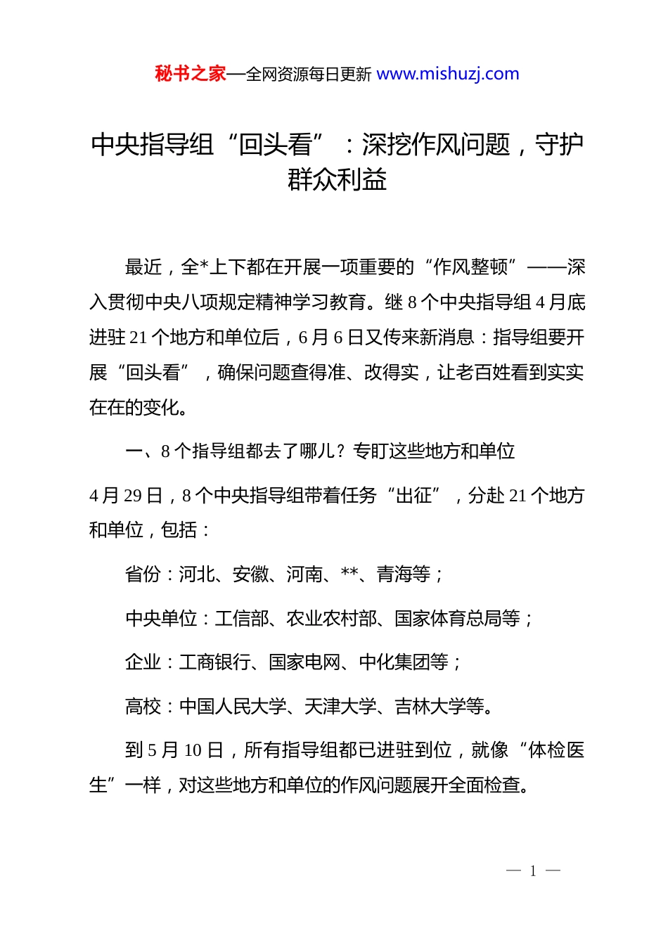 秘书之家—全网资源每日更新 www.mishuzj.com中央指导组“回头看”:深挖作风问题,守护群众利益最近,全*上下都在开展一项重要的“作风整顿”——深入贯彻中央八项规定精神学习教育。继 8 个中央指导组 4 月底进驻 21 个地方和单位后,6 月 6 日又传来新消息:指导组要开展“回头看”,确保问题查得准、改得实,让老百姓看到实实在在的变化。一、8 个指导组都去了哪儿?专盯这些地方和单位4 月 29 日,8 个中央指导组带着任务“出征”,分赴 21 个地方和单位,包括:省份:河北、安徽、河南、**、青海等;中央单位:工信部、农业农村部、国家体育总局等;企业:工商银行、国家电网、中化集团等;高校:中国人民大学、天津大学、吉林大学等。到 5 月 10 日,所有指导组都已进驻到位,就像“体检医生”一样,对这些地方和单位的作风问题展开全面检查。— 1 —秘书之家—全网资源每日更新 www.mishuzj.com二、“回头看”看什么?重点查这三个方面6 月 6 日的座谈会上,中央明确要求指导组开展“回头看”,说白了就是“复查复诊”,确保问题不遗漏、整改不敷衍:看问题查摆是否深入有的干部自查时只说“学习不够”“偶尔迟到”等表面问题,指导组会督促他们深挖根源。比如,某单位领导班子最初只提“调研次数少”,经指导组提醒,才发现背后是“官僚主义思想作祟”。看问题清单是否真实具体要求列出具体事例,不能“空对空”。比如,不能只写“存在违规吃喝问题”,要说明“何时何地、和谁吃、谁买单”。看领导干部是否带头查改领导机关和干部必须“把自己摆进去”。比如,某省一位厅长主动报告“曾接受管理对象赠送的土特产”,并带头整改,起到了示范作用。三、动真格纠歪风:这些典型问题被通报— 2 —秘书之家—全网资源每日更新 www.mishuzj.com指导组进驻近一个月来,已经揪出不少问题。最近,中央公开通报了三起典型案例:河南某单位干部:违规接受企业老板安排的高档宴请,被免去职务并通报;安徽某干部:多次收受管理对象赠送的烟酒和购物卡,被立案审查;湖北某部门:对群众反映的“低保办理拖延”问题敷衍塞责,相关负责人被约谈。这些案例释放出鲜明信号:不管是谁,只要顶风违纪,就一定会被严肃处理!四、建章立制防反弹:以后这些行为行不通了为了防止问题反弹,各地正在抓紧完善制度:针对违规收礼:建立“礼品登记制”,干部收到礼品必须在 3 个工作日内上报,隐瞒不报将被追责;针对不作为:推行“干部作风考核制”,将群众满意度与晋升、奖金挂钩,“躺平式”干部将被约谈、调岗。五、这事和咱老百姓有啥关系?变化看得见!— 3 —秘书之家—全网资源每日更新 www.mishuzj.com以前,部分干部作风不实,老百姓办事难、怨气多。现在随着学习教育深入开展:办事更顺了:河北某社区开通“作风监督热线”,居民拨打后,工作人员 48 小时内必须回应;钱袋子更安全了:安徽某县对低保金发放开展专项检查,追回被克扣资金 200 多万元,全部返还群众。老百姓如何参与?如果发现身边有违规吃喝、收礼或干部不作为等问题,别犹豫,直接通过以下方式反映:拨打 12388 全国纪检监察举报电话;在当地政府官网的“投诉举报”栏目留言;部分地方还推出“随手拍”小程序,拍照上传即可举报。总结:改作风不是一阵风,是要让老百姓长期得实惠中央八项规定学习教育不是“走过场”,而是要通过“查问题、纠歪风、建制度”,让干部作风彻底转变。就像河北某村的老百姓说的:“现在干部下乡不再是‘喝喝酒、走走过场’,而是带着项目和政策来,帮我们解决实际困难!”这场“作风体检”动真格、求实效,最终目的只有一个:— 4 —秘书之家—全网资源每日更新 www.mishuzj.com让干部把心思用在为老百姓办实事上,让咱们的日子越过越舒心!— 5 —