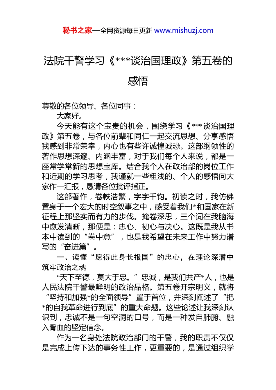 秘书之家—全网资源每日更新 www.mishuzj.com法院干警学习《***谈治国理政》第五卷的感悟尊敬的各位领导、各位同事:大家好。今天能有这个宝贵的机会,围绕学习《***谈治国理政》第五卷,与各位前辈和同仁一起交流思想、分享感悟我感到非常荣幸,内心也有些许诚惶诚恐。这部纲领性的著作思想深邃、内涵丰富,对于我们每个人来说,都是一座常学常新的思想宝库。结合我个人在政治部的岗位工作和近期的学习思考,我谨就一些粗浅的、个人的感悟向大家作一汇报,恳请各位批评指正。这部著作,卷帙浩繁,字字千钧。初读之时,我仿佛置身于一个宏大的时空叙事之中,感受着我们*和国家在新征程上那坚实而有力的步伐。掩卷深思,三个词在我脑海中愈发清晰,那便是:忠心、初心与决心。这既是我从书本中读到的“卷中意”,也是我希望在未来工作中努力谱写的“奋进篇”。一、读懂“愿得此身长报国”的忠心,在理论深潜中筑牢政治之魂“天下至德,莫大于忠。”忠诚,是我们共产*人,也是人民法院干警最鲜明的政治品格。第五卷开宗明义,就将“坚持和加强*的全面领导”置于首位,并深刻阐述了“把*的自我革命进行到底”的重大命题。这些论述让我深刻认识到,忠诚不是一句空洞的口号,而是一种发自肺腑、融入骨血的坚定信念。作为一名身处法院政治部门的干警,我的职责不仅仅是完成上传下达的事务性工作,更重要的,是通过组织学秘书之家—全网资源每日更新 www.mishuzj.com习、开展教育,和同志们一道,共同铸就法院队伍的政治忠诚。这就要求我自己必须先学一步、学深一层。我坚持将第五卷与前四卷贯通起来学,反复研读其中关于*的领导、法治建设、意识形态等关键篇章。每多读一遍,我对“两个确立”决定性意义的领悟就更深一层。我认识到,我们所强调的政治判断力、政治领悟力、政治执行力,绝非抽象的概念。它体现在我们能否在纷繁复杂的社会现象中,始终保持清醒的政治头脑;体现在我们能否准确领会中央精神,并将其不折不扣地融入司法工作的每一个环节;更体现在我们面对各种错误思潮和干扰诱惑时,能否站稳脚跟、明辨是非。这种忠诚,最终要落脚于审判执行的主责主业。我们要做的,就是确保*的路线方针政策,如同血液一般,流淌在司法工作的全身脉络之中,真正做到“从政治上看、从法治上办”。作为政治部的干警,我深感责任重大。我们的工作,就是要服务和保障全院干警能够心无旁骛地坚守这份忠诚,让人民法院这把“护民之剑、惩恶之刃”,永远掌握在*和人民手中。二、读懂“但愿苍生俱饱暖”的初心,在司法实践中传递民生温度“治国有常,利民为本。”第五卷中,“人民”二字贯穿始终,其分量重逾千钧。书中深刻指出,“为民造福是立*为公、执政为民的本质要求”,并围绕完善分配制度、实施就业优先战略、健全社会保障体系等作出了一系列重要部署。这些温暖人心的话语和扎实有力的举措,让我时常反思:作为一名法院干警,我能为人民群众的“保暖”做些什么?我常常在诉讼服务中心看到那些步履蹒跚、眼神里写满焦虑的老人,也常常在调解室里听到那些因家庭琐事而激烈争吵、濒临破碎的夫妻。对于我们而言,这或许只是卷宗里一个冰冷的案号,但对于当事人来说,这却是关乎他们一生幸福的天大的事。那一刻,法律条文似乎变得遥秘书之家—全网资源每日更新 www.mishuzj.com远,而人间的悲欢离合却如此真切。这让我深刻体会到,司法工作不仅要有力度,更要有温度。第五卷中关于“实现好、维护好、发展好最广大人民根本利益”的论述,为我们的工作指明了方向。它要求我们不能就案办案、机械司法。在处理涉及劳动就业、教育医疗、婚姻家庭等民生领域的案件时,我们需要多一分耐心、多一份同理心,努力去探寻案件背后的深层原因,力求实现法理情的有机统一,达到案结事了人和的境界。书中提到的“要俯下身来深入调研”,对我触动很大。作为政治部的干警,虽然不直接审理案件,但我们更应该走出办公室,深入基层法庭深入田间地头,去倾听群众最真实的声音,了解他们最迫切的司法需求。只有这样,我们制定的队伍建设方案、推出的便民利民举措,才能真正贴近群众、服务群众,才能将“司法为民”的...