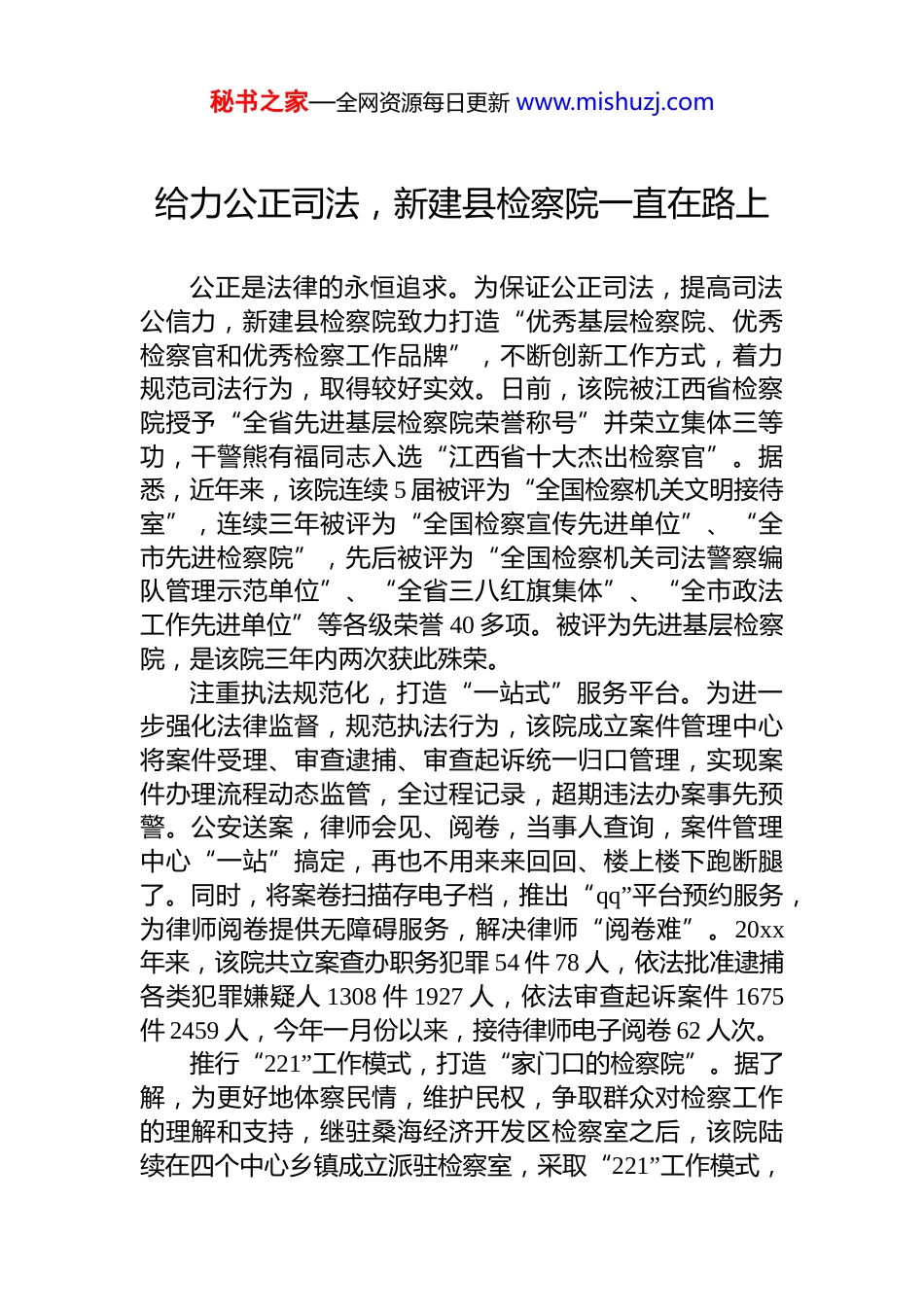 秘书之家—全网资源每日更新 www.mishuzj.com给力公正司法,新建县检察院一直在路上公正是法律的永恒追求。为保证公正司法,提高司法公信力,新建县检察院致力打造“优秀基层检察院、优秀检察官和优秀检察工作品牌”,不断创新工作方式,着力规范司法行为,取得较好实效。日前,该院被江西省检察院授予“全省先进基层检察院荣誉称号”并荣立集体三等功,干警熊有福同志入选“江西省十大杰出检察官”。据悉,近年来,该院连续 5 届被评为“全国检察机关文明接待室”,连续三年被评为“全国检察宣传先进单位”、“全市先进检察院”,先后被评为“全国检察机关司法警察编队管理示范单位”、“全省三八红旗集体”、“全市政法工作先进单位”等各级荣誉 40 多项。被评为先进基层检察院,是该院三年内两次获此殊荣。注重执法规范化,打造“一站式”服务平台。为进一步强化法律监督,规范执法行为,该院成立案件管理中心将案件受理、审查逮捕、审查起诉统一归口管理,实现案件办理流程动态监管,全过程记录,超期违法办案事先预警。公安送案,律师会见、阅卷,当事人查询,案件管理中心“一站”搞定,再也不用来来回回、楼上楼下跑断腿了。同时,将案卷扫描存电子档,推出“qq”平台预约服务,为律师阅卷提供无障碍服务,解决律师“阅卷难”。20xx年来,该院共立案查办职务犯罪 54 件 78 人,依法批准逮捕各类犯罪嫌疑人 1308 件 1927 人,依法审查起诉案件 1675件 2459 人,今年一月份以来,接待律师电子阅卷 62 人次。 推行“221”工作模式,打造“家门口的检察院”。据了解,为更好地体察民情,维护民权,争取群众对检察工作的理解和支持,继驻桑海经济开发区检察室之后,该院陆续在四个中心乡镇成立派驻检察室,采取“221”工作模式,秘书之家—全网资源每日更新 www.mishuzj.com将反贪局、反渎局人员整合,两块牌子、两个岗位职责、一套人马,缓解人员紧张的同时,延伸检察工作触角,实现了检力下沉辐射范围县域全覆盖。群众在家门口就可以举报反映贪污贿赂问题、提出控告申诉,民警不出镇就可以移送批捕起诉,接受法律咨询、举报、控告、审查逮捕审查起诉“一条龙”检察服务,有效解决了服务群众“最后一公里”的问题,群众满意度连年上升。今年第二季度江西省政法部门“群众满意度”测评中,该院检察工作群众满意率为 99.3%,位列全市第二,全省第八,取得了历年来最好成绩。传播公正好声音,打造“微检工作室”。该院高度重视新媒体舆论宣传作用,20xx 年率先开通了新建检察官方微博、微信,抢占新媒体发声阵地,畅通检察工作网络宣传渠道,传递法治正能量。截止目前,共发布微信 128 期,微博 5000 余条,及时回复“微友”和网友的咨询和关注,在广袤的网络空间传唱了“新检好声音”。由该院制作的反腐微视频《门神守门记》每日在县电视台滚动播放,在网络上广泛流传,并获南通市首届“名角普法微视频”三等奖。培育复合型人才,打造高素质检察官团队。为提高检察干警综合素质,该院在“传帮带”的基础上,通过推行中层副职 ab 岗、检委会“小专家组”等制度,开展岗位练兵、业务竞赛、理论研讨活动,鼓励干警参加心理咨询师技能培训等方式,全方位锻炼干警能力。已有 1 名业务骨干入选全国、全省监所检察人才专家库,先后多名干警获“全市侦查监督十佳检察官”、全市“十佳侦查员”、全市“检察业务尖子”称号,6 名干警取得国家三级心理咨询师资格。