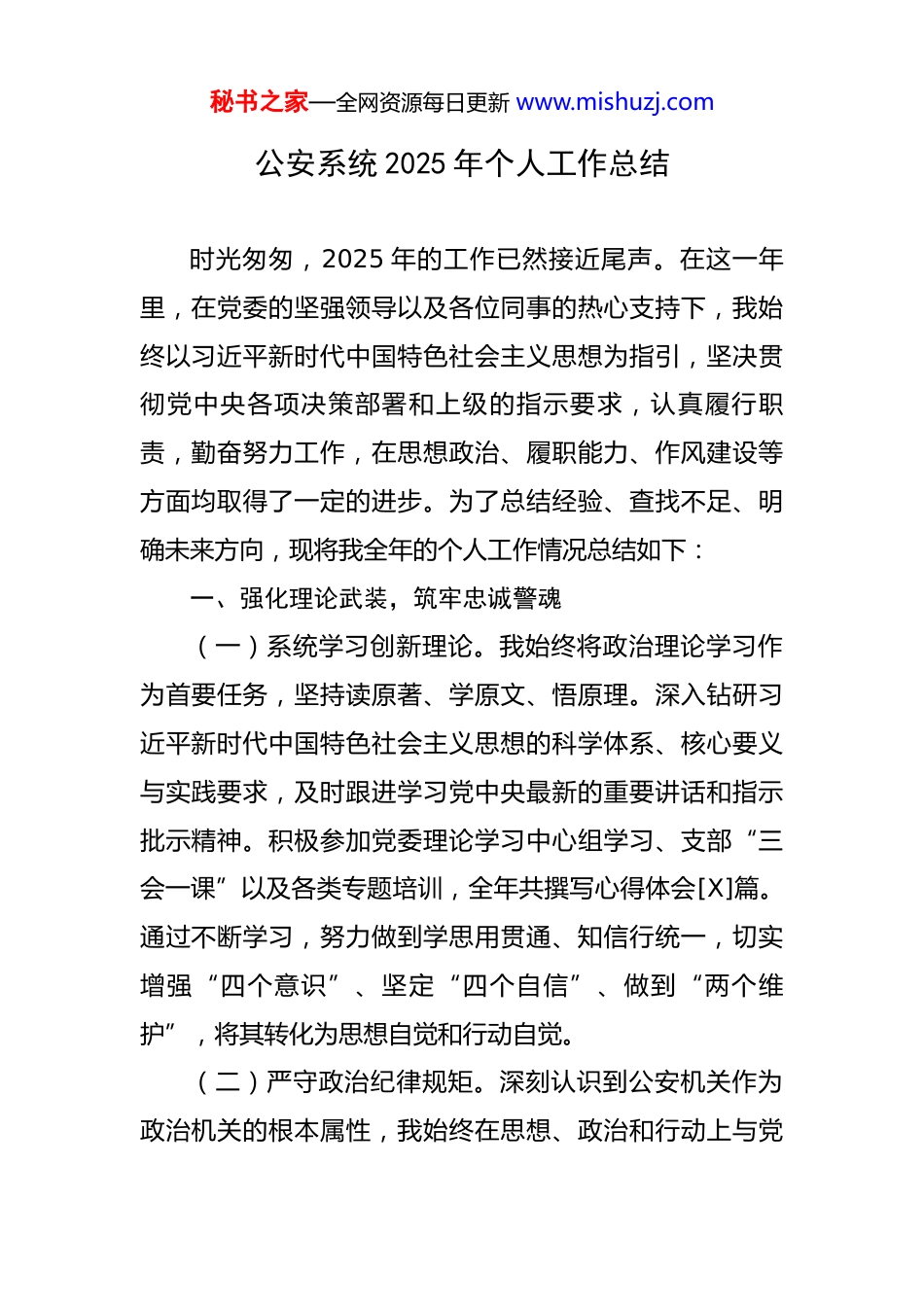 秘书之家—全网资源每日更新 www.mishuzj.com公安系统 2025 年个人工作总结 时光匆匆,2025 年的工作已然接近尾声。在这一年里,在党委的坚强领导以及各位同事的热心支持下,我始终以习近平新时代中国特色社会主义思想为指引,坚决贯彻党中央各项决策部署和上级的指示要求,认真履行职责,勤奋努力工作,在思想政治、履职能力、作风建设等方面均取得了一定的进步。为了总结经验、查找不足、明确未来方向,现将我全年的个人工作情况总结如下:一、强化理论武装,筑牢忠诚警魂(一)系统学习创新理论。我始终将政治理论学习作为首要任务,坚持读原著、学原文、悟原理。深入钻研习近平新时代中国特色社会主义思想的科学体系、核心要义与实践要求,及时跟进学习党中央最新的重要讲话和指示批示精神。积极参加党委理论学习中心组学习、支部“三会一课”以及各类专题培训,全年共撰写心得体会[X]篇。通过不断学习,努力做到学思用贯通、知信行统一,切实增强“四个意识”、坚定“四个自信”、做到“两个维护”,将其转化为思想自觉和行动自觉。(二)严守政治纪律规矩。深刻认识到公安机关作为政治机关的根本属性,我始终在思想、政治和行动上与党秘书之家—全网资源每日更新 www.mishuzj.com中央保持高度一致。严格遵守党的政治纪律、组织纪律、廉洁纪律、群众纪律、工作纪律和生活纪律,坚决反对“两面人”现象,做到令行禁止。确保党的路线方针政策在公安工作中得到不折不扣的贯彻执行,以实际行动维护党的权威和尊严。(三)锤炼坚强党性修养。积极参与党内政治生活,严肃认真地开展批评与自我批评,主动接受党员和群众的监督。持续巩固深化主题教育成果,将学习成果转化为推动工作的强大动力。在面对复杂局面和严峻考验时,不断提升自己的政治定力,始终保持对党和人民的绝对忠诚。二、聚焦主责主业,提升履职效能(一)维护稳定,守护一方平安。密切关注影响社会稳定的各类风险隐患,加强情报信息的搜集与研判工作。积极投身重大活动安保、突发事件应急处置等任务,全年牵头或参与化解涉稳矛盾[X]起,有效处置群体性事件苗头[X]起。通过精准的情报分析和果断的行动,为辖区的持续稳定贡献了自己的力量。(二)打击犯罪,彰显执法威力。紧盯突出违法犯罪活动,深入研究其规律和特点,不断提升精准打击能力。深度参与“猎狐 2025”“云剑 2025”等专项行动,在侦办一起跨境网络赌博案件中,发挥骨干作用,通过细致的侦秘书之家—全网资源每日更新 www.mishuzj.com查工作,梳理资金流向,固定关键证据,为案件的成功侦破提供了有力支撑。全年参与破获各类刑事案件[X]起,抓获犯罪嫌疑人[X]名,有力打击了违法犯罪分子的嚣张气焰。(三)治安管控,构建安全屏障。结合分管领域工作,积极推进社会治安防控体系建设。加强对重点区域、重点行业和重点要素的管控力度,常态化开展安全隐患排查整治工作。充分利用智慧公安建设成果,运用大数据、物联网等先进技术,提升预测预警预防能力。通过一系列有效措施,全年负责区域的治安案件发案率同比下降[X]%,群众的安全感得到进一步增强。(四)服务群众,践行初心使命。牢固树立以人民为中心的发展思想,深入开展“我为群众办实事”实践活动。优化窗口服务流程,提高办事效率,为群众提供更加便捷、高效的服务。积极回应群众的报警求助,及时解决群众的急难愁盼问题。深入社区、学校、企业开展法治宣传和安全教育活动,提升群众的法治意识和自防能力。全年共收到群众感谢信(锦旗)[X]封(面),赢得了群众的广泛赞誉。三、加强作风建设,坚守廉洁底线(一)力戒形式主义官僚主义。严格落实中央八项规秘书之家—全网资源每日更新 www.mishuzj.com定及其实施细则精神,坚决反对“四风”,特别是形式主义和官僚主义的新表现。坚持实事求是,深入基层一线开展调查研究,掌握真实情况,解决实际问题。精简文件会议,改进文风会风,将更多的时间和精力投入到实际工作中,切实提高工作效率。(二)严格遵守廉洁从警规定。认真学习《中国共产党廉洁自律准则》和公安机关的各项铁规禁令,时刻保持自重、自省、自警、自励。严格规范执法行为,...