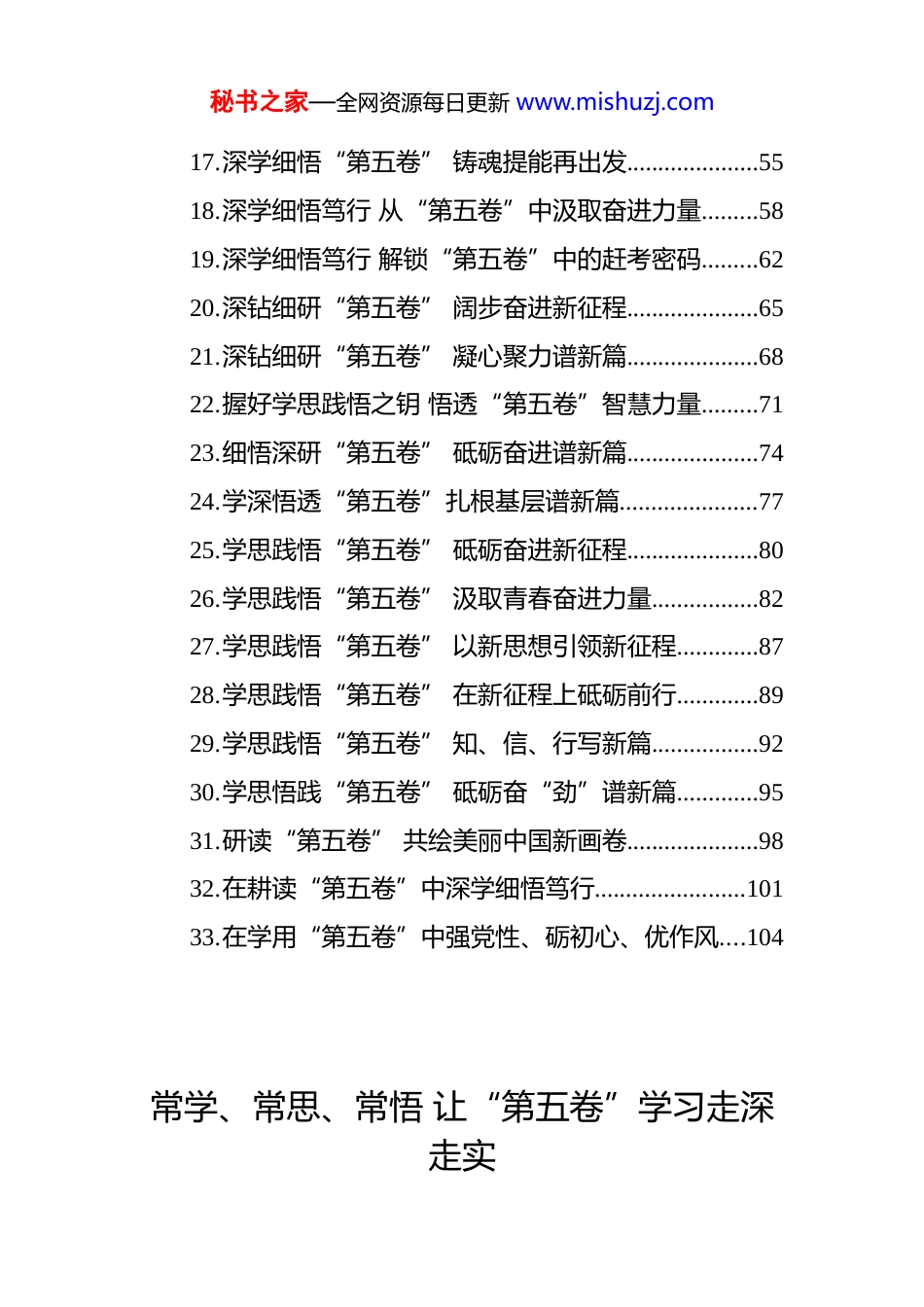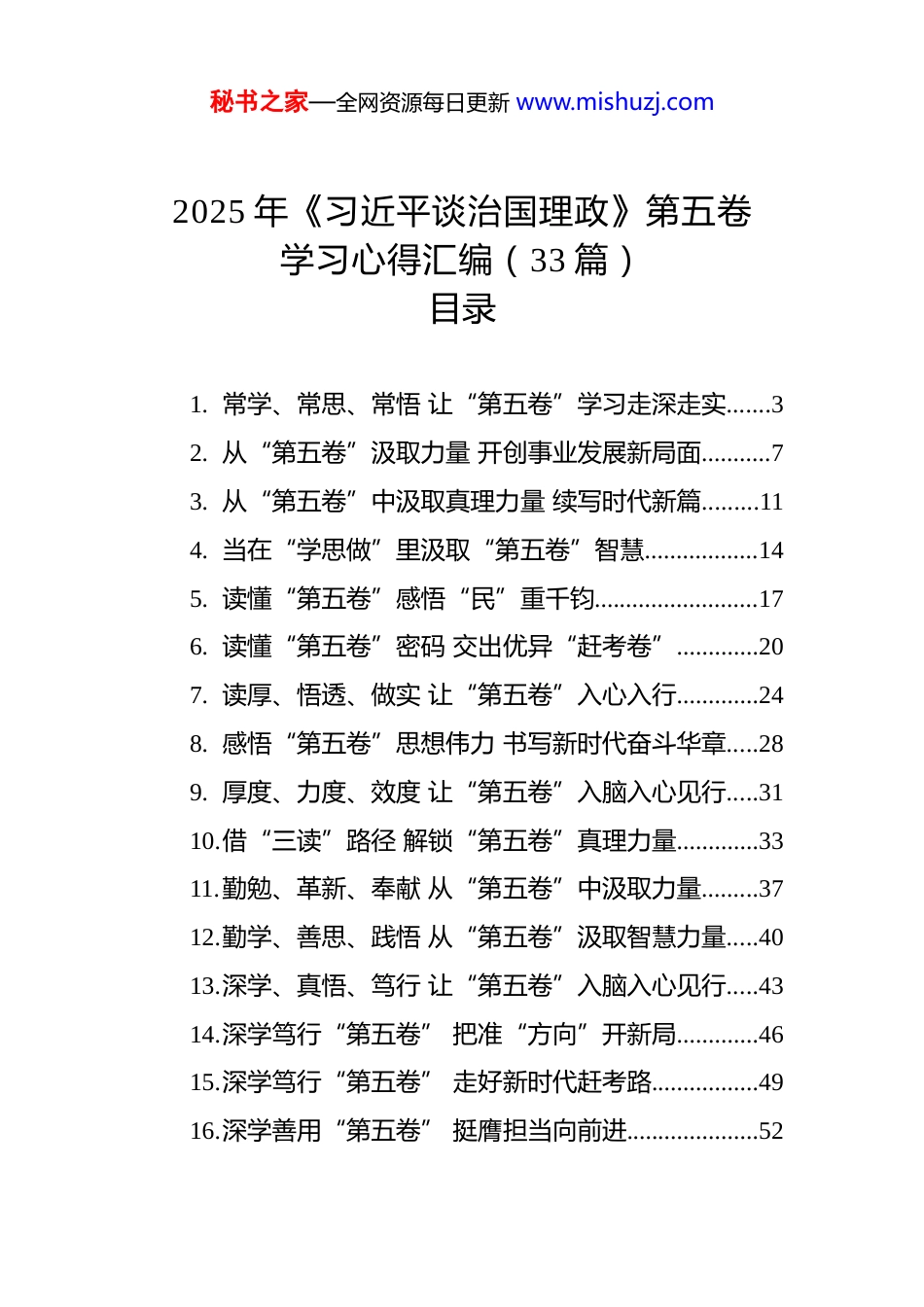 秘书之家—全网资源每日更新 www.mishuzj.com2025 年《习近平谈治国理政》第五卷学习心得汇编(33 篇)目录1. 常学、常思、常悟 让“第五卷”学习走深走实.......32. 从“第五卷”汲取力量 开创事业发展新局面...........73. 从“第五卷”中汲取真理力量 续写时代新篇.........114. 当在“学思做”里汲取“第五卷”智慧..................145. 读懂“第五卷”感悟“民”重千钧..........................176. 读懂“第五卷”密码 交出优异“赶考卷”.............207. 读厚、悟透、做实 让“第五卷”入心入行.............248. 感悟“第五卷”思想伟力 书写新时代奋斗华章.....289. 厚度、力度、效度 让“第五卷”入脑入心见行.....3110.借“三读”路径 解锁“第五卷”真理力量.............3311.勤勉、革新、奉献 从“第五卷”中汲取力量.........3712.勤学、善思、践悟 从“第五卷”汲取智慧力量.....4013.深学、真悟、笃行 让“第五卷”入脑入心见行.....4314.深学笃行“第五卷” 把准“方向”开新局.............4615.深学笃行“第五卷” 走好新时代赶考路.................4916.深学善用“第五卷” 挺膺担当向前进.....................52秘书之家—全网资源每日更新 www.mishuzj.com17.深学细悟“第五卷” 铸魂提能再出发.....................5518.深学细悟笃行 从“第五卷”中汲取奋进力量.........5819.深学细悟笃行 解锁“第五卷”中的赶考密码.........6220.深钻细研“第五卷” 阔步奋进新征程.....................6521.深钻细研“第五卷” 凝心聚力谱新篇.....................6822.握好学思践悟之钥 悟透“第五卷”智慧力量.........7123.细悟深研“第五卷” 砥砺奋进谱新篇.....................7424.学深悟透“第五卷”扎根基层谱新篇......................7725.学思践悟“第五卷” 砥砺奋进新征程.....................8026.学思践悟“第五卷” 汲取青春奋进力量.................8227.学思践悟“第五卷” 以新思想引领新征程.............8728.学思践悟“第五卷” 在新征程上砥砺前行.............8929.学思践悟“第五卷” 知、信、行写新篇.................9230.学思悟践“第五卷” 砥砺奋“劲”谱新篇.............9531.研读“第五卷” 共绘美丽中国新画卷.....................9832.在耕读“第五卷”中深学细悟笃行........................10133.在学用“第五卷”中强党性、砺初心、优作风....104常学、常思、常悟 让“第五卷”学习走深走实秘书之家—全网资源每日更新 www.mishuzj.com中共中央办公厅转发《中央宣传部、中央组织部关于认真组织学习〈***谈治国理政〉第五卷的通知》,并发出通知要求各地区各部门结合实际贯彻落实。《***谈治国理政》第五卷是集中展现**************思想最新成果的权威著作,对于广大*员干部而言,学好这部著作不是阶段性任务,而是贯穿工作始终的政治必修课。要以高度的政治自觉、思想自觉和行动自觉,常学、常思、常悟,把第五卷与前四卷的学习有机贯通起来,切实把学习成果转化为推动工作的强大动力。坚持常学常新,在循序渐进中筑牢理论根基。理论学习最怕“一阵风”,最需久久为功。《***谈治国理政》第五卷涵盖经济、政治、文化、社会、生态文明等多个领域,内容丰富、思想深邃,若仅满足于浅尝辄止、零散阅读,很难把握其内在逻辑与核心要义。广大*员干部要树立“终身学习”的理念,把第五卷学习纳入日常学习计划,既制定短期“精读目标”,明确每天、每周的学习章节与思考重点,又规划长期“贯通任务”,将第五卷与第一卷至第四卷中同一主题的论述串联起来,梳理**************思想的发展脉络与理论体系。学习中要杜绝“形式主义”,不搞“打卡式”学习、“摆拍式”记录,而是带着问题学、秘书之家—全网资源每日更新 www.mishuzj.com联系实际学,通过读原著、学原文、悟原理,逐篇研读、逐句揣摩,在反复学习中加深对*的创新理论的理解,让理论知识真正成为武装头脑的“思想罗盘”。坚持常思常明,在深度钻研中把握核心要义。“学而不思则罔”,理论学习若缺乏深度思...