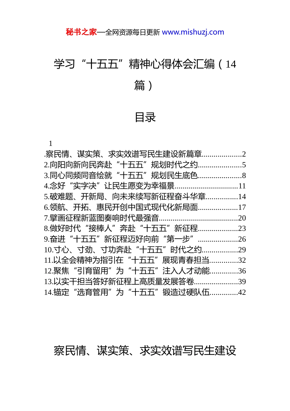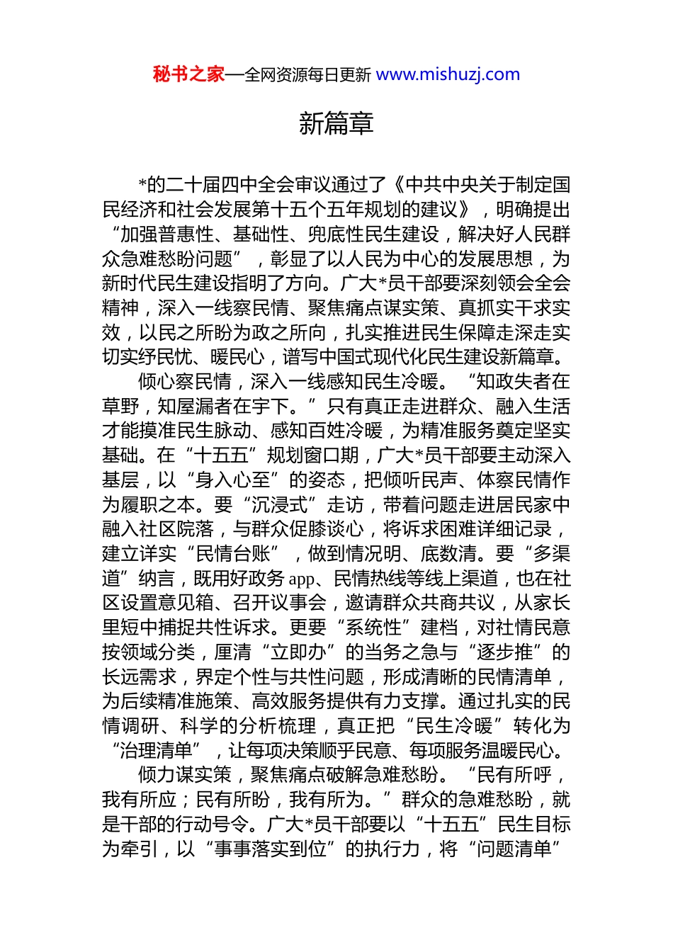 秘书之家—全网资源每日更新 www.mishuzj.com学习“十五五”精神心得体会汇编(14篇)目录1.察民情、谋实策、求实效谱写民生建设新篇章....................22.向阳向新向民奔赴“十五五”规划时代之约......................53.同心同频同音绘就“十五五”规划民生底色......................84.念好“实字决”让民生愿变为幸福景................................115.破难题、开新局、向未来续写新征程奋斗华章................146.领航、开拓、惠民开创中国式现代化新局面....................177.擘画征程新蓝图奏响时代最强音........................................208.做好时代“接棒人”奔赴“十五五”新征程....................239.奋进“十五五”新征程迈好向前“第一步”....................2610.寸心、寸劲、寸功奔赴“十五五”时代之约..................2911.以全会精神为指引在“十五五”展现青春担当..............3212.聚焦“引育留用”为“十五五”注入人才动能..............3613.以实干担当答好新征程上高质量发展答卷......................3914.锚定“选育管用”为“十五五”锻造过硬队伍..............42察民情、谋实策、求实效谱写民生建设秘书之家—全网资源每日更新 www.mishuzj.com新篇章*的二十届四中全会审议通过了《中共中央关于制定国民经济和社会发展第十五个五年规划的建议》,明确提出“加强普惠性、基础性、兜底性民生建设,解决好人民群众急难愁盼问题”,彰显了以人民为中心的发展思想,为新时代民生建设指明了方向。广大*员干部要深刻领会全会精神,深入一线察民情、聚焦痛点谋实策、真抓实干求实效,以民之所盼为政之所向,扎实推进民生保障走深走实切实纾民忧、暖民心,谱写中国式现代化民生建设新篇章。倾心察民情,深入一线感知民生冷暖。“知政失者在草野,知屋漏者在宇下。”只有真正走进群众、融入生活才能摸准民生脉动、感知百姓冷暖,为精准服务奠定坚实基础。在“十五五”规划窗口期,广大*员干部要主动深入基层,以“身入心至”的姿态,把倾听民声、体察民情作为履职之本。要“沉浸式”走访,带着问题走进居民家中融入社区院落,与群众促膝谈心,将诉求困难详细记录,建立详实“民情台账”,做到情况明、底数清。要“多渠道”纳言,既用好政务 app、民情热线等线上渠道,也在社区设置意见箱、召开议事会,邀请群众共商共议,从家长里短中捕捉共性诉求。更要“系统性”建档,对社情民意按领域分类,厘清“立即办”的当务之急与“逐步推”的长远需求,界定个性与共性问题,形成清晰的民情清单,为后续精准施策、高效服务提供有力支撑。通过扎实的民情调研、科学的分析梳理,真正把“民生冷暖”转化为“治理清单”,让每项决策顺乎民意、每项服务温暖民心。倾力谋实策,聚焦痛点破解急难愁盼。“民有所呼,我有所应;民有所盼,我有所为。”群众的急难愁盼,就是干部的行动号令。广大*员干部要以“十五五”民生目标为牵引,以“事事落实到位”的执行力,将“问题清单”秘书之家—全网资源每日更新 www.mishuzj.com变为“履职清单”,勇接“烫手山芋”,敢啃“硬骨头”针对群众反映的各类问题,要坚持精准把脉、靶向施治,面对管道堵塞、证件办理等即时性问题,实行“接诉即办一次清结”,以速度传递温度;面对老旧小区改造、停车位规划等跨部门事项,推行“一事一策、专班推进”机制打通中梗阻;面对物业服务、环境整治等共性难题,则要深挖根源、推进系统治理,实现从“解决一件事”向“办好一类事”走深走实。也要善用科技赋能治理,建设“智慧民生”平台,通过数据研判民生需求、智能匹配资源,推动服务从“人找政策”向“政策找人”转变,持续打通民生堵点,让民生服务可感可及、高效便捷,以科学精准之策回应民生关切,增强群众获得感、幸福感、安全感。倾责求实效,真抓实干筑牢幸福根基。“民生无小事,枝叶总关情。”做好民生工作,重在务实担当、贵在久久为功。广大*员干部要立足高质量发展要求,坚持实效导向,既要做让群众看得见、得实惠的显绩,也要做为后人打基础、利长远的潜绩,切实把工作着力点放在解决群...
