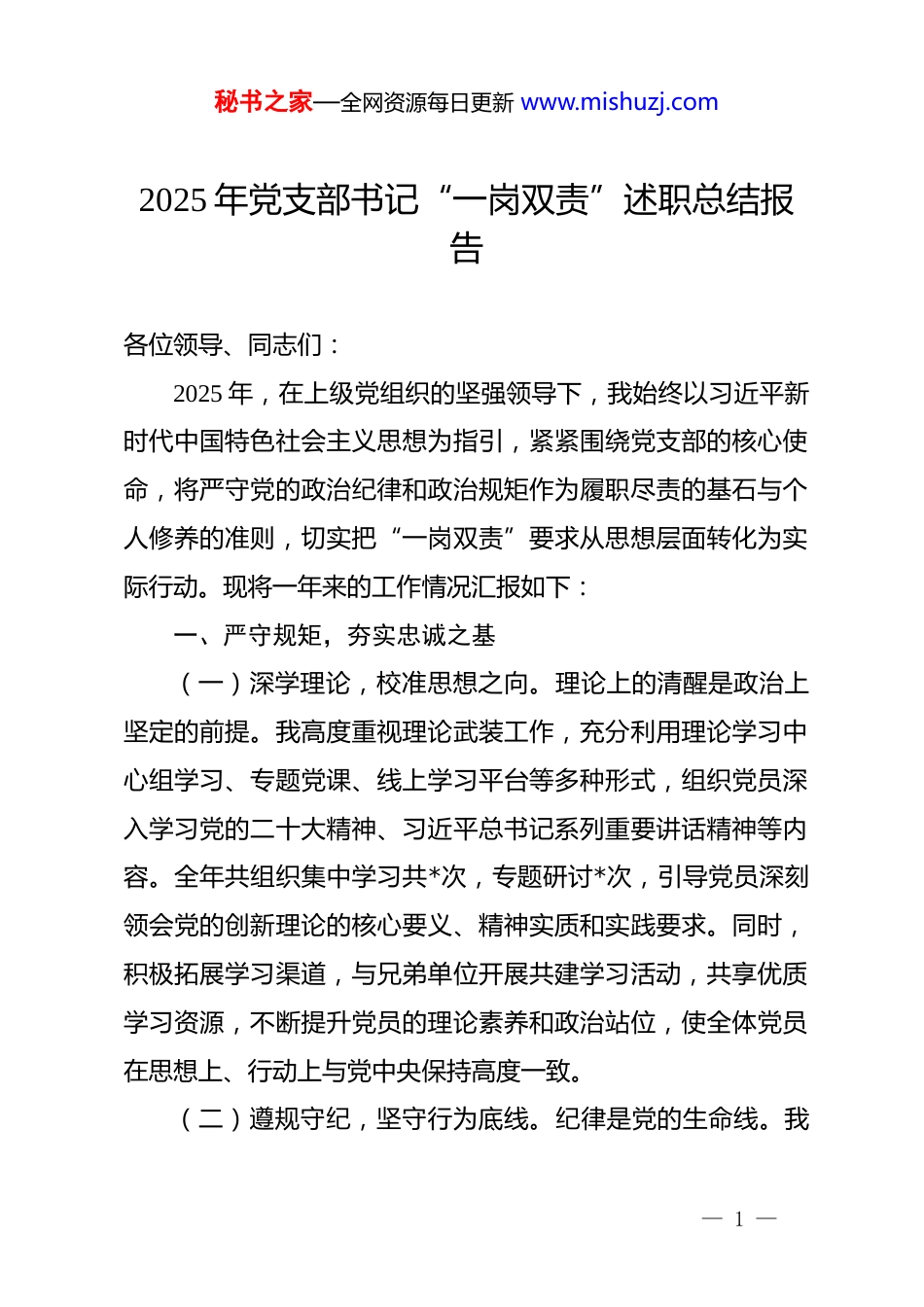 秘书之家—全网资源每日更新 www.mishuzj.com2025 年党支部书记“一岗双责”述职总结报告各位领导、同志们:2025 年,在上级党组织的坚强领导下,我始终以习近平新时代中国特色社会主义思想为指引,紧紧围绕党支部的核心使命,将严守党的政治纪律和政治规矩作为履职尽责的基石与个人修养的准则,切实把“一岗双责”要求从思想层面转化为实际行动。现将一年来的工作情况汇报如下:一、严守规矩,夯实忠诚之基(一)深学理论,校准思想之向。理论上的清醒是政治上坚定的前提。我高度重视理论武装工作,充分利用理论学习中心组学习、专题党课、线上学习平台等多种形式,组织党员深入学习党的二十大精神、习近平总书记系列重要讲话精神等内容。全年共组织集中学习共*次,专题研讨*次,引导党员深刻领会党的创新理论的核心要义、精神实质和实践要求。同时,积极拓展学习渠道,与兄弟单位开展共建学习活动,共享优质学习资源,不断提升党员的理论素养和政治站位,使全体党员在思想上、行动上与党中央保持高度一致。(二)遵规守纪,坚守行为底线。纪律是党的生命线。我— 1 —秘书之家—全网资源每日更新 www.mishuzj.com始终把纪律和规矩挺在前面,坚决贯彻上级党组织的各项决策部署,确保政令畅通。建立健全重点工作任务台账,对全年的*项重点工作进行清单化管理,明确责任人和完成时限,实行定期督查和动态跟踪,确保各项工作有序推进。严格执行请示报告制度,对于重大事项、重要决策,坚持做到事前请示、事后报告,全年累计向上级党组织汇报工作*次。加强对党员干部的日常监督管理,运用好监督执纪“第一种形态”,对发现的苗头性、倾向性问题及时进行提醒谈话,让红脸出汗、咬耳扯袖成为常态,使党员干部自觉遵守党的纪律和规矩。(三)学用结合,巩固忠诚品格。学以致用,方为学。我坚持将党的政治要求贯穿于党支部工作的全过程,不断完善党支部的议事规则和决策程序。明确决策前必须进行充分调研、广泛征求意见、集体讨论研究的“三必”规定,全年共召开支部委员会﹡次,支部党员大会﹡次,所有会议均严格按照程序进行,确保决策科学、民主、合法。在干部选拔任用工作中,始终坚持德才兼备、以德为先的原则,突出政治标准,通过民主推荐、组织考察、公示等环节,选拔任用了﹡名优秀党员干部,为党支部的发展注入了新的活力。二、管党治党,强化责任担当(一)率先垂范,压实主体责任。作为党支部书记,我深— 2 —秘书之家—全网资源每日更新 www.mishuzj.com知自己肩负着管党治党的主体责任。我始终以身作则,带头履行全面从严治党责任,定期研究分析党支部的党建工作形势,制定党建工作计划和目标任务,并将责任分解到每一位支委成员,形成了一级抓一级、层层抓落实的工作格局。全年共主持召开党建工作专题会议﹡次,听取支委成员党建工作汇报﹡次,研究解决党建工作中的重点难点问题﹡个。同时,加强对党建工作的督促检查,定期对各党小组的党建工作进行考核评价,确保党建工作任务落到实处。(二)强基固本,筑牢战斗堡垒。党支部是党的基层组织是党的全部工作和战斗力的基础。我以提升党支部的组织力为重点,突出政治功能,加强党支部的标准化、规范化建设。严格落实“三会一课”、主题党日、组织生活会、民主评议党员等党内组织生活制度,全年共开展主题党日活动﹡次,上党课﹡次,召开组织生活会﹡次,民主评议党员﹡次,不断增强党支部的凝聚力和战斗力。加强党员队伍建设,注重党员的教育培养和管理,通过开展党员培训、志愿服务、岗位练兵等活动,提高党员的综合素质和服务能力。全年共发展党员﹡名,转正党员﹡名,为党支部注入了新鲜血液。(三)正风肃纪,涵养清正风气。作风建设永远在路上。我始终把党风廉政建设作为党支部工作的重要内容,加强对党— 3 —秘书之家—全网资源每日更新 www.mishuzj.com员干部的廉洁教育,通过开展廉政党课、廉政警示教育、廉政谈话等活动,引导党员干部树立正确的权力观、地位观和利益观,增强廉洁自律意识。加强对权力运行的监督制约,建立健全廉政风险防控机制,对重点领域、关键环节进行廉政风险排查和评估,制定相...