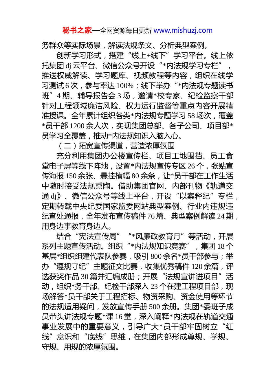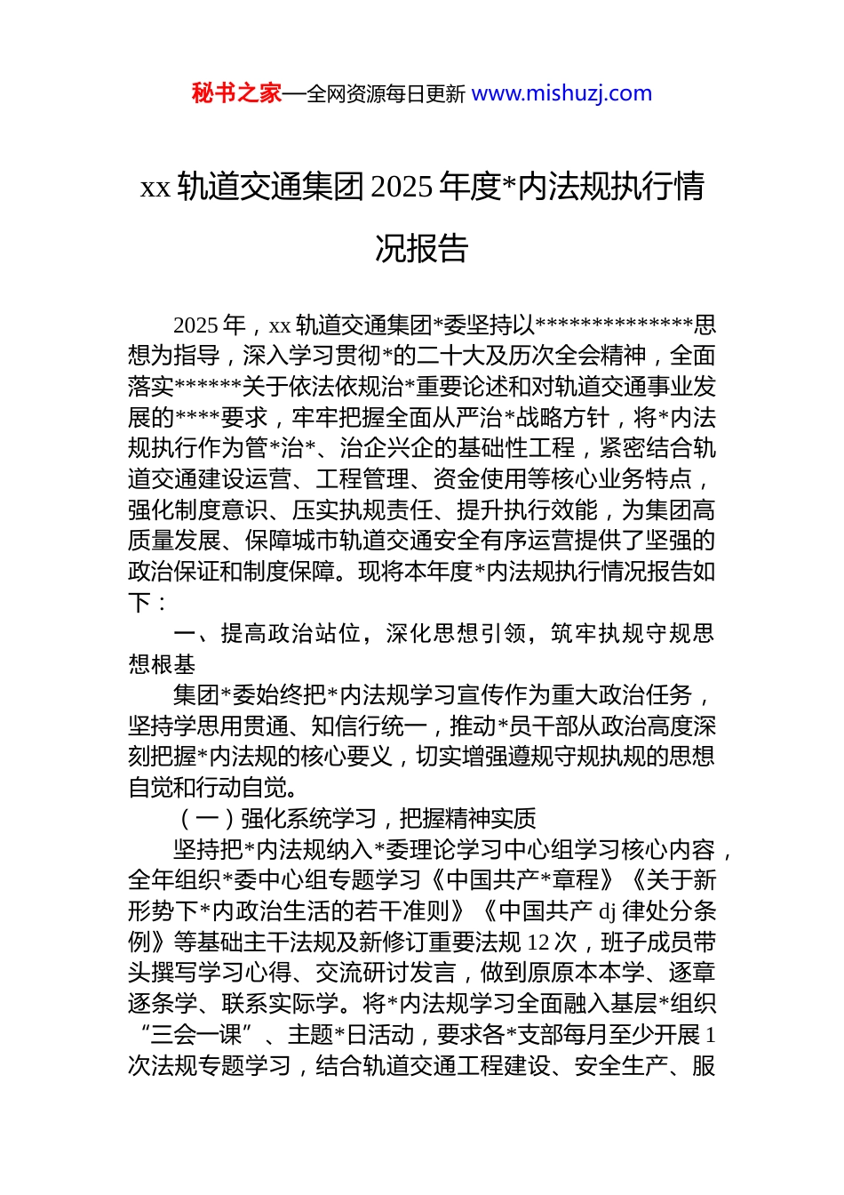 秘书之家—全网资源每日更新 www.mishuzj.comxx 轨道交通集团 2025 年度*内法规执行情况报告2025 年,xx 轨道交通集团*委坚持以**************思想为指导,深入学习贯彻*的二十大及历次全会精神,全面落实******关于依法依规治*重要论述和对轨道交通事业发展的****要求,牢牢把握全面从严治*战略方针,将*内法规执行作为管*治*、治企兴企的基础性工程,紧密结合轨道交通建设运营、工程管理、资金使用等核心业务特点,强化制度意识、压实执规责任、提升执行效能,为集团高质量发展、保障城市轨道交通安全有序运营提供了坚强的政治保证和制度保障。现将本年度*内法规执行情况报告如下:一、提高政治站位,深化思想引领,筑牢执规守规思想根基集团*委始终把*内法规学习宣传作为重大政治任务,坚持学思用贯通、知信行统一,推动*员干部从政治高度深刻把握*内法规的核心要义,切实增强遵规守规执规的思想自觉和行动自觉。(一)强化系统学习,把握精神实质坚持把*内法规纳入*委理论学习中心组学习核心内容,全年组织*委中心组专题学习《中国共产*章程》《关于新形势下*内政治生活的若干准则》《中国共产 dj 律处分条例》等基础主干法规及新修订重要法规 12 次,班子成员带头撰写学习心得、交流研讨发言,做到原原本本学、逐章逐条学、联系实际学。将*内法规学习全面融入基层*组织“三会一课”、主题*日活动,要求各*支部每月至少开展 1次法规专题学习,结合轨道交通工程建设、安全生产、服秘书之家—全网资源每日更新 www.mishuzj.com务群众等实际场景,解读法规条文、分析典型案例。创新学习形式,搭建“线上+线下”学习平台。线上依托集团 dj 云平台、微信公众号开设“*内法规学习专栏”,推送权威解读、学习题库、视频教程等内容,组织在线学习测试 6 次,参与率达 100%;线下举办“*内法规专题读书班”4 期、辅导报告会 3 场,邀请*校专家、纪检监察干部针对工程领域廉洁风险、权力运行监督等重点内容开展精准授课。全年累计组织各类*内法规专题学习 58 场次,覆盖*员干部 1200 余人次,实现集团总部、各子公司、项目部*员学习全覆盖,推动*内法规知识入脑入心。(二)拓宽宣传渠道,营造浓厚氛围充分利用集团办公楼宣传栏、项目工地围挡、员工食堂电子屏等线下阵地,设置*内法规宣传专区 26 个,张贴宣传海报 150 余张、悬挂横幅 80 余条,让*员干部在工作生活中随时接受法规熏陶。借助集团官网、内部刊物《轨道交通 dj》、微信公众号等线上平台,开设“以案释纪”专栏,定期转载中央纪委国家监委网站典型案例、行业内违规违纪查处通报,全年发布宣传稿件 76 篇、典型案例解读 24 期,用身边事教育身边人。结合“宪法宣传周”“*风廉政教育月”等活动,开展系列主题宣传活动。组织“*内法规知识竞赛”,集团 18 个基层*组织组建代表队参赛,吸引 800 余名*员干部参与;举办“遵规守纪”主题征文比赛,收集优秀稿件 120 余篇,评选获奖作品 30 篇并汇编成册;开展“法规宣讲进项目”活动,组织*务干部、纪检干部深入 23 个在建工程项目部,现场解答*员干部关于工程招标、物资采购、资金使用等环节的法规适用疑问,发放宣传手册 500 余册。集团*委班子成员带头讲法规专题*课 16 堂,深入阐释*内法规在轨道交通事业发展中的重要意义,引导广大*员干部牢固树立“红线”意识和“底线”思维,在集团内部形成尊规、学规、守规、用规的浓厚氛围。秘书之家—全网资源每日更新 www.mishuzj.com(三)聚焦“关键少数”,发挥头雁效应紧紧抓住*员领导干部这个“关键少数”,制定《集团领导干部执规履职清单》,明确领导班子成员在*内法规学习、执行、监督等方面的 18 项具体责任。将*内法规掌握和执行情况作为领导干部年度考核、述职评议、选拔任用的重要指标,纳入领导干部个人廉政档案,全年对 32 名中层以上领导干部进行执规情况专项考核,考核结果全部作为评优评先重要依据。建立领导干部“联点包片”制度,集团*委班子成员每人联系 2-3 个基层*组织和重点工程项目部,定期深入联系点督导*内法规执行情况,全年开展专项督导 46 ...