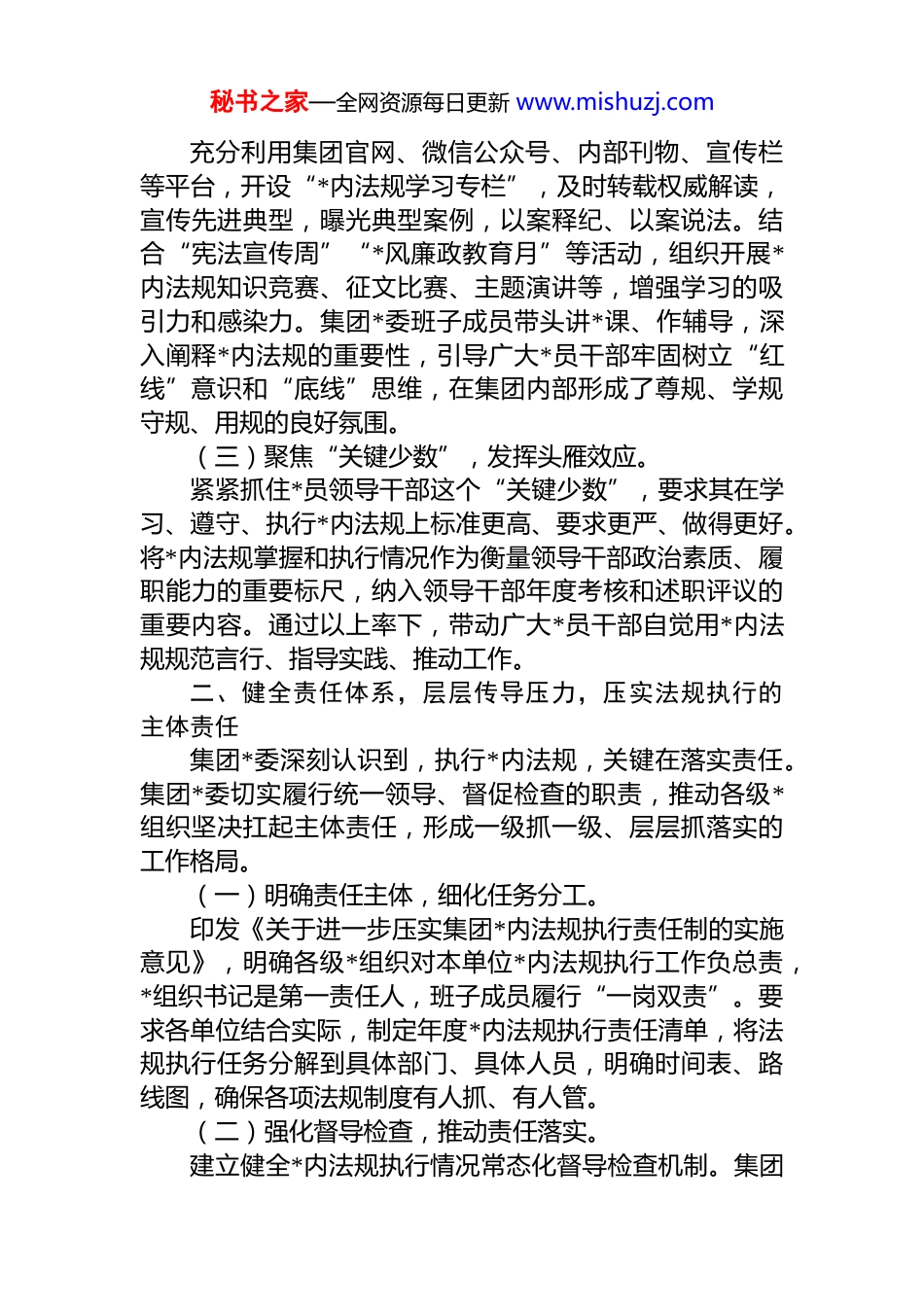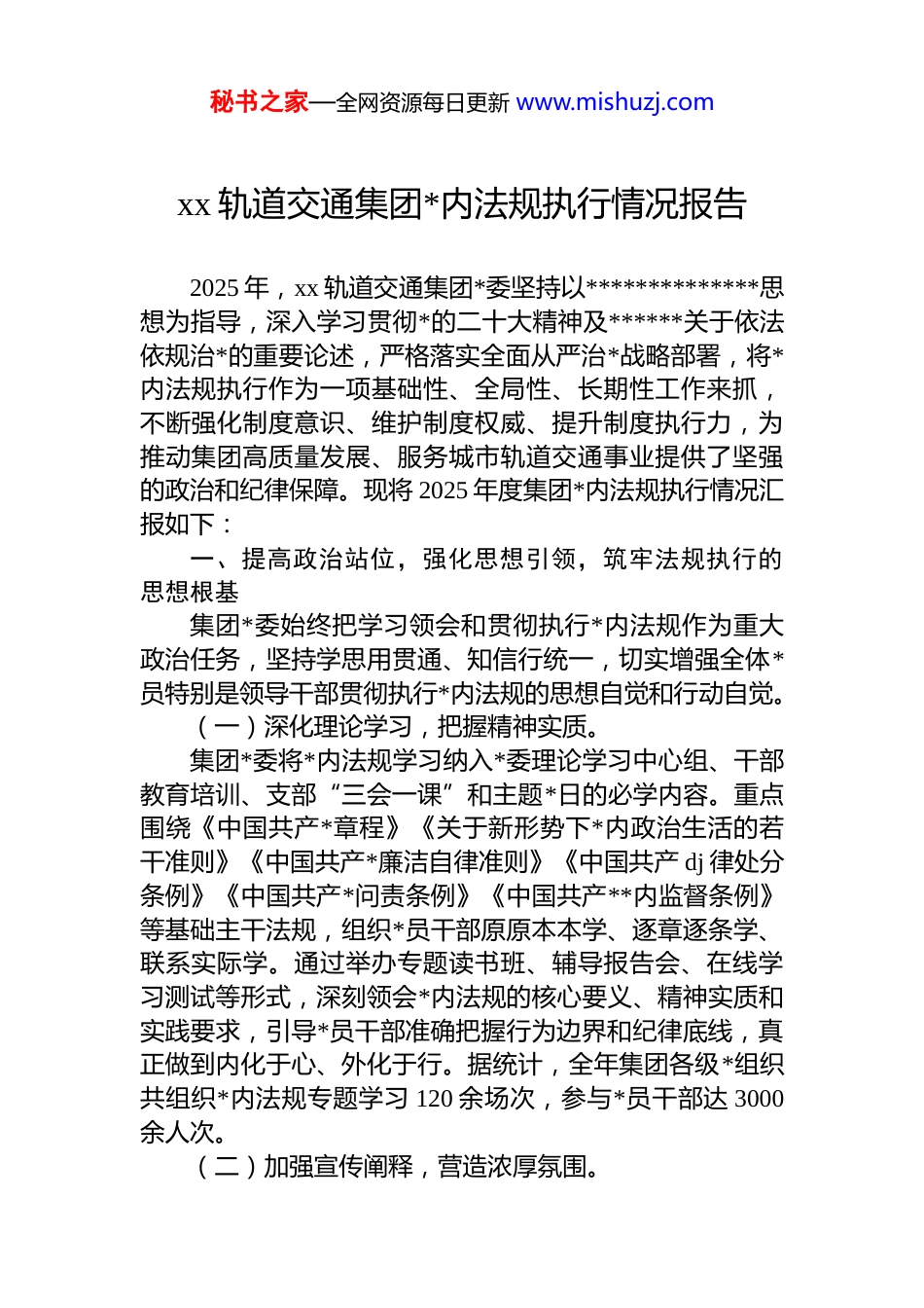 秘书之家—全网资源每日更新 www.mishuzj.comxx 轨道交通集团*内法规执行情况报告2025 年,xx 轨道交通集团*委坚持以**************思想为指导,深入学习贯彻*的二十大精神及******关于依法依规治*的重要论述,严格落实全面从严治*战略部署,将*内法规执行作为一项基础性、全局性、长期性工作来抓,不断强化制度意识、维护制度权威、提升制度执行力,为推动集团高质量发展、服务城市轨道交通事业提供了坚强的政治和纪律保障。现将 2025 年度集团*内法规执行情况汇报如下:一、提高政治站位,强化思想引领,筑牢法规执行的思想根基集团*委始终把学习领会和贯彻执行*内法规作为重大政治任务,坚持学思用贯通、知信行统一,切实增强全体*员特别是领导干部贯彻执行*内法规的思想自觉和行动自觉。(一)深化理论学习,把握精神实质。集团*委将*内法规学习纳入*委理论学习中心组、干部教育培训、支部“三会一课”和主题*日的必学内容。重点围绕《中国共产*章程》《关于新形势下*内政治生活的若干准则》《中国共产*廉洁自律准则》《中国共产 dj 律处分条例》《中国共产*问责条例》《中国共产**内监督条例》等基础主干法规,组织*员干部原原本本学、逐章逐条学、联系实际学。通过举办专题读书班、辅导报告会、在线学习测试等形式,深刻领会*内法规的核心要义、精神实质和实践要求,引导*员干部准确把握行为边界和纪律底线,真正做到内化于心、外化于行。据统计,全年集团各级*组织共组织*内法规专题学习 120 余场次,参与*员干部达 3000余人次。(二)加强宣传阐释,营造浓厚氛围。秘书之家—全网资源每日更新 www.mishuzj.com充分利用集团官网、微信公众号、内部刊物、宣传栏等平台,开设“*内法规学习专栏”,及时转载权威解读,宣传先进典型,曝光典型案例,以案释纪、以案说法。结合“宪法宣传周”“*风廉政教育月”等活动,组织开展*内法规知识竞赛、征文比赛、主题演讲等,增强学习的吸引力和感染力。集团*委班子成员带头讲*课、作辅导,深入阐释*内法规的重要性,引导广大*员干部牢固树立“红线”意识和“底线”思维,在集团内部形成了尊规、学规守规、用规的良好氛围。(三)聚焦“关键少数”,发挥头雁效应。紧紧抓住*员领导干部这个“关键少数”,要求其在学习、遵守、执行*内法规上标准更高、要求更严、做得更好。将*内法规掌握和执行情况作为衡量领导干部政治素质、履职能力的重要标尺,纳入领导干部年度考核和述职评议的重要内容。通过以上率下,带动广大*员干部自觉用*内法规规范言行、指导实践、推动工作。二、健全责任体系,层层传导压力,压实法规执行的主体责任集团*委深刻认识到,执行*内法规,关键在落实责任。集团*委切实履行统一领导、督促检查的职责,推动各级*组织坚决扛起主体责任,形成一级抓一级、层层抓落实的工作格局。(一)明确责任主体,细化任务分工。印发《关于进一步压实集团*内法规执行责任制的实施意见》,明确各级*组织对本单位*内法规执行工作负总责,*组织书记是第一责任人,班子成员履行“一岗双责”。要求各单位结合实际,制定年度*内法规执行责任清单,将法规执行任务分解到具体部门、具体人员,明确时间表、路线图,确保各项法规制度有人抓、有人管。(二)强化督导检查,推动责任落实。建立健全*内法规执行情况常态化督导检查机制。集团秘书之家—全网资源每日更新 www.mishuzj.com纪委联合*群工作部、组织人事部等部门,采取定期检查与随机抽查相结合、听取汇报与实地查看相结合、查阅资料与个别谈话相结合的方式,重点围绕政治纪律、组织纪律廉洁纪律、群众纪律、工作纪律、生活纪律等方面的法规执行情况,对各子公司、直属单位的落实情况进行监督检查。对检查中发现的问题,及时反馈、限期整改,对执行不力的严肃追责问责。全年共开展专项督查 8 次,覆盖全部二级单位,发现并督促整改问题 42 个。(三)严肃执纪问责,维护法规权威。坚持纪严于法、纪在法前,对违反*内法规的行为“零容忍”,发现一起、查处一起,绝不姑息。精准有效运用监督执纪“四种形态”,特别是注重用好第一种形态,抓早抓小、防微杜渐。对于严重...