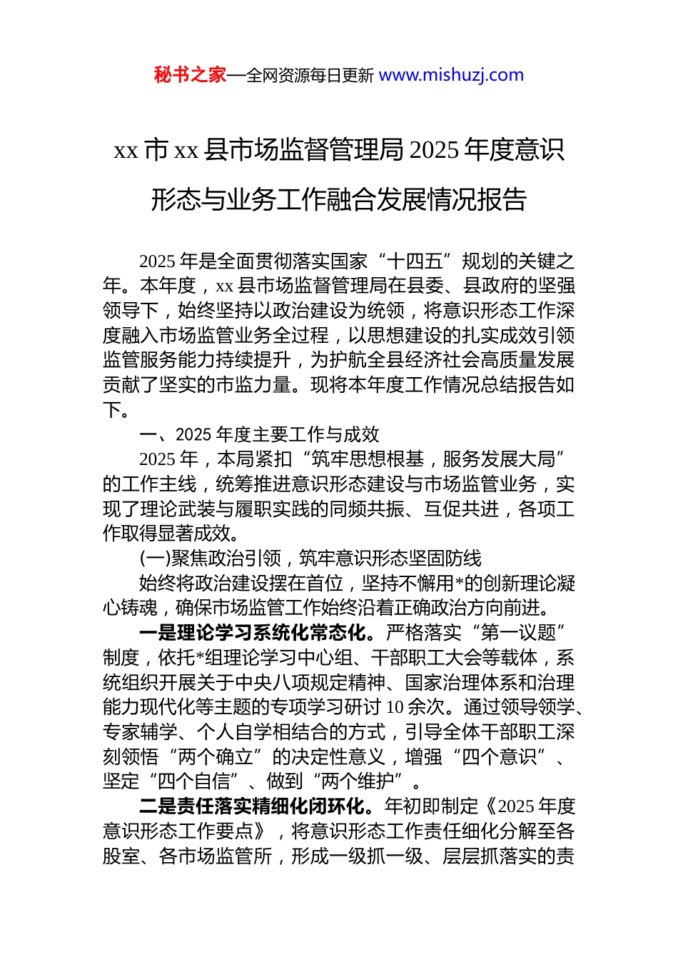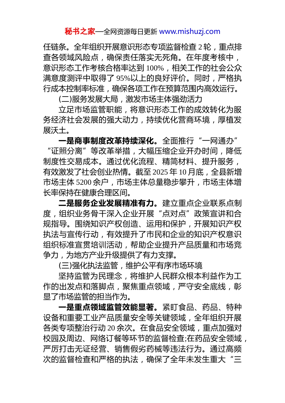 秘书之家—全网资源每日更新 www.mishuzj.comxx 市 xx 县市场监督管理局 2025 年度意识形态与业务工作融合发展情况报告2025 年是全面贯彻落实国家“十四五”规划的关键之年。本年度,xx 县市场监督管理局在县委、县政府的坚强领导下,始终坚持以政治建设为统领,将意识形态工作深度融入市场监管业务全过程,以思想建设的扎实成效引领监管服务能力持续提升,为护航全县经济社会高质量发展贡献了坚实的市监力量。现将本年度工作情况总结报告如下。一、2025 年度主要工作与成效2025 年,本局紧扣“筑牢思想根基,服务发展大局”的工作主线,统筹推进意识形态建设与市场监管业务,实现了理论武装与履职实践的同频共振、互促共进,各项工作取得显著成效。(一)聚焦政治引领,筑牢意识形态坚固防线始终将政治建设摆在首位,坚持不懈用*的创新理论凝心铸魂,确保市场监管工作始终沿着正确政治方向前进。一是理论学习系统化常态化。严格落实“第一议题”制度,依托*组理论学习中心组、干部职工大会等载体,系统组织开展关于中央八项规定精神、国家治理体系和治理能力现代化等主题的专项学习研讨 10 余次。通过领导领学、专家辅学、个人自学相结合的方式,引导全体干部职工深刻领悟“两个确立”的决定性意义,增强“四个意识”、坚定“四个自信”、做到“两个维护”。二是责任落实精细化闭环化。年初即制定《2025 年度意识形态工作要点》,将意识形态工作责任细化分解至各股室、各市场监管所,形成一级抓一级、层层抓落实的责秘书之家—全网资源每日更新 www.mishuzj.com任链条。全年组织开展意识形态专项监督检查 2 轮,重点排查各领域风险点,确保责任落实无死角。在年度考核中,意识形态工作考核合格率达到 100%,相关工作的社会公众满意度测评中取得了 95%以上的良好评价。同时,严格执行成本控制率标准,确保各项工作在预算范围内高效运行。(二)服务发展大局,激发市场主体强劲活力立足市场监管职能,将意识形态工作的成效转化为服务经济社会发展的强大动力,持续优化营商环境,厚植发展沃土。一是商事制度改革持续深化。全面推行“一网通办”“证照分离”等改革举措,大幅压缩企业开办时间,降低制度性交易成本。通过优化流程、精简材料、提升服务,有效激发了社会创业热情。截至 2025 年 10 月底,全县新增市场主体 5200 余户,市场主体总量稳步攀升,市场主体增长率保持在健康合理区间。二是服务企业发展精准有力。建立重点企业联系点制度,组织业务骨干深入企业开展“点对点”政策宣讲和合规指导。围绕知识产权创造、运用和保护,开展知识产权执法与宣传行动,有效提升了市民和企业的知识产权意识组织标准宣贯培训活动,帮助企业提升产品质量和市场竞争力,为地方产业升级提供了有力支撑。(三)强化执法监管,维护公平有序市场环境坚持监管为民理念,将维护人民群众根本利益作为工作的出发点和落脚点,聚焦重点领域,严守安全底线,彰显了市场监管的担当作为。一是重点领域监管效能显著。紧盯食品、药品、特种设备和重要工业产品质量安全等关键领域,全年组织开展各类专项整治行动 20 余次。在食品安全领域,重点加强对校园及周边、网络订餐等环节的监督检查;在药品安全领域,严厉打击无证经营、销售假劣药械等违法行为。通过高频次的监督检查和严格的执法,确保了全年未发生重大“三秘书之家—全网资源每日更新 www.mishuzj.com品一械”安全事故。二是执法办案力度持续加大。以“零容忍”态度严厉打击不正当竞争、价格欺诈、虚假宣传、传销等扰乱市场秩序的违法行为。全年共查处各类违法案件超过 300 件,罚没入库金额近 500 万元,有力震慑了违法分子,净化了市场风气。产品质量监督抽查工作扎实推进,抽检各类产品近千批次,对不合格产品的处置及时率达到 100%,不合格企业的处理率亦保持在高位水平,切实保障了消费者权益。三是消费维权渠道畅通高效。依托 12315、12345 热线平台,全年受理并处置消费者咨询、投诉、举报共计 4000余件。严格按照法定时限和程序处理,投诉举报按时办结率和消费维权办结率均超过 98%,通过行政约谈、调解等方...