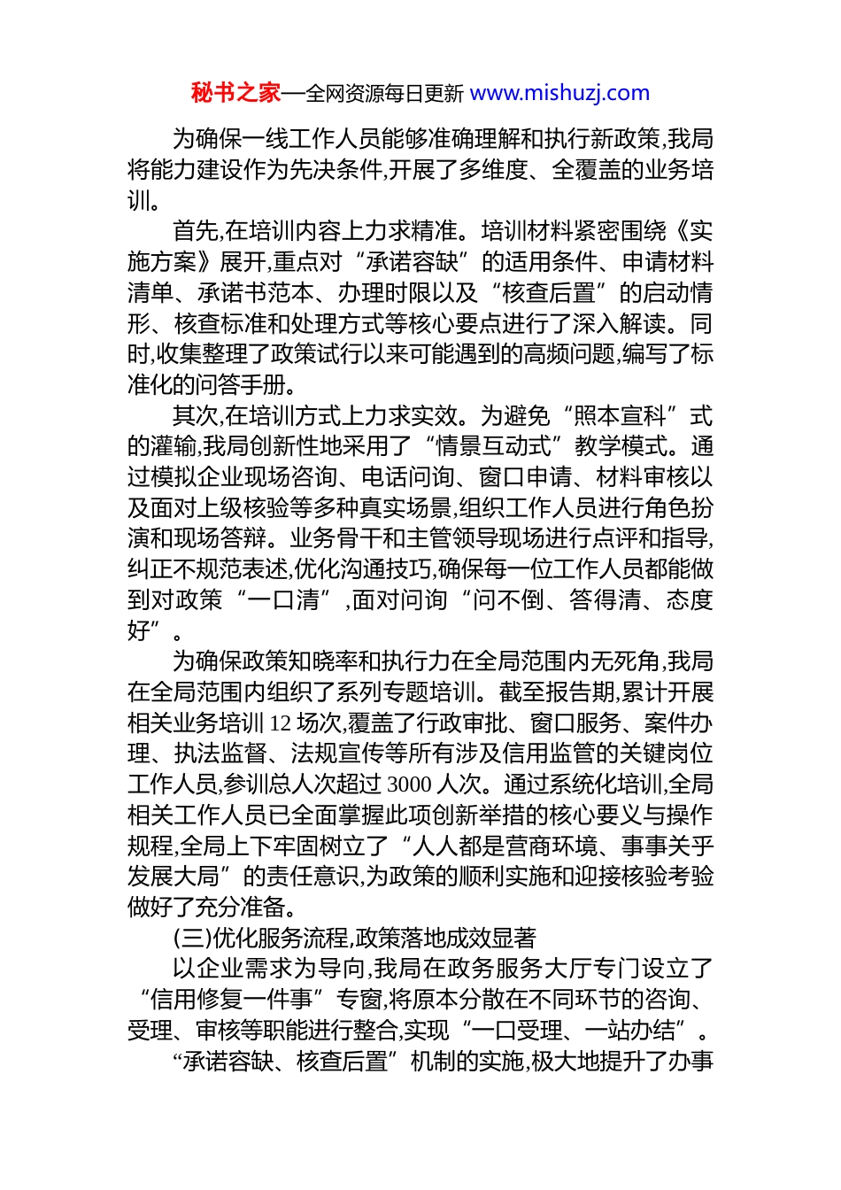 秘书之家—全网资源每日更新 www.mishuzj.comxx 市市场监督管理局 xx 分局 2025 年度信用修复创新工作情况报告为深入贯彻落实上级关于优化营商环境的决策部署,特别是根据市级营商环境建设主管部门于 2025 年 10 月 22 日召开的创新工作调度会议精神,我局积极承接并推动“信用修复承诺容缺、核查后置”创新举措的落地实施。自该项工作启动以来,全局上下统一思想、迅速行动,将此项工作作为深化“放管服”改革、激发市场主体活力的关键抓手,通过周密部署、精准施策与持续优化,取得了一系列阶段性成效。现将有关工作情况总结报告如下。一、基本情况与主要成效我局坚持以制度建设为基础、以能力提升为保障、以流程再造为核心、以宣传引导为辅助,系统性推进信用修复创新工作,确保政策红利直达市场主体,为区域经济高质量发展注入了强劲的“信用动能”。(一)强化组织领导,周密部署准备工作政策落地,组织先行。在接到市级创新项目推广任务后,我局*组高度重视,第一时间召开专题会议进行研究部署,成立了由主要领导任组长、分管领导任副组长、相关业务科室及基层所负责人为成员的信用修复创新工作领导小组。小组迅速制定了详尽的《“承诺容缺、即申即办”信用修复工作实施方案》,明确了该项创新举措的指导思想、适用范围、办理流程、职责分工和风险防控机制。方案对标市级核验要求,将任务逐条分解,责任到人、时限到天,形成了上下贯通、横向协同、高效联动的工作格局,为后续工作的顺利开展奠定了坚实的组织基础。(二)创新培训模式,提升队伍专业能力秘书之家—全网资源每日更新 www.mishuzj.com为确保一线工作人员能够准确理解和执行新政策,我局将能力建设作为先决条件,开展了多维度、全覆盖的业务培训。首先,在培训内容上力求精准。培训材料紧密围绕《实施方案》展开,重点对“承诺容缺”的适用条件、申请材料清单、承诺书范本、办理时限以及“核查后置”的启动情形、核查标准和处理方式等核心要点进行了深入解读。同时,收集整理了政策试行以来可能遇到的高频问题,编写了标准化的问答手册。其次,在培训方式上力求实效。为避免“照本宣科”式的灌输,我局创新性地采用了“情景互动式”教学模式。通过模拟企业现场咨询、电话问询、窗口申请、材料审核以及面对上级核验等多种真实场景,组织工作人员进行角色扮演和现场答辩。业务骨干和主管领导现场进行点评和指导,纠正不规范表述,优化沟通技巧,确保每一位工作人员都能做到对政策“一口清”,面对问询“问不倒、答得清、态度好”。为确保政策知晓率和执行力在全局范围内无死角,我局在全局范围内组织了系列专题培训。截至报告期,累计开展相关业务培训 12 场次,覆盖了行政审批、窗口服务、案件办理、执法监督、法规宣传等所有涉及信用监管的关键岗位工作人员,参训总人次超过 3000 人次。通过系统化培训,全局相关工作人员已全面掌握此项创新举措的核心要义与操作规程,全局上下牢固树立了“人人都是营商环境、事事关乎发展大局”的责任意识,为政策的顺利实施和迎接核验考验做好了充分准备。(三)优化服务流程,政策落地成效显著以企业需求为导向,我局在政务服务大厅专门设立了“信用修复一件事”专窗,将原本分散在不同环节的咨询、受理、审核等职能进行整合,实现“一口受理、一站办结”。“承诺容缺、核查后置”机制的实施,极大地提升了办事秘书之家—全网资源每日更新 www.mishuzj.com效率。对于因客观原因暂时无法提供某些非核心证明材料的企业,在签署信用承诺书后,窗口可先行受理并启动修复程序,待修复完成后在规定期限内补充材料并接受核查。这一改革打破了传统审批模式下“材料不齐不能办”的僵局。自 2025 年 xx 月 xx 日政策正式实施以来,截至 2025 年 11 月 5日,我局“信用修复一件事”专窗共受理相关业务咨询 1800余次,正式受理信用修复申请 152 件,成功为 138 家因轻微、偶发性失信行为而受到行政处罚的市场主体完成信用修复,修复成功率达到 90.8%。通过流程再造,企业信用修复的平均办理时限由原来的15 个工作日大幅缩短至 3 个工作日以内,部分简易案件可实现“即申即办”。申请材料在“承诺容缺”模式下,综...