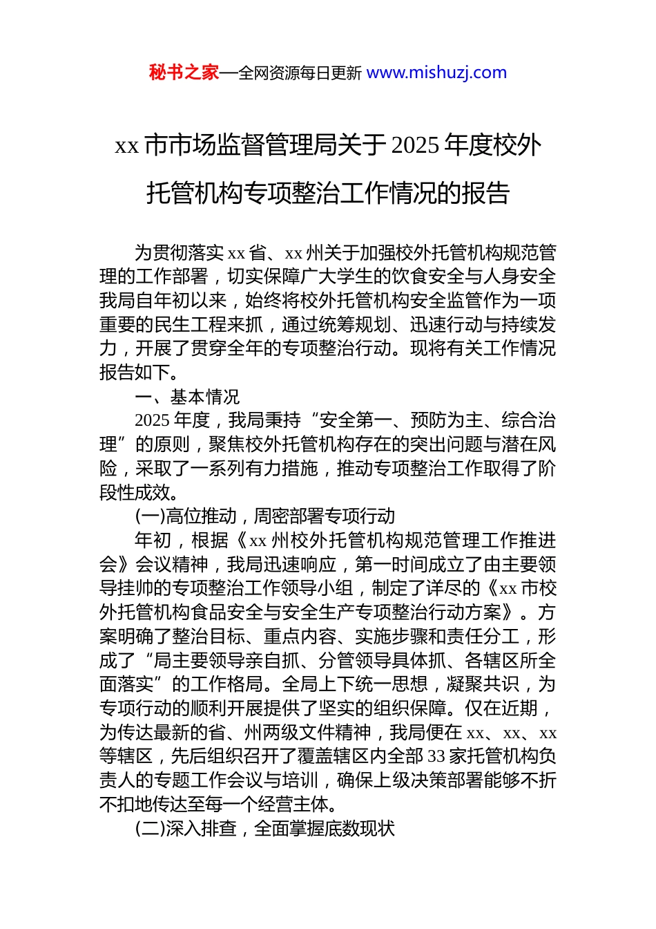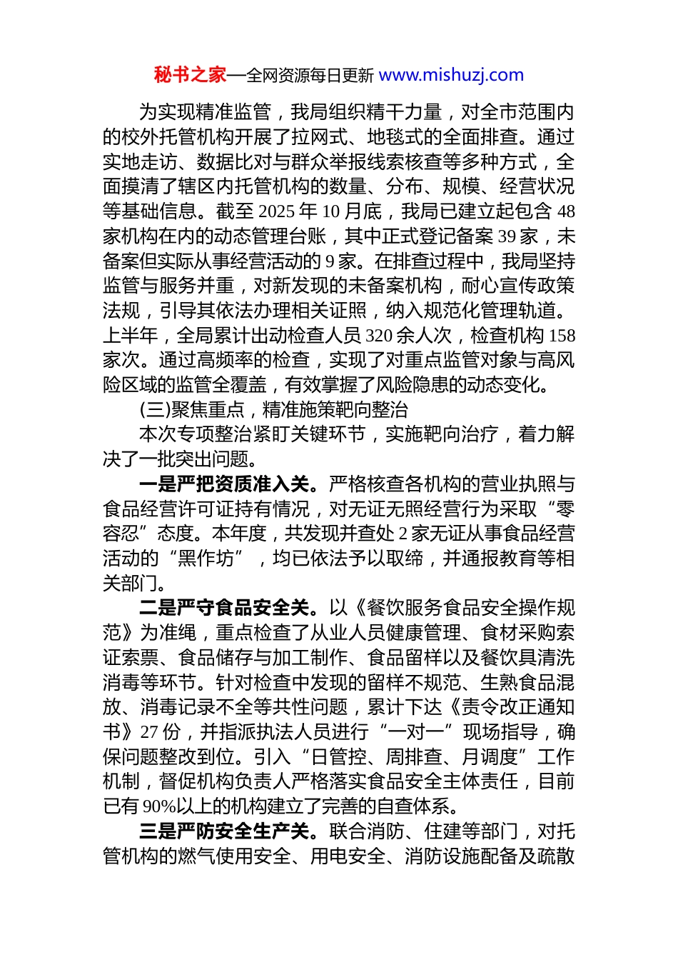 秘书之家—全网资源每日更新 www.mishuzj.comxx 市市场监督管理局关于 2025 年度校外托管机构专项整治工作情况的报告为贯彻落实 xx 省、xx 州关于加强校外托管机构规范管理的工作部署,切实保障广大学生的饮食安全与人身安全我局自年初以来,始终将校外托管机构安全监管作为一项重要的民生工程来抓,通过统筹规划、迅速行动与持续发力,开展了贯穿全年的专项整治行动。现将有关工作情况报告如下。一、基本情况2025 年度,我局秉持“安全第一、预防为主、综合治理”的原则,聚焦校外托管机构存在的突出问题与潜在风险,采取了一系列有力措施,推动专项整治工作取得了阶段性成效。(一)高位推动,周密部署专项行动年初,根据《xx 州校外托管机构规范管理工作推进会》会议精神,我局迅速响应,第一时间成立了由主要领导挂帅的专项整治工作领导小组,制定了详尽的《xx 市校外托管机构食品安全与安全生产专项整治行动方案》。方案明确了整治目标、重点内容、实施步骤和责任分工,形成了“局主要领导亲自抓、分管领导具体抓、各辖区所全面落实”的工作格局。全局上下统一思想,凝聚共识,为专项行动的顺利开展提供了坚实的组织保障。仅在近期,为传达最新的省、州两级文件精神,我局便在 xx、xx、xx等辖区,先后组织召开了覆盖辖区内全部 33 家托管机构负责人的专题工作会议与培训,确保上级决策部署能够不折不扣地传达至每一个经营主体。(二)深入排查,全面掌握底数现状秘书之家—全网资源每日更新 www.mishuzj.com为实现精准监管,我局组织精干力量,对全市范围内的校外托管机构开展了拉网式、地毯式的全面排查。通过实地走访、数据比对与群众举报线索核查等多种方式,全面摸清了辖区内托管机构的数量、分布、规模、经营状况等基础信息。截至 2025 年 10 月底,我局已建立起包含 48家机构在内的动态管理台账,其中正式登记备案 39 家,未备案但实际从事经营活动的 9 家。在排查过程中,我局坚持监管与服务并重,对新发现的未备案机构,耐心宣传政策法规,引导其依法办理相关证照,纳入规范化管理轨道。上半年,全局累计出动检查人员 320 余人次,检查机构 158家次。通过高频率的检查,实现了对重点监管对象与高风险区域的监管全覆盖,有效掌握了风险隐患的动态变化。(三)聚焦重点,精准施策靶向整治本次专项整治紧盯关键环节,实施靶向治疗,着力解决了一批突出问题。一是严把资质准入关。严格核查各机构的营业执照与食品经营许可证持有情况,对无证无照经营行为采取“零容忍”态度。本年度,共发现并查处 2 家无证从事食品经营活动的“黑作坊”,均已依法予以取缔,并通报教育等相关部门。二是严守食品安全关。以《餐饮服务食品安全操作规范》为准绳,重点检查了从业人员健康管理、食材采购索证索票、食品储存与加工制作、食品留样以及餐饮具清洗消毒等环节。针对检查中发现的留样不规范、生熟食品混放、消毒记录不全等共性问题,累计下达《责令改正通知书》27 份,并指派执法人员进行“一对一”现场指导,确保问题整改到位。引入“日管控、周排查、月调度”工作机制,督促机构负责人严格落实食品安全主体责任,目前已有 90%以上的机构建立了完善的自查体系。三是严防安全生产关。联合消防、住建等部门,对托管机构的燃气使用安全、用电安全、消防设施配备及疏散秘书之家—全网资源每日更新 www.mishuzj.com通道畅通情况进行了重点检查。全年共排查出燃气软管老化、灭火器过期、安全出口堵塞等安全隐患 45 处。对发现的隐患,建立问题清单与整改台账,实行销号管理。经过督促整改,截至目前,已有 41 处隐患完成整改,整改完成率达到 91.1%,有效防范了安全事故的发生。(四)强化宣贯,压实各方主体责任坚持惩处与教育相结合,通过多种形式强化宣传引导,旨在从源头上提升经营者的安全意识与责任意识。全年累计组织面向托管机构负责人的法律法规培训 4 场,内容涵盖《食品安全法》《安全生产法》等,累计培训 80 余人次。在培训会上,通过剖析典型案例,以案说法,使经营者深刻认识到违法经营的严重后果。同时,组织所有机构负责人签订《食品安...