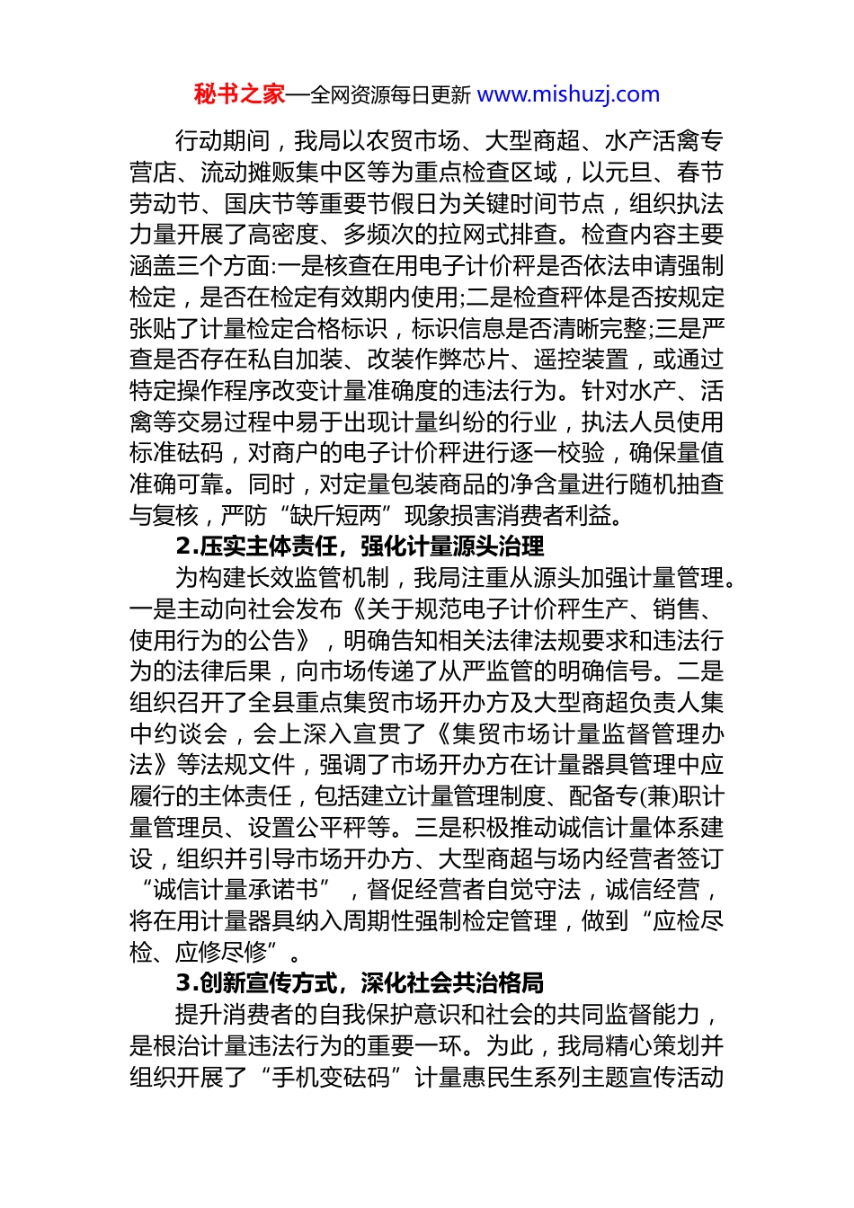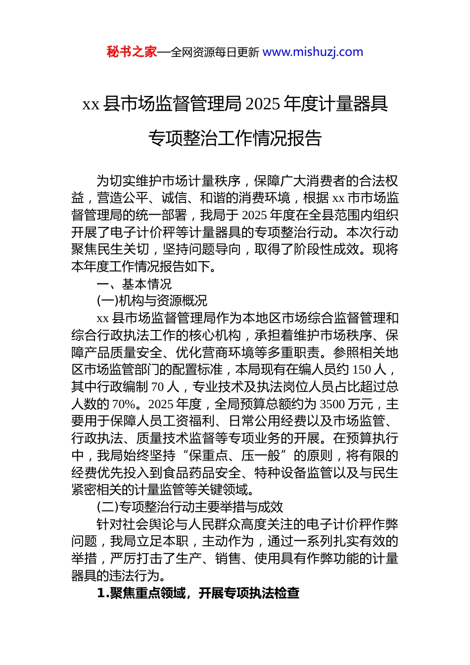 秘书之家—全网资源每日更新 www.mishuzj.comxx 县市场监督管理局 2025 年度计量器具专项整治工作情况报告为切实维护市场计量秩序,保障广大消费者的合法权益,营造公平、诚信、和谐的消费环境,根据 xx 市市场监督管理局的统一部署,我局于 2025 年度在全县范围内组织开展了电子计价秤等计量器具的专项整治行动。本次行动聚焦民生关切,坚持问题导向,取得了阶段性成效。现将本年度工作情况报告如下。一、基本情况(一)机构与资源概况xx 县市场监督管理局作为本地区市场综合监督管理和综合行政执法工作的核心机构,承担着维护市场秩序、保障产品质量安全、优化营商环境等多重职责。参照相关地区市场监管部门的配置标准,本局现有在编人员约 150 人,其中行政编制 70 人,专业技术及执法岗位人员占比超过总人数的 70%。2025 年度,全局预算总额约为 3500 万元,主要用于保障人员工资福利、日常公用经费以及市场监管、行政执法、质量技术监督等专项业务的开展。在预算执行中,我局始终坚持“保重点、压一般”的原则,将有限的经费优先投入到食品药品安全、特种设备监管以及与民生紧密相关的计量监管等关键领域。(二)专项整治行动主要举措与成效针对社会舆论与人民群众高度关注的电子计价秤作弊问题,我局立足本职,主动作为,通过一系列扎实有效的举措,严厉打击了生产、销售、使用具有作弊功能的计量器具的违法行为。1.聚焦重点领域,开展专项执法检查秘书之家—全网资源每日更新 www.mishuzj.com行动期间,我局以农贸市场、大型商超、水产活禽专营店、流动摊贩集中区等为重点检查区域,以元旦、春节劳动节、国庆节等重要节假日为关键时间节点,组织执法力量开展了高密度、多频次的拉网式排查。检查内容主要涵盖三个方面:一是核查在用电子计价秤是否依法申请强制检定,是否在检定有效期内使用;二是检查秤体是否按规定张贴了计量检定合格标识,标识信息是否清晰完整;三是严查是否存在私自加装、改装作弊芯片、遥控装置,或通过特定操作程序改变计量准确度的违法行为。针对水产、活禽等交易过程中易于出现计量纠纷的行业,执法人员使用标准砝码,对商户的电子计价秤进行逐一校验,确保量值准确可靠。同时,对定量包装商品的净含量进行随机抽查与复核,严防“缺斤短两”现象损害消费者利益。2.压实主体责任,强化计量源头治理为构建长效监管机制,我局注重从源头加强计量管理。一是主动向社会发布《关于规范电子计价秤生产、销售、使用行为的公告》,明确告知相关法律法规要求和违法行为的法律后果,向市场传递了从严监管的明确信号。二是组织召开了全县重点集贸市场开办方及大型商超负责人集中约谈会,会上深入宣贯了《集贸市场计量监督管理办法》等法规文件,强调了市场开办方在计量器具管理中应履行的主体责任,包括建立计量管理制度、配备专(兼)职计量管理员、设置公平秤等。三是积极推动诚信计量体系建设,组织并引导市场开办方、大型商超与场内经营者签订“诚信计量承诺书”,督促经营者自觉守法,诚信经营,将在用计量器具纳入周期性强制检定管理,做到“应检尽检、应修尽修”。3.创新宣传方式,深化社会共治格局提升消费者的自我保护意识和社会的共同监督能力,是根治计量违法行为的重要一环。为此,我局精心策划并组织开展了“手机变砝码”计量惠民生系列主题宣传活动秘书之家—全网资源每日更新 www.mishuzj.com活动期间,执法人员与技术专家走进社区、集市和商场,通过设立咨询台、悬挂宣传横幅、发放宣传手册等传统方式,向广大市民普及计量法律法规知识。更具创新性的是现场为市民的手机进行免费称重,并将精确重量制作成标签粘贴在手机背面,使其成为一个随身携带的“标准砝码”,便于消费者在购物时对商家的秤进行初步复核,有效提升了群众对“鬼秤”的识别与防范能力。此举不仅增强了宣传的趣味性和实用性,也极大地激发了公众参与计量监督的热情。截至 2025 年 11 月初,全县共开展集中宣传活动 5 场次,检查电子秤销售单位及各类市场主体 52 家次,现场检查并协助检定电子计价秤超过 400 台,累计与经营主体签订诚信计量承诺书 49 份...