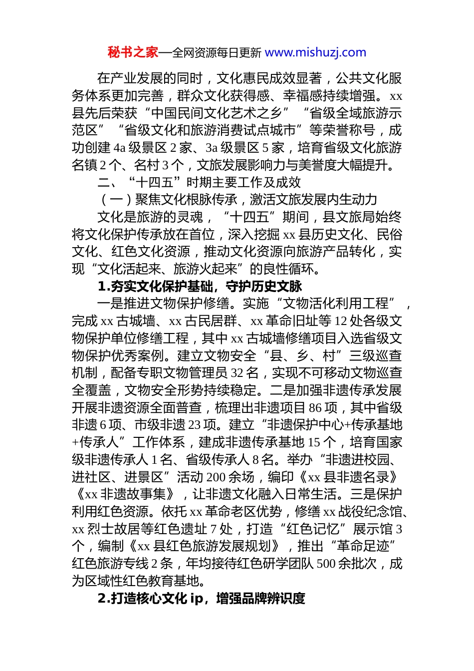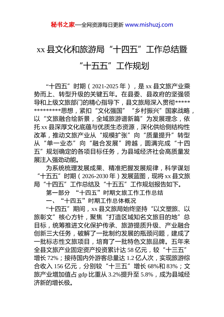 秘书之家—全网资源每日更新 www.mishuzj.comxx 县文化和旅游局“十四五”工作总结暨“十五五”工作规划“十四五”时期(2021-2025 年),是 xx 县文旅产业乘势而上、转型升级的关键五年。在县委、县政府的坚强领导和上级文旅部门的精心指导下,县文旅局深入贯彻**************思想,紧扣“文化强国”“乡村振兴”国家战略,以“文旅融合绘新景,全域旅游谱新篇”为发展理念,依托 xx 县深厚文化底蕴与优质生态资源,深化供给侧结构性改革,推动文旅产业从“规模扩张”向“质量提升”转型从“单一业态”向“融合发展”跨越,圆满完成“十四五”规划确定的各项目标任务,为县域经济社会高质量发展注入强劲动能。为系统梳理发展成果、精准把握发展规律,科学谋划“十五五”时期(2026-2030 年)发展蓝图,现将 xx 县文旅局“十四五”工作总结及“十五五”工作规划报告如下。第一部分 “十四五”时期文旅工作工作总结一、“十四五”时期工作总体概况“十四五”期间,xx 县文旅局始终坚持“以文塑旅、以旅彰文”核心方针,聚焦“打造区域知名文旅目的地”总目标,统筹推进文化保护传承、旅游提质升级、产业融合创新三大任务,破解了一批制约发展的瓶颈问题,建成了一批标志性文旅项目,培育了一批特色文旅品牌。五年来全县文旅产业固定资产投资累计达 58 亿元,较“十三五”增长 72%;接待国内外游客总量达 1.2 亿人次,实现旅游综合收入 156 亿元,分别较“十三五”增长 68%和 83%;文旅产业增加值占 gdp 比重从 3.2%提升至 5.8%,成为县域经济新的增长极。秘书之家—全网资源每日更新 www.mishuzj.com在产业发展的同时,文化惠民成效显著,公共文化服务体系更加完善,群众文化获得感、幸福感持续增强。xx县先后荣获“中国民间文化艺术之乡”“省级全域旅游示范区”“省级文化和旅游消费试点城市”等荣誉称号,成功创建 4a 级景区 2 家、3a 级景区 5 家,培育省级文化旅游名镇 2 个、名村 3 个,文旅发展影响力与美誉度大幅提升。二、“十四五”时期主要工作及成效(一)聚焦文化根脉传承,激活文旅发展内生动力文化是旅游的灵魂,“十四五”期间,县文旅局始终将文化保护传承放在首位,深入挖掘 xx 县历史文化、民俗文化、红色文化资源,推动文化资源向旅游产品转化,实现“文化活起来、旅游火起来”的良性循环。1.夯实文化保护基础,守护历史文脉一是推进文物保护修缮。实施“文物活化利用工程”,完成 xx 古城墙、xx 古民居群、xx 革命旧址等 12 处各级文物保护单位修缮工程,其中 xx 古城墙修缮项目入选省级文物保护优秀案例。建立文物安全“县、乡、村”三级巡查机制,配备专职文物管理员 32 名,实现不可移动文物巡查全覆盖,文物安全形势持续稳定。二是加强非遗传承发展开展非遗资源全面普查,梳理出非遗项目 86 项,其中省级非遗 6 项、市级非遗 23 项。建立“非遗保护中心+传承基地+传承人”工作体系,建成非遗传承基地 15 个,培育国家级非遗传承人 1 名、省级传承人 8 名。举办“非遗进校园、进社区、进景区”活动 200 余场,编印《xx 县非遗名录》《xx 非遗故事集》,让非遗文化融入日常生活。三是保护利用红色资源。依托 xx 革命老区优势,修缮 xx 战役纪念馆、xx 烈士故居等红色遗址 7 处,打造“红色记忆”展示馆 3个,编制《xx 县红色旅游发展规划》,推出“革命足迹”红色旅游专线 2 条,年均接待红色研学团队 500 余批次,成为区域性红色教育基地。2.打造核心文化 ip,增强品牌辨识度秘书之家—全网资源每日更新 www.mishuzj.com借鉴诸暨“西施 ip”全链开发经验,深度挖掘 xx 县“xx文化符号”(如地方特色名人、民俗、技艺等),构建“1+n”文旅 ip 矩阵,让静态文化符号转化为可感、可体验、可消费的动态产品。一是推出 ip 核心产品。以“xx 文化符号”为核心,打造大型实景演艺《xx 印象》,融合地方戏曲、民俗风情与现代光影技术,累计演出 300 余场,接待观众超 15 万人次,成为 xx 县文旅“名片式”项目。开发“xx有礼”系列文创产品,涵盖非遗手作、特色...
