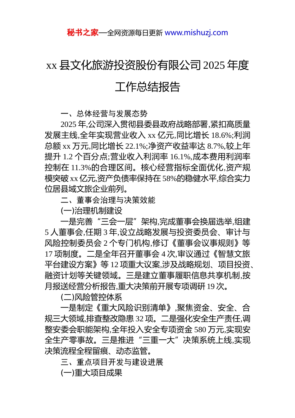 秘书之家—全网资源每日更新 www.mishuzj.comxx 县文化旅游投资股份有限公司 2025 年度工作总结报告一、总体经营与发展态势2025 年,公司深入贯彻县委县政府战略部署,紧扣高质量发展主线,全年实现营业收入 xx 亿元,同比增长 18.6%;利润总额 xx 万元,同比增长 22.1%;净资产收益率达 8.7%,较上年提升 1.2 个百分点;营业收入利润率 16.1%,成本费用利润率控制在 11.3%的合理区间。核心经营指标全面优化,资产规模突破 xx 亿元,资产负债率保持在 58%的稳健水平,综合实力位居县域文旅企业前列。二、董事会治理与决策效能(一)治理机制建设一是完善“三会一层”架构,完成董事会换届选举,组建5 人董事会,任期 3 年,设立战略发展与投资委员会、审计与风险控制委员会 2 个专门机构,修订《董事会议事规则》等17 项制度。二是全年召开董事会 4 次,审议通过《智慧文旅平台建设方案》等 12 项重大议案,涉及战略规划、项目投资、融资计划等关键领域。三是建立董事履职信息共享机制,按月报送经营分析报告,重大决策前开展专项调研 19 次。(二)风险管控体系一是制定《重大风险识别清单》,聚焦资金、安全、合规三大领域,排查整改隐患 32 项。二是强化安全生产责任,调整安委会职能架构,全年投入安全专项资金 580 万元,实现安全生产零事故。三是推进“三重一大”决策系统上线,实现决策流程全程留痕、动态监管。三、重点项目开发与建设进展(一)重大项目成果秘书之家—全网资源每日更新 www.mishuzj.com一是 xx 红色文化教育基地项目,总投资 xx 亿元,一期工程已完成主体建设,累计投资 3.1 亿元,预计年接待游客 50 万人次,创造就业岗位 300 个。二是 xx 康养旅游度假区项目,规划投资 xx 亿元,完成土地平整和基础设施配套,年度投资 xx亿元,建成后将形成“医养游”一体化示范标杆。三是 xx 智慧景区升级项目,投资 xx 亿元部署 5g+vr 导览系统、智能停车管理平台,游客平均停留时长延长 1.8 小时。(二)全域布局优化一是整合县域文旅资源,新获 3 处景区特许经营权,资产规模增加 xx 亿元。二是推进“景区带村”工程,带动周边 5个行政村发展民宿、餐饮业态,村民人均增收 xx 元。三是储备项目库扩容至 15 个,总投资规模逾 xx 亿元。四、经营板块拓展与创新突破(一)核心业务升级一是景区运营板块收入 xx 亿元,占比 55%,实施分时预约、淡季促销策略,淡季客流量提升 35%。二是文化演艺板块推出《xx 传奇》实景演出,年度演出 280 场次,收入 xx 万元,利润率 31%。三是旅游商品开发本土 ip 衍生品 46 款,线上销售额突破 xx 万元。(二)新兴业务培育一是“文旅+农业”融合项目建成采摘园、农创空间 3处,带动农产品溢价 40%。二是投资管理板块完成对 2 家创新企业的股权投资,持股比例分别为 15%和 20%。三是轻资产输出管理模式,承接 3 个外县景区运营咨询业务。五、数字化转型与品牌建设(一)智慧化赋能一是建成“一部手机游 xx”平台,接入服务商户 238 家,用户量达 28 万人,线上交易额占比升至 42%。二是部署智能安防系统 126 套,重点区域应急响应时间缩短至 5 分钟。三是建立游客大数据中心,消费画像准确率达 89%,精准营销转化率提升 27%。秘书之家—全网资源每日更新 www.mishuzj.com(二)品牌影响力提升一是联合 xx 卫视推出《四季 xx》纪录片,全网曝光量超3 亿次。二是打造“xx 文旅节”ip,带动周边消费 xx 亿元。三是社交媒体矩阵增粉 60 万,携程评分升至 4.8 分。六、体制机制改革与管理优化(一)市场化改革一是完成子公司混合所有制改革,引入战略投资者持股30%。二是推行职业经理人制度,面向全国招聘专业人才 5名,高管市场化选聘比例达 60%。三是实施超额利润分享机制,核心团队积极性显著提升。(二)精细化管理一是开展“成本管控年”行动,压降非必要支出 xx 万元。二是优化融资结构,发行公司债券 x 亿元,综合融资成本降至4.8%。三是建立对标管理体系,12 项关键指标达到行业优秀值。七、风险防控与可持续发展(一)重大风险化解一是建立资金预警模型,短期偿债能力提升至 1.8 倍。二是出台《...