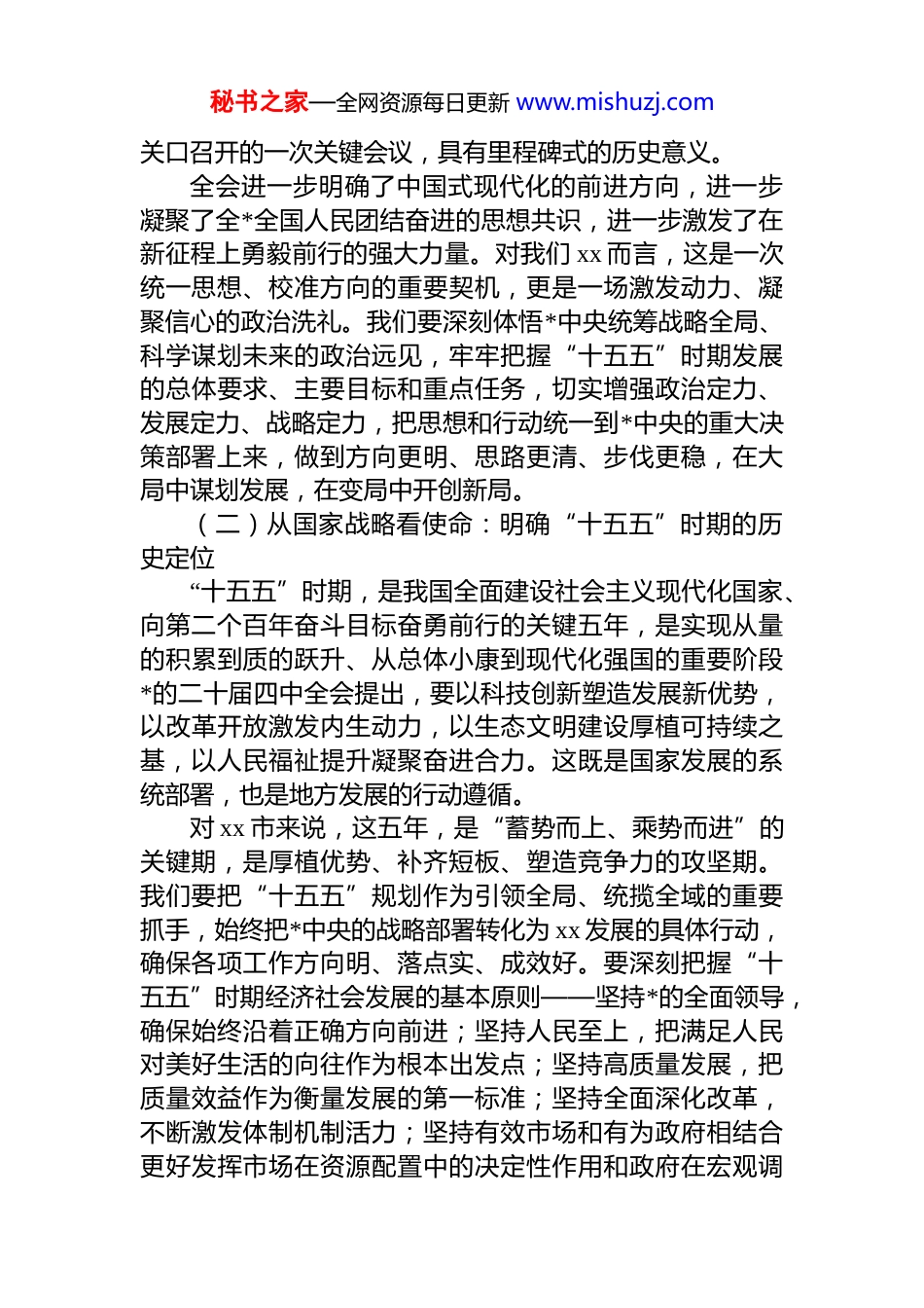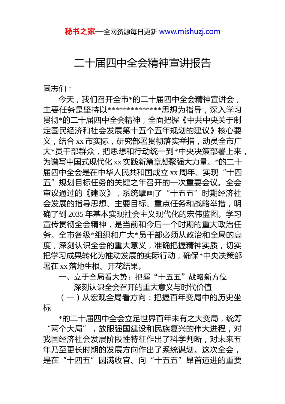 秘书之家—全网资源每日更新 www.mishuzj.com二十届四中全会精神宣讲报告同志们:今天,我们召开全市*的二十届四中全会精神宣讲会,主要任务是坚持以**************思想为指导,深入学习贯彻*的二十届四中全会精神,全面把握《中共中央关于制定国民经济和社会发展第十五个五年规划的建议》核心要义,结合 xx 市实际,研究部署贯彻落实举措,动员全市广大*员干部群众,把思想和行动统一到*中央决策部署上来,为谱写中国式现代化 xx 实践新篇章凝聚强大力量。*的二十届四中全会是在中华人民共和国成立 xx 周年、实现“十四五”规划目标任务的关键之年召开的一次重要会议。全会审议通过的《建议》,系统擘画了“十五五”时期经济社会发展的指导思想、主要目标、重点任务和战略举措,明确了到 2035 年基本实现社会主义现代化的宏伟蓝图。学习宣传贯彻全会精神,是当前和今后一个时期的重大政治任务。全市各级*组织和广大*员干部必须从政治和全局的高度,深刻认识全会的重大意义,准确把握精神实质,切实把学习成果转化为推动发展的实际行动,确保*中央决策部署在 xx 落地生根、开花结果。一、立于全局看大势:把握“十五五”战略新方位——深刻认识全会召开的重大意义与时代价值(一)从宏观全局看方向:把握百年变局中的历史坐标*的二十届四中全会立足世界百年未有之大变局,统筹“两个大局”,放眼强国建设和民族复兴的伟大进程,对我国经济社会发展阶段性特征作出了科学判断,对未来五年乃至更长时期的发展方向作出了系统谋划。这次全会,是在“十四五”圆满收官、向“十五五”昂首迈进的重要秘书之家—全网资源每日更新 www.mishuzj.com关口召开的一次关键会议,具有里程碑式的历史意义。全会进一步明确了中国式现代化的前进方向,进一步凝聚了全*全国人民团结奋进的思想共识,进一步激发了在新征程上勇毅前行的强大力量。对我们 xx 而言,这是一次统一思想、校准方向的重要契机,更是一场激发动力、凝聚信心的政治洗礼。我们要深刻体悟*中央统筹战略全局、科学谋划未来的政治远见,牢牢把握“十五五”时期发展的总体要求、主要目标和重点任务,切实增强政治定力、发展定力、战略定力,把思想和行动统一到*中央的重大决策部署上来,做到方向更明、思路更清、步伐更稳,在大局中谋划发展,在变局中开创新局。(二)从国家战略看使命:明确“十五五”时期的历史定位“十五五”时期,是我国全面建设社会主义现代化国家、向第二个百年奋斗目标奋勇前行的关键五年,是实现从量的积累到质的跃升、从总体小康到现代化强国的重要阶段*的二十届四中全会提出,要以科技创新塑造发展新优势,以改革开放激发内生动力,以生态文明建设厚植可持续之基,以人民福祉提升凝聚奋进合力。这既是国家发展的系统部署,也是地方发展的行动遵循。对 xx 市来说,这五年,是“蓄势而上、乘势而进”的关键期,是厚植优势、补齐短板、塑造竞争力的攻坚期。我们要把“十五五”规划作为引领全局、统揽全域的重要抓手,始终把*中央的战略部署转化为 xx 发展的具体行动,确保各项工作方向明、落点实、成效好。要深刻把握“十五五”时期经济社会发展的基本原则——坚持*的全面领导,确保始终沿着正确方向前进;坚持人民至上,把满足人民对美好生活的向往作为根本出发点;坚持高质量发展,把质量效益作为衡量发展的第一标准;坚持全面深化改革,不断激发体制机制活力;坚持有效市场和有为政府相结合更好发挥市场在资源配置中的决定性作用和政府在宏观调秘书之家—全网资源每日更新 www.mishuzj.com控中的积极作用;坚持统筹发展和安全,统筹推进高质量发展与高水平安全的良性互动。这“六个坚持”,是推动中国式现代化的根本遵循,也是我们推进 xx 高质量发展的行动指南。我们要在学习中深化理解、在谋划中贯通衔接、在落实中见行见效,真正把全会精神转化为推动发展的强大动力,让中国式现代化在 xx 大地上展现更加生动的时代图景。(三)从地方实践看路径:找准 xx 在国家格局中的责任担当全会绘制的是国家蓝图,落实的是地方实践。对于 xx而言,贯彻落实全会精神,既要有融入全国的格局...