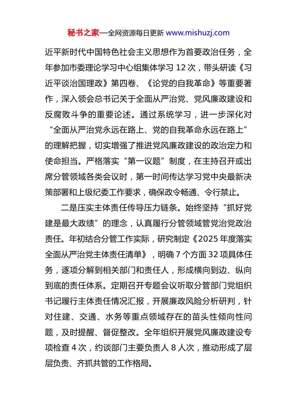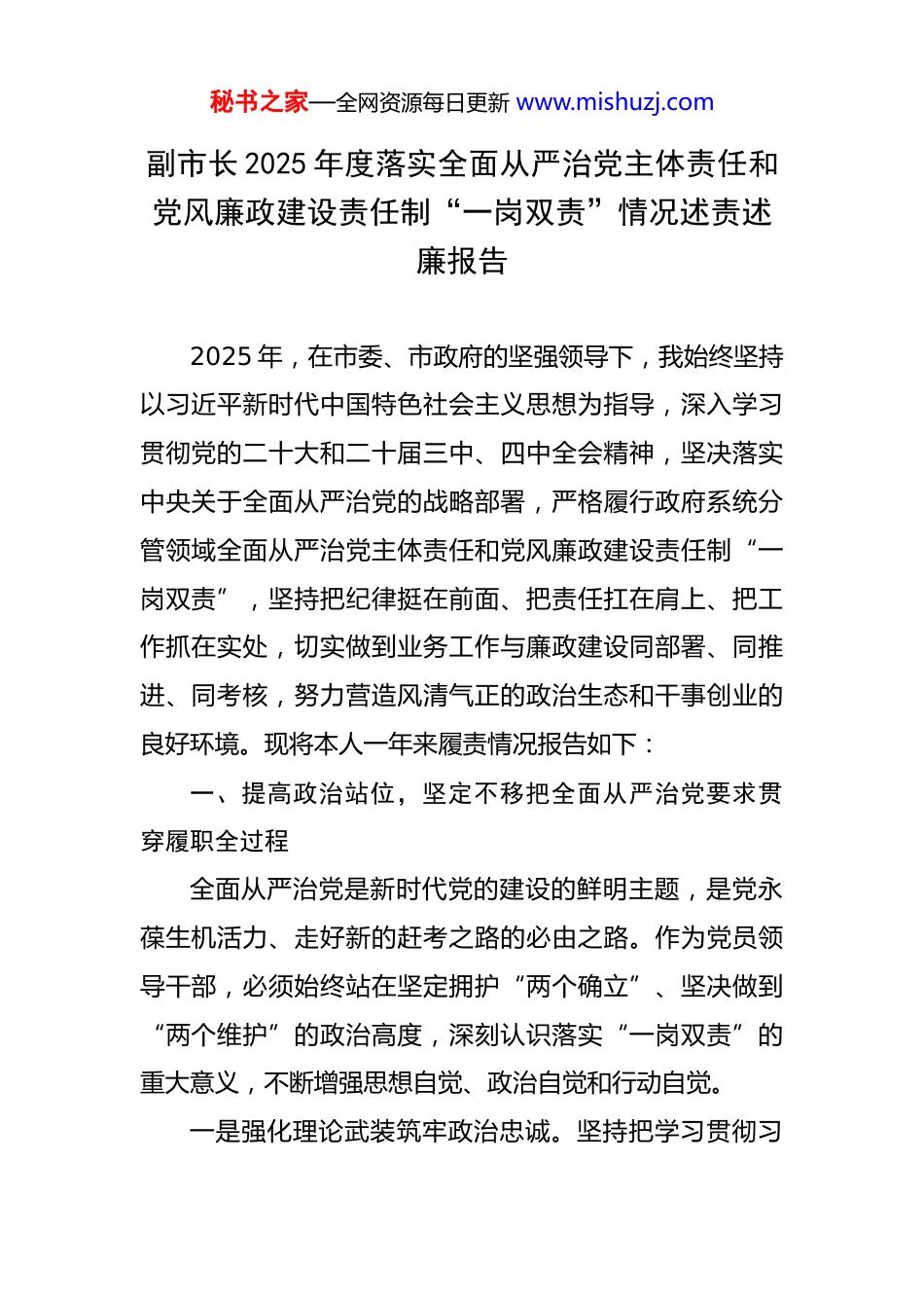 秘书之家—全网资源每日更新 www.mishuzj.com副市长 2025 年度落实全面从严治党主体责任和党风廉政建设责任制“一岗双责”情况述责述廉报告 2025 年,在市委、市政府的坚强领导下,我始终坚持以习近平新时代中国特色社会主义思想为指导,深入学习贯彻党的二十大和二十届三中、四中全会精神,坚决落实中央关于全面从严治党的战略部署,严格履行政府系统分管领域全面从严治党主体责任和党风廉政建设责任制“一岗双责”,坚持把纪律挺在前面、把责任扛在肩上、把工作抓在实处,切实做到业务工作与廉政建设同部署、同推进、同考核,努力营造风清气正的政治生态和干事创业的良好环境。现将本人一年来履责情况报告如下:一、提高政治站位,坚定不移把全面从严治党要求贯穿履职全过程全面从严治党是新时代党的建设的鲜明主题,是党永葆生机活力、走好新的赶考之路的必由之路。作为党员领导干部,必须始终站在坚定拥护“两个确立”、坚决做到“两个维护”的政治高度,深刻认识落实“一岗双责”的重大意义,不断增强思想自觉、政治自觉和行动自觉。一是强化理论武装筑牢政治忠诚。坚持把学习贯彻习秘书之家—全网资源每日更新 www.mishuzj.com近平新时代中国特色社会主义思想作为首要政治任务,全年参加市委理论学习中心组集体学习 12 次,带头研读《习近平谈治国理政》第四卷、《论党的自我革命》等重要著作,深入领会总书记关于全面从严治党、党风廉政建设和反腐败斗争的重要论述。通过系统学习,进一步深化对“全面从严治党永远在路上、党的自我革命永远在路上”的理解把握,切实增强了推进党风廉政建设的政治定力和使命担当。严格落实“第一议题”制度,在主持召开或出席分管领域各类会议时,第一时间传达学习党中央最新决策部署和上级纪委工作要求,确保政令畅通、令行禁止。二是压实主体责任传导压力链条。始终坚持“抓好党建是最大政绩”的理念,认真履行分管领域管党治党政治责任。年初结合分管工作实际,研究制定《2025 年度落实全面从严治党主体责任清单》,明确 7 个方面 32 项具体任务,逐项分解到相关部门和责任人,形成横向到边、纵向到底的责任体系。定期召开专题会议听取分管部门党组织书记履行主体责任情况汇报,开展廉政风险分析研判,针对住建、交通、水务等重点领域存在的苗头性倾向性问题,及时提醒、督促整改。全年组织开展党风廉政建设专项检查 4 次,约谈部门主要负责人 8 人次,推动形成了层层负责、齐抓共管的工作格局。秘书之家—全网资源每日更新 www.mishuzj.com三是严明政治纪律维护大局稳定。始终把遵守政治纪律和政治规矩摆在首位,教育引导分管领域党员干部增强政治敏锐性和政治鉴别力,在重大原则问题上立场坚定、旗帜鲜明。严格执行请示报告制度,涉及重大事项决策、重大项目安排、大额资金使用等问题,均按规定程序报批,确保各项工作始终在法治轨道和组织框架内运行。加强对意识形态工作的领导,定期分析研判舆情动态,牢牢掌握工作主动权。在巡视巡察反馈问题整改工作中,主动认领涉及分管领域的 16 项整改任务,建立台账、挂图作战,目前已全部完成整改并形成长效机制。二、聚焦重点领域,精准发力提升廉政风险防控实效党风廉政建设重在日常、贵在经常。一年来,我坚持问题导向,紧盯权力集中、资金密集、资源富集的关键环节,持续加强监督管理,着力堵塞制度漏洞,不断提升廉政风险防控的针对性和有效性。(一)加强工程建设领域监管,规范权力运行机制工程建设领域历来是腐败易发多发的重点区域。对此,我坚持从制度建设入手,推动构建全流程闭环管理体系。严格执行《政府投资项目管理办法》,全面落实项目立项、招投标、施工管理、竣工验收等各环节审批制度,坚决杜绝“未批先建”“边批边建”现象。大力推进电子秘书之家—全网资源每日更新 www.mishuzj.com化招投标平台应用,实现全流程网上操作、全过程留痕可溯,有效防范围标串标行为。2025 年,全市政府投资工程项目在线招标率达 98.6%,较上年提升 3.2 个百分点。健全工程变更管理制度,明确变更审批权限和程序,严控随意追加投资行为。对总投资超亿元的重大项目...