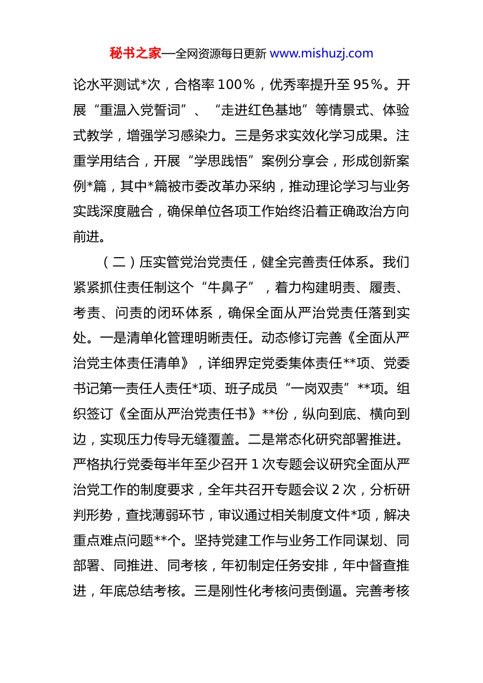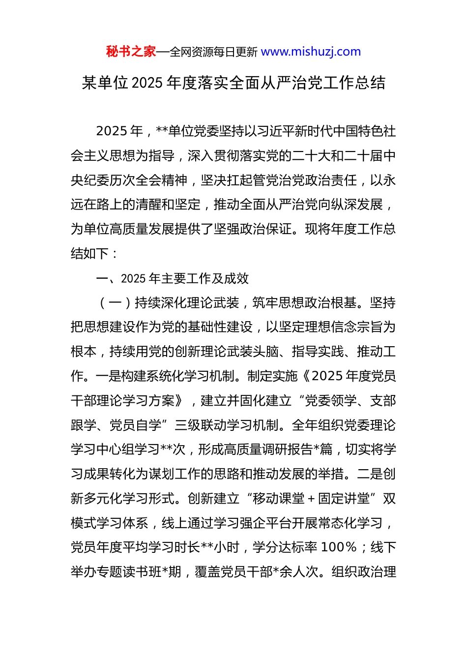秘书之家—全网资源每日更新 www.mishuzj.com某单位 2025 年度落实全面从严治党工作总结 2025 年,**单位党委坚持以习近平新时代中国特色社会主义思想为指导,深入贯彻落实党的二十大和二十届中央纪委历次全会精神,坚决扛起管党治党政治责任,以永远在路上的清醒和坚定,推动全面从严治党向纵深发展,为单位高质量发展提供了坚强政治保证。现将年度工作总结如下:一、2025 年主要工作及成效(一)持续深化理论武装,筑牢思想政治根基。坚持把思想建设作为党的基础性建设,以坚定理想信念宗旨为根本,持续用党的创新理论武装头脑、指导实践、推动工作。一是构建系统化学习机制。制定实施《2025 年度党员干部理论学习方案》,建立并固化建立“党委领学、支部跟学、党员自学”三级联动学习机制。全年组织党委理论学习中心组学习**次,形成高质量调研报告*篇,切实将学习成果转化为谋划工作的思路和推动发展的举措。二是创新多元化学习形式。创新建立“移动课堂+固定讲堂”双模式学习体系,线上通过学习强企平台开展常态化学习,党员年度平均学习时长**小时,学分达标率 100%;线下举办专题读书班*期,覆盖党员干部*余人次。组织政治理秘书之家—全网资源每日更新 www.mishuzj.com论水平测试*次,合格率 100%,优秀率提升至 95%。开展“重温入党誓词”、“走进红色基地”等情景式、体验式教学,增强学习感染力。三是务求实效化学习成果。注重学用结合,开展“学思践悟”案例分享会,形成创新案例*篇,其中*篇被市委改革办采纳,推动理论学习与业务实践深度融合,确保单位各项工作始终沿着正确政治方向前进。(二)压实管党治党责任,健全完善责任体系。我们紧紧抓住责任制这个“牛鼻子”,着力构建明责、履责、考责、问责的闭环体系,确保全面从严治党责任落到实处。一是清单化管理明晰责任。动态修订完善《全面从严治党主体责任清单》,详细界定党委集体责任**项、党委书记第一责任人责任*项、班子成员“一岗双责”**项。组织签订《全面从严治党责任书》**份,纵向到底、横向到边,实现压力传导无缝覆盖。二是常态化研究部署推进。严格执行党委每半年至少召开 1 次专题会议研究全面从严治党工作的制度要求,全年共召开专题会议 2 次,分析研判形势,查找薄弱环节,审议通过相关制度文件*项,解决重点难点问题**个。坚持党建工作与业务工作同谋划、同部署、同推进、同考核,年初制定任务安排,年中督查推进,年底总结考核。三是刚性化考核问责倒逼。完善考核秘书之家—全网资源每日更新 www.mishuzj.com评价体系,将全面从严治党工作成效在年度绩效考核中的权重提升至不低于**%,考核结果与领导班子评价、干部选拔任用、评优评先直接挂钩。严肃开展基层党组织书记抓党建述职评议考核,**名书记现场接受评议。对履职不力的*个基层党组织和*名责任人进行通报批评和约谈,彰显失责必问、问责必严的鲜明导向。(三)严肃党内政治生活,净化优化政治生态。把党的政治建设摆在首位,从严肃党内政治生活抓起,不断营造风清气正、健康向上的良好政治生态。一是高标准开好民主生活会和组织生活会。严格按照要求,精心组织年度民主生活会和支部组织生活会。会前广泛征求意见建议***条,深入开展谈心谈话;会上严肃认真开展批评与自我批评,直面问题,查摆出各类问题**项;会后制定详细整改措施**条,建立台账,明确时限,逐项销号。二是严要求强化日常管理监督。加强对党员干部的常态化“政治体检”,全年开展覆盖全体党员的集中体检*次,发现并督促整改苗头性、倾向性问题**项。严格执行重大事项请示报告制度,全年向上级党组织规范报告重要事项**次。加强党内政治文化建设,开展“传承红色基因、弘扬优良作风”等主题活动*次,制作宣传视频、展板等,播放量、观看量达数万次。三是实举措夯实组织建设基础。贯彻落实秘书之家—全网资源每日更新 www.mishuzj.com新时代党的组织路线,坚持民主集中制。树立正确选人用人导向,突出政治标准,选拔任用忠诚干净担当的干部*人。加强党员教育管理,严格落实“三会一课”制度,提高组织生活质量。强化基层基础,保障党建工作经费...