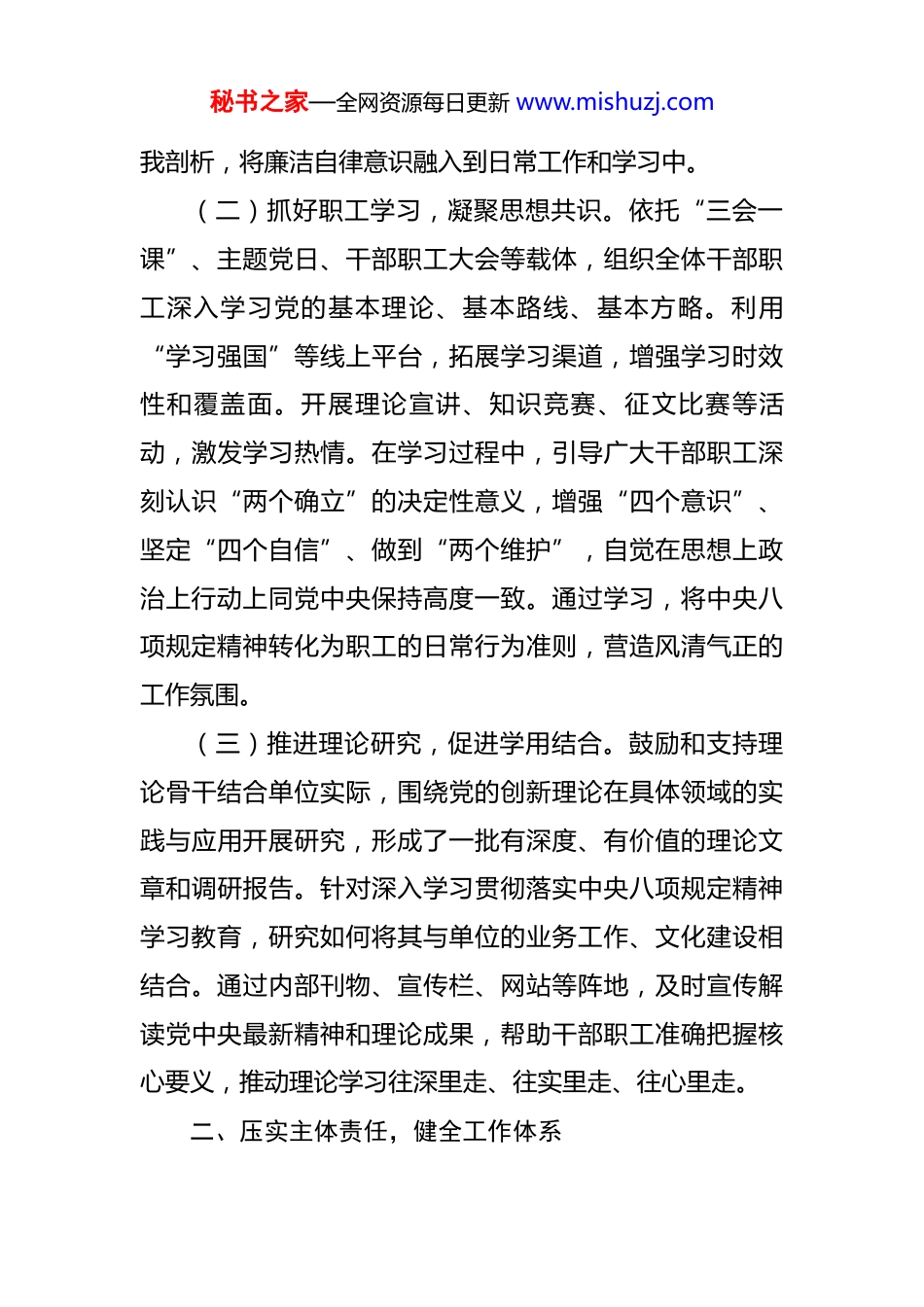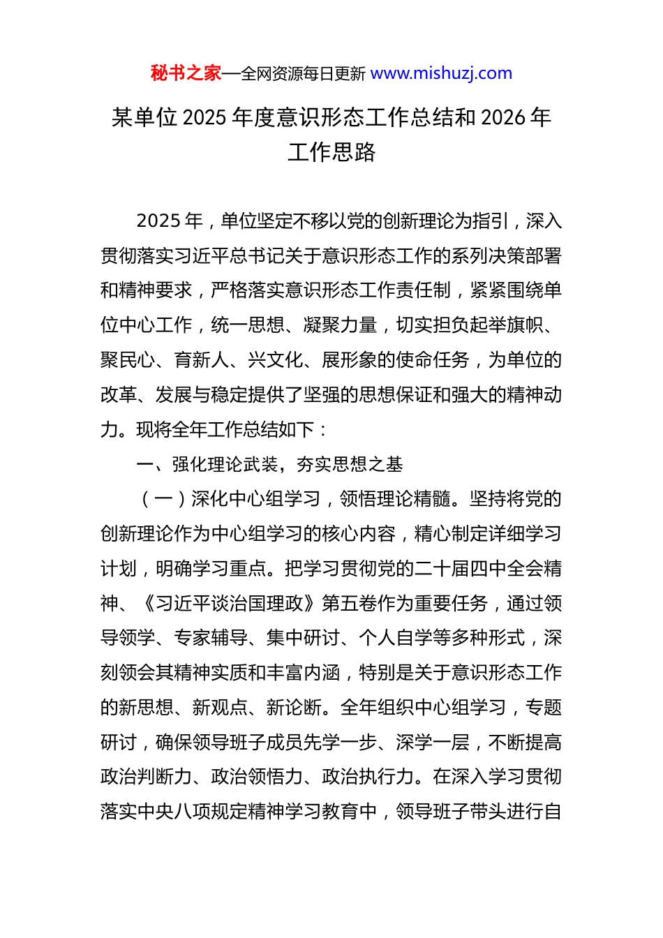 秘书之家—全网资源每日更新 www.mishuzj.com某单位 2025 年度意识形态工作总结和 2026 年工作思路 2025 年,单位坚定不移以党的创新理论为指引,深入贯彻落实习近平总书记关于意识形态工作的系列决策部署和精神要求,严格落实意识形态工作责任制,紧紧围绕单位中心工作,统一思想、凝聚力量,切实担负起举旗帜、聚民心、育新人、兴文化、展形象的使命任务,为单位的改革、发展与稳定提供了坚强的思想保证和强大的精神动力。现将全年工作总结如下:一、强化理论武装,夯实思想之基(一)深化中心组学习,领悟理论精髓。坚持将党的创新理论作为中心组学习的核心内容,精心制定详细学习计划,明确学习重点。把学习贯彻党的二十届四中全会精神、《习近平谈治国理政》第五卷作为重要任务,通过领导领学、专家辅导、集中研讨、个人自学等多种形式,深刻领会其精神实质和丰富内涵,特别是关于意识形态工作的新思想、新观点、新论断。全年组织中心组学习,专题研讨,确保领导班子成员先学一步、深学一层,不断提高政治判断力、政治领悟力、政治执行力。在深入学习贯彻落实中央八项规定精神学习教育中,领导班子带头进行自秘书之家—全网资源每日更新 www.mishuzj.com我剖析,将廉洁自律意识融入到日常工作和学习中。(二)抓好职工学习,凝聚思想共识。依托“三会一课”、主题党日、干部职工大会等载体,组织全体干部职工深入学习党的基本理论、基本路线、基本方略。利用“学习强国”等线上平台,拓展学习渠道,增强学习时效性和覆盖面。开展理论宣讲、知识竞赛、征文比赛等活动,激发学习热情。在学习过程中,引导广大干部职工深刻认识“两个确立”的决定性意义,增强“四个意识”、坚定“四个自信”、做到“两个维护”,自觉在思想上政治上行动上同党中央保持高度一致。通过学习,将中央八项规定精神转化为职工的日常行为准则,营造风清气正的工作氛围。(三)推进理论研究,促进学用结合。鼓励和支持理论骨干结合单位实际,围绕党的创新理论在具体领域的实践与应用开展研究,形成了一批有深度、有价值的理论文章和调研报告。针对深入学习贯彻落实中央八项规定精神学习教育,研究如何将其与单位的业务工作、文化建设相结合。通过内部刊物、宣传栏、网站等阵地,及时宣传解读党中央最新精神和理论成果,帮助干部职工准确把握核心要义,推动理论学习往深里走、往实里走、往心里走。二、压实主体责任,健全工作体系秘书之家—全网资源每日更新 www.mishuzj.com(一)加强组织领导,明确责任分工。单位党委(党组)切实履行主体责任,主要负责同志认真履行第一责任人职责,带头把方向、抓导向、管阵地、强队伍。领导班子其他成员根据工作分工,履行“一岗双责”,抓好分管领域的意识形态工作。年初召开专题会议,研究部署全年意识形态工作,明确目标任务和责任分工。定期分析研判意识形态领域形势,及时发现和解决苗头性、倾向性问题。在深入学习贯彻落实中央八项规定精神学习教育中,领导班子以身作则,严格要求自己,为职工树立榜样。(二)健全制度体系,完善工作机制。修订完善了《XX 单位意识形态工作责任制实施细则》《网络意识形态安全管理规定》等系列制度文件,进一步明确了责任主体、工作内容、考核标准和问责机制。建立了意识形态工作联席会议制度,定期沟通情况,协调解决问题,形成了党委统一领导、党政齐抓共管、宣传部门组织协调、有关部门分工负责的工作格局。同时,将中央八项规定精神纳入制度建设,确保在各项工作中得到贯彻落实。(三)严格督查考核,确保责任落实。将意识形态工作纳入领导班子、领导干部目标管理和年度考核的重要内容,与业务工作同部署、同落实、同检查、同考核。定期组织开展专项督查,对落实不力的部门和责任人进行约谈秘书之家—全网资源每日更新 www.mishuzj.com提醒,确保各项任务落到实处、见到实效。在督查过程中,重点检查中央八项规定精神的执行情况,对违规行为严肃处理。三、巩固主流舆论,营造良好氛围(一)做大主题宣传,展现单位风采。紧紧围绕新中国成立 76 周年、党的重要会议精神等重大主题和单位中心工作,精心策划宣...
